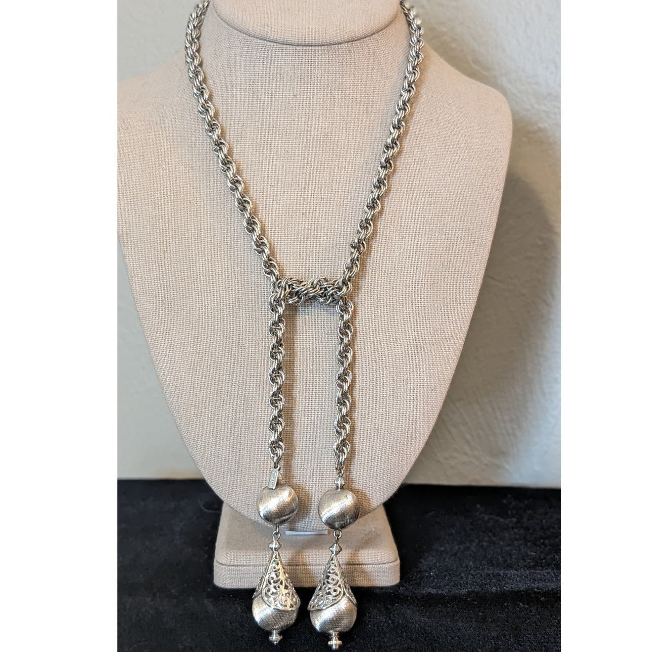 Rare Find! Monet 1961 Signed Monet Book Piece Rhodium Plated Lariat Necklace. Rhodium plated "Bolero" lariat necklace with textured ball and textured ball covered by a filigree section and small bead terminals. Marked 'Monet' on the hangtag. From Monet's 1961 Bolero line. 32" long in total. Each bauble section is 3". Textured chain. Overall great condition. Minor wear on connector pieces only. Noticeable upon close inspection. An identical necklace is shown on pg. 191 of Alice Vega's book "Monet" The Master Jewelers." Mid-Century Modern.