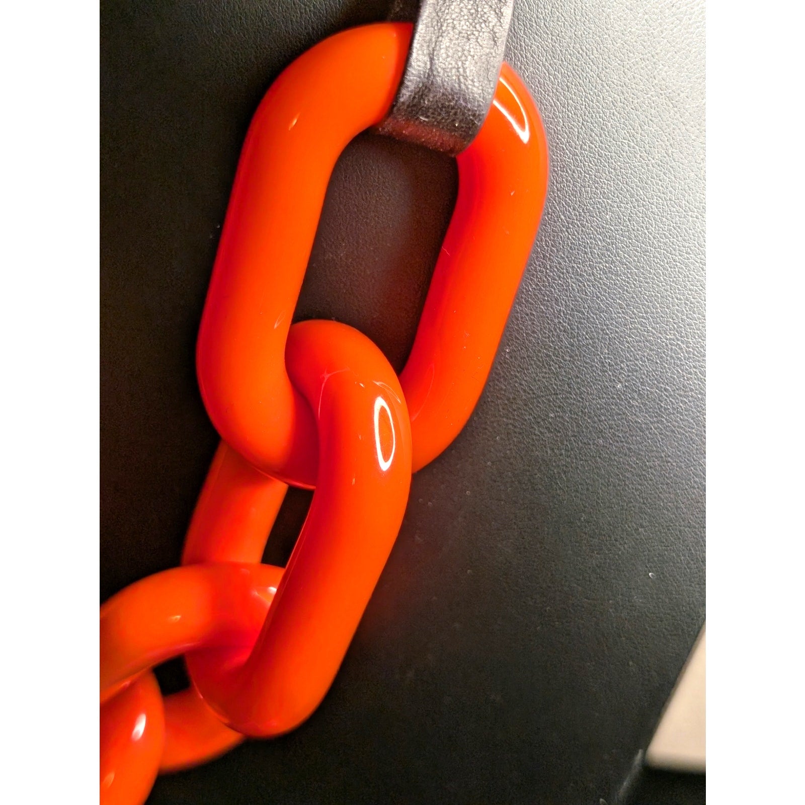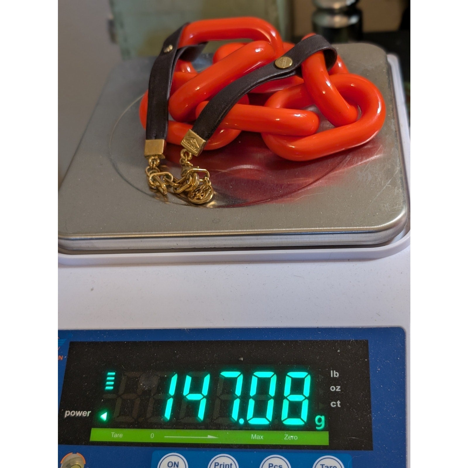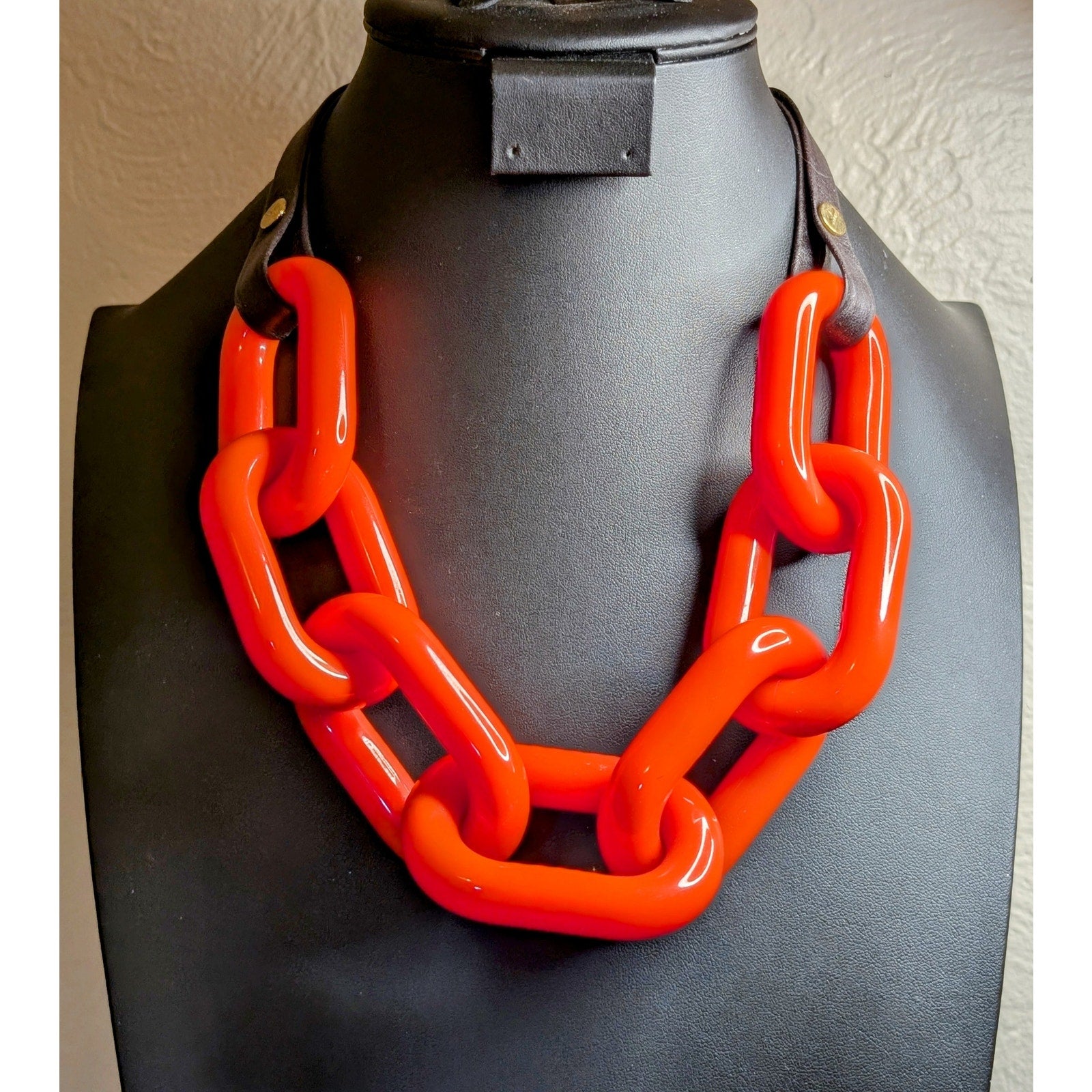 RARE Stamped BEN AMUN Orange Lucite Large Cuban Link Chain 22" Necklace. Ben-Amun is a luxury jewelry brand founded by Isaac Manevitz in 1980. The brand is known for its handcrafted, made-to-order pieces. Manevitz's designs are known for being bold, distinctive, and modern. Pre-owned, this necklace is in excellent condition.