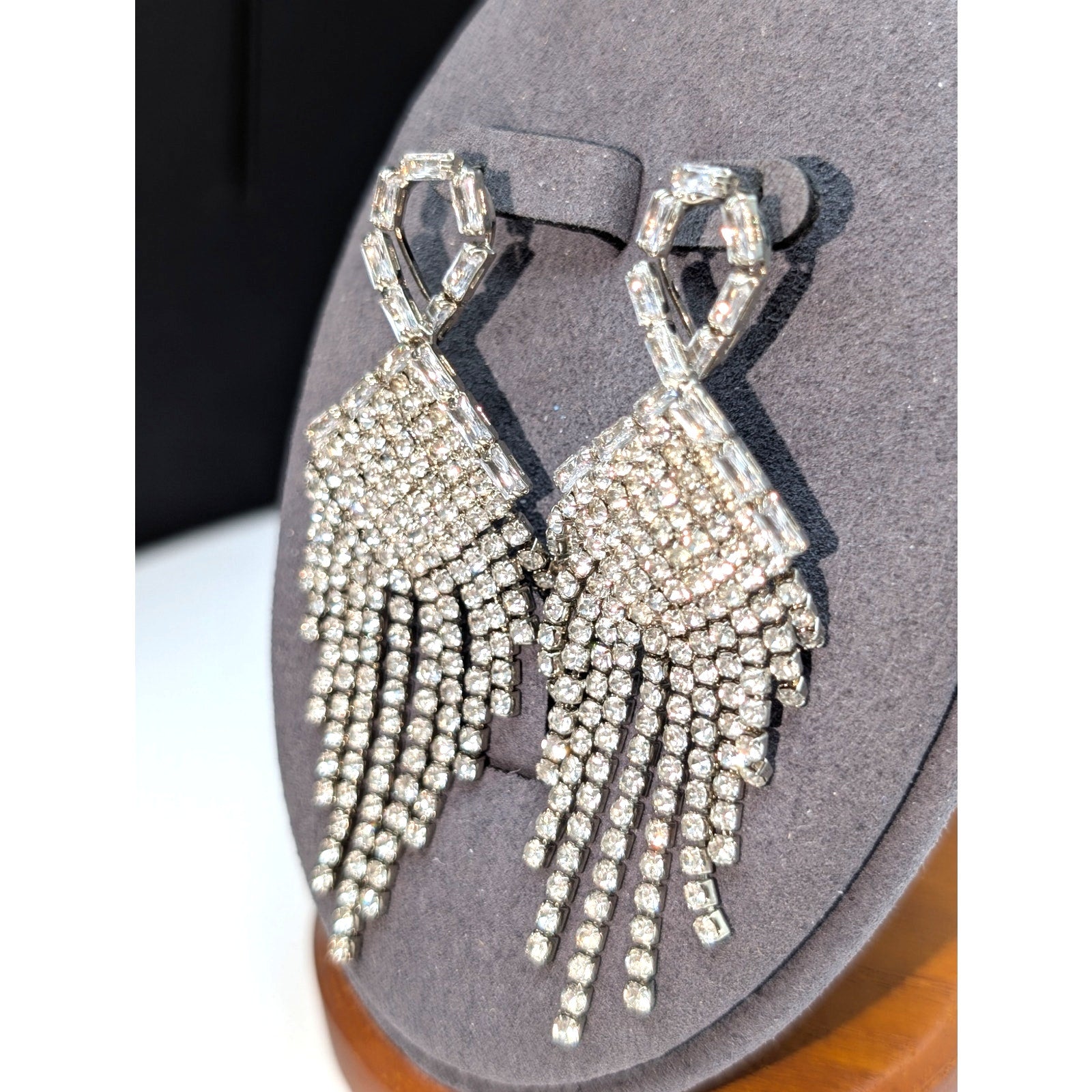Rhinestone Fringe Dangle Round & Baguette Pierced Earrings. Pre-owned, these earrings are in excellent condition.