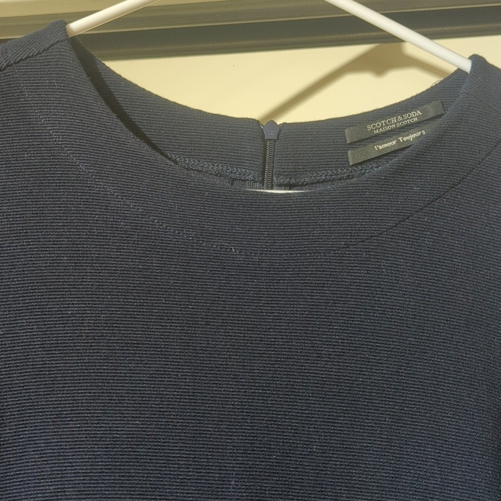 Scotch & Soda Maison Scotch L'amour Toujours Blue Ribbed Long Sleeve Flutter Hem Dress Women's Size S. Incredibly soft fabric. Back zip. Beautiful drape, round neckline, fitted style with a little flutter hem line. Construction is 86" viscose, 11% Nylon and 3% elastane. Armpit to armpit measures 16.5". Measures 34" long. Pre-owned, this dress is in excellent condition.