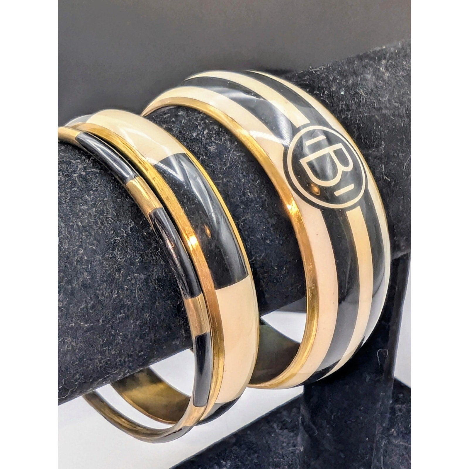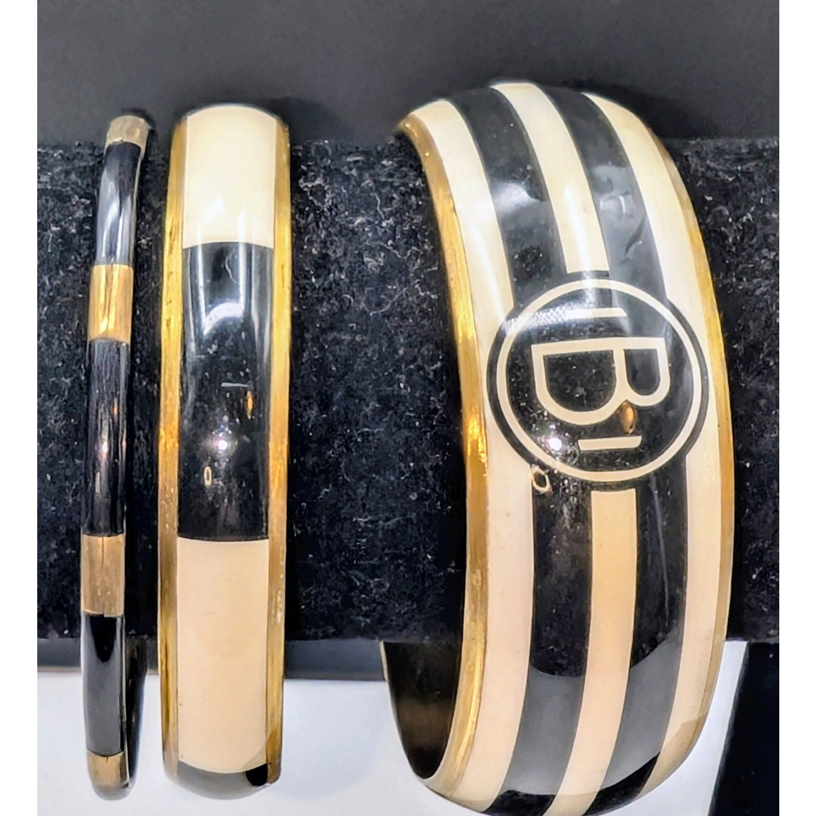 Set of Vintage Monogram 'B' Striped Black Cream Enamel Brass Bangle Bracelets