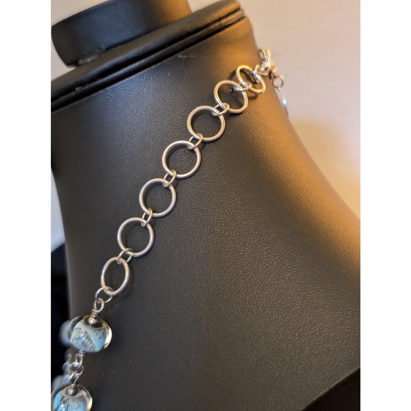Signed 'Moon' Turquoise Brown Cream Striped Lampwork Bead Sterling Chain Necklace. Pre-owned, this gorgeous glass bead sterling chain Y drop necklace is in excellent condition. Measures 27" long. Hook clasp. Hang tag says, 'Moon'.