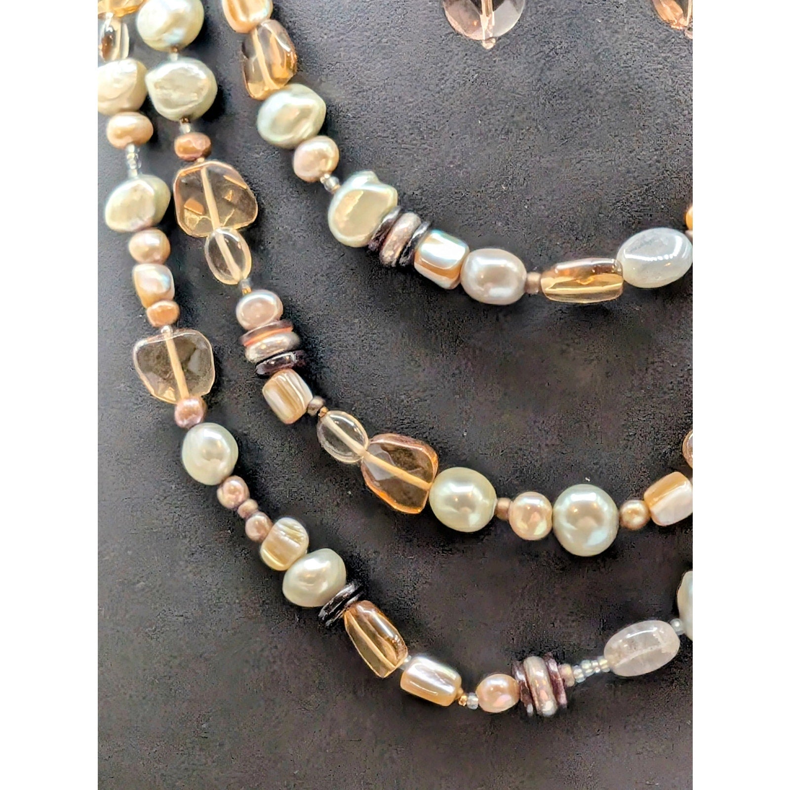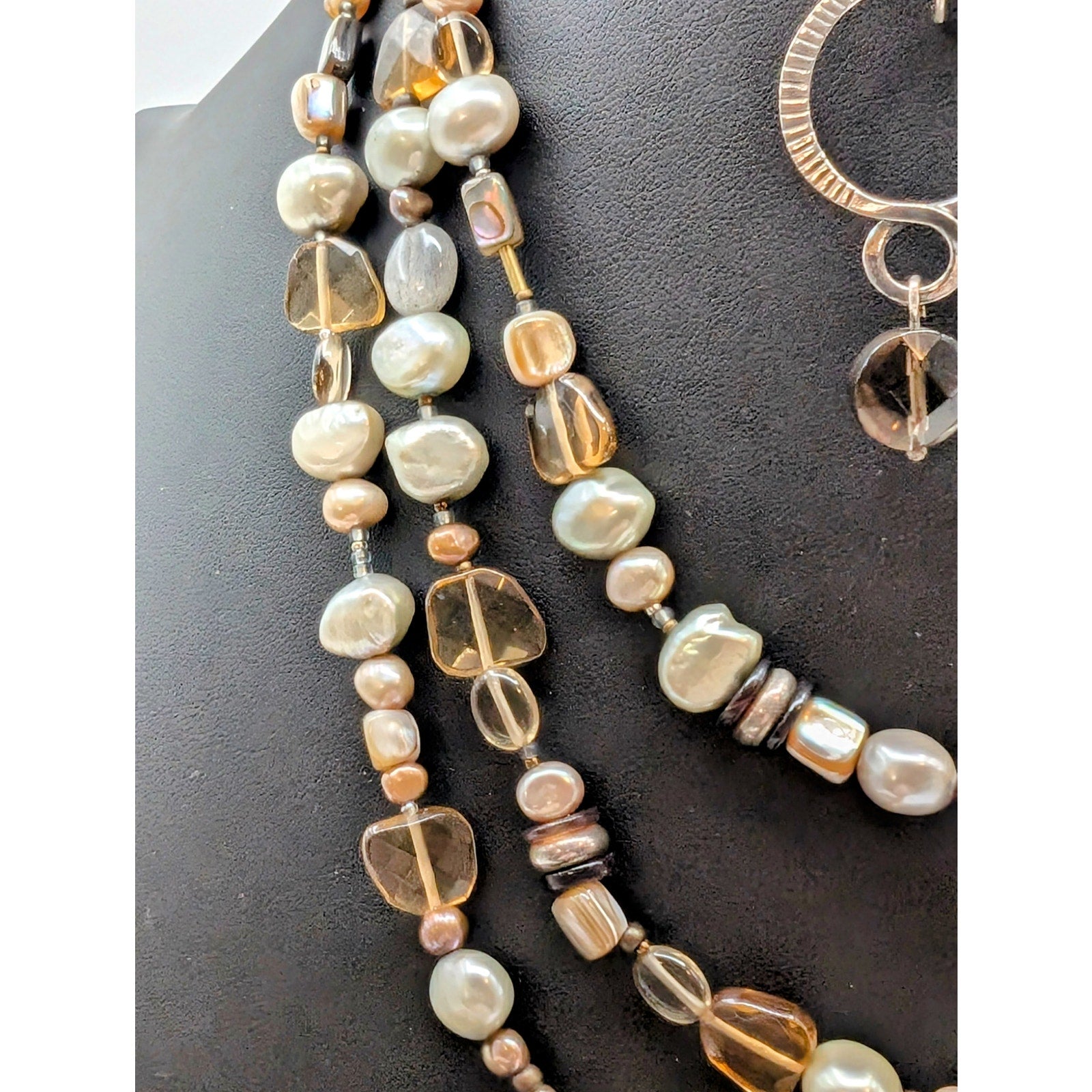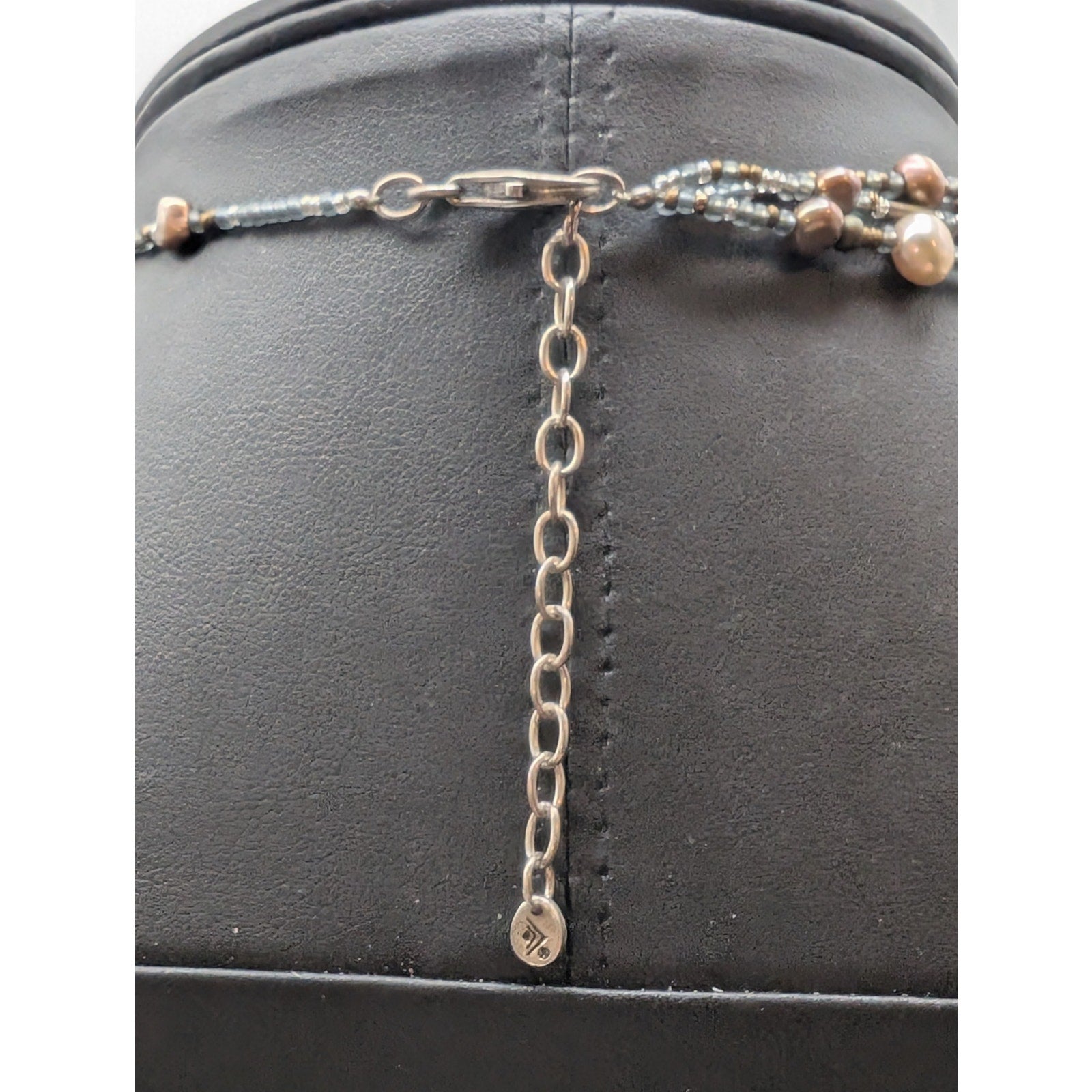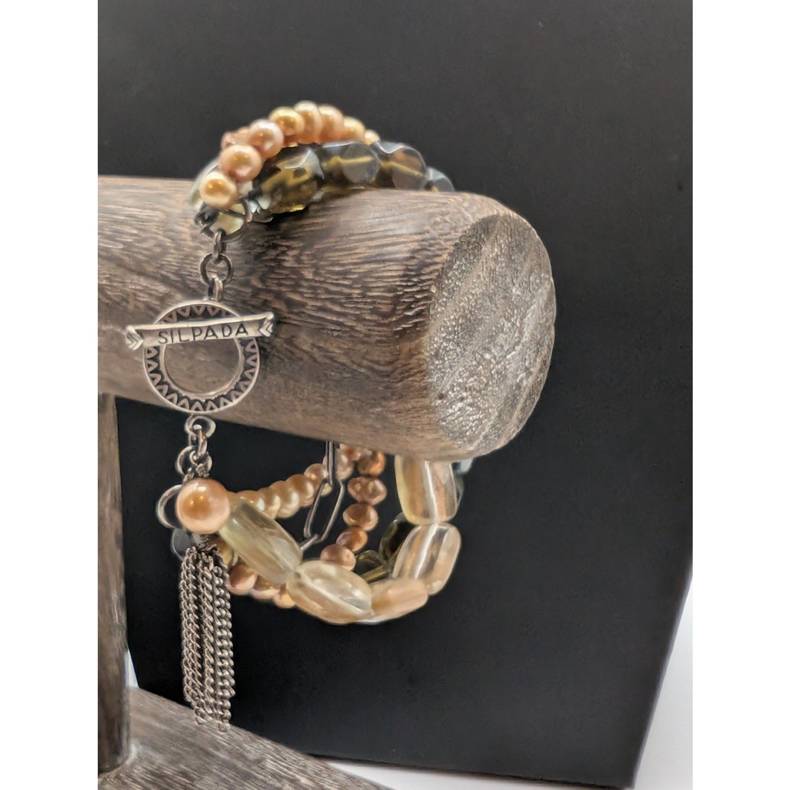 Silpada 925 Sterling Mixed Jewelry Set w/ Natural Stone and Beads 114.79g. Pre-owned, this jewelry set is in excellent condition. One into three strand 18"-20" necklace, multi-strand 8" bracelet with logo toggle clasp, and 2" dangling earrings.