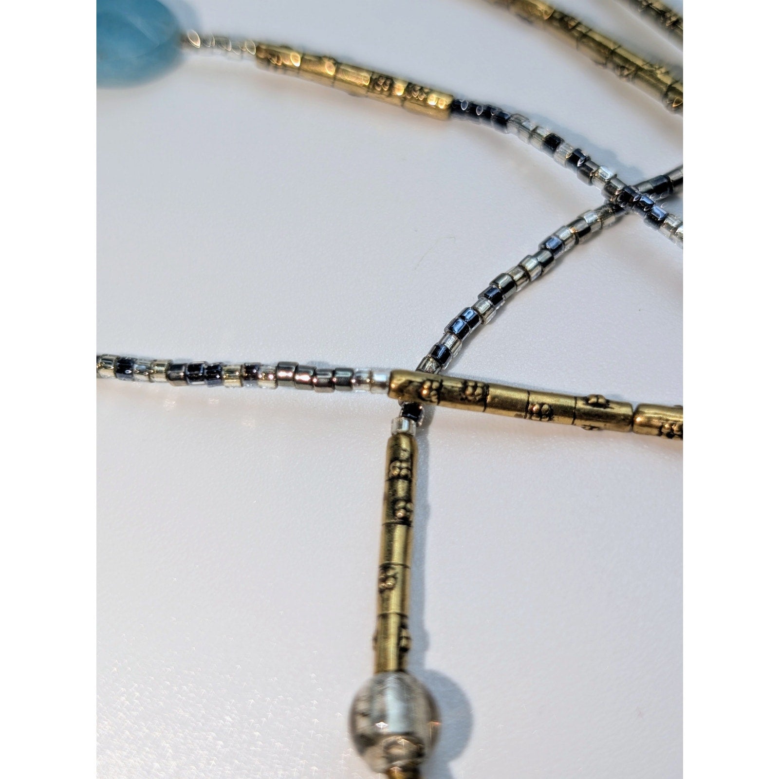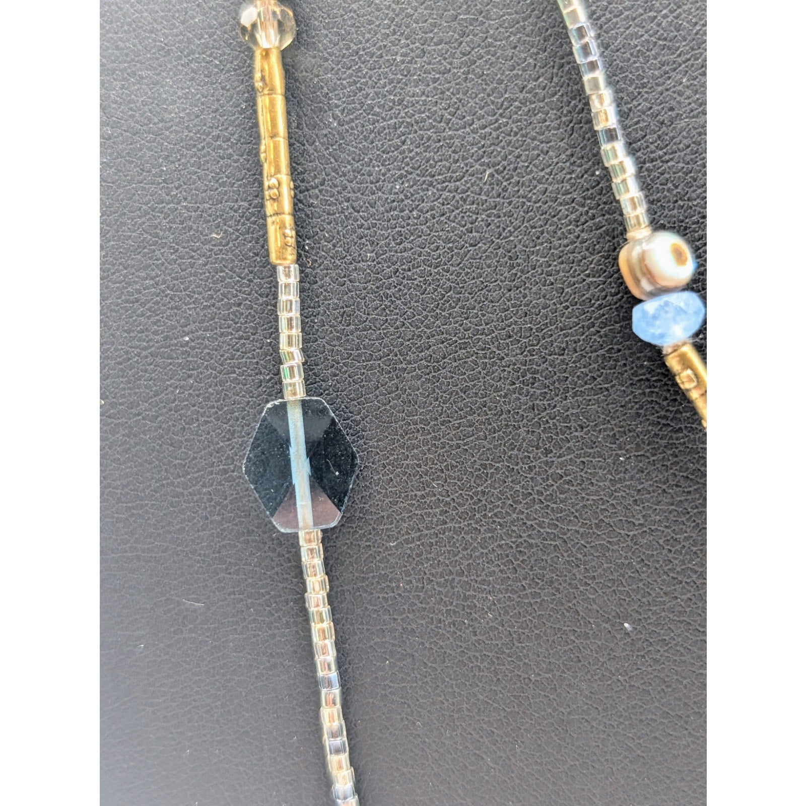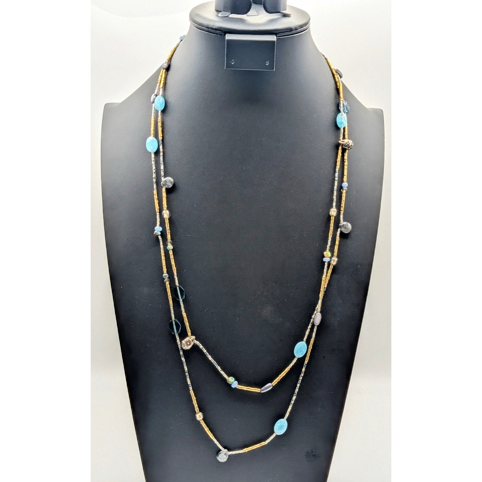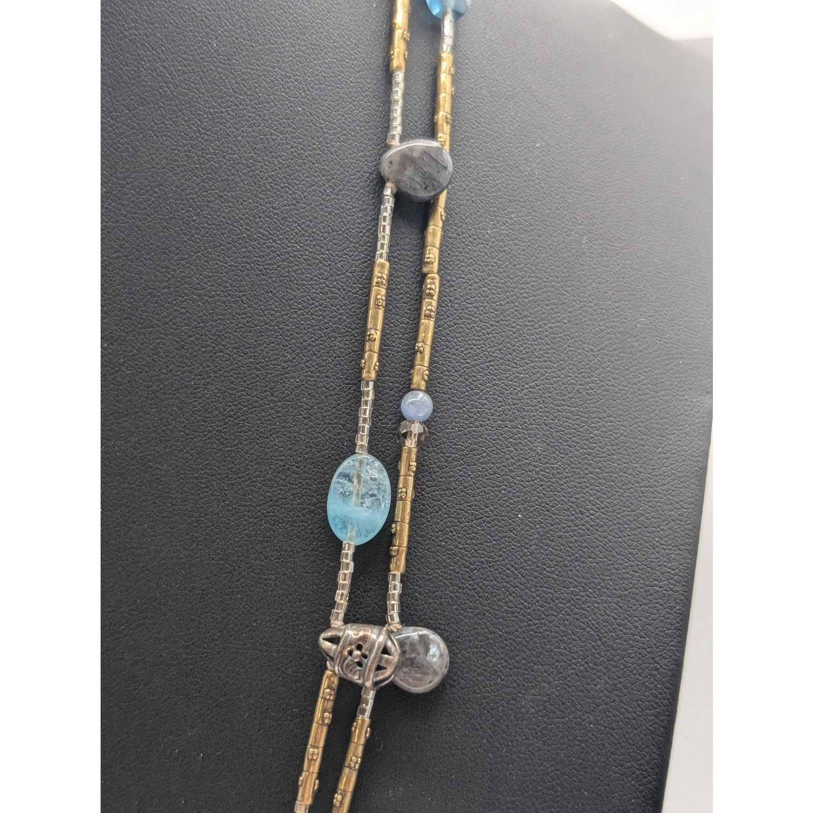 Silpada Sterling Silver Olivia Quartzite Shell Larvikite Kyanite Glass Brass 60" Necklace. Lobster claw clasp. 2013 Catalog. Pre-owned, this necklace is in excellent condition.