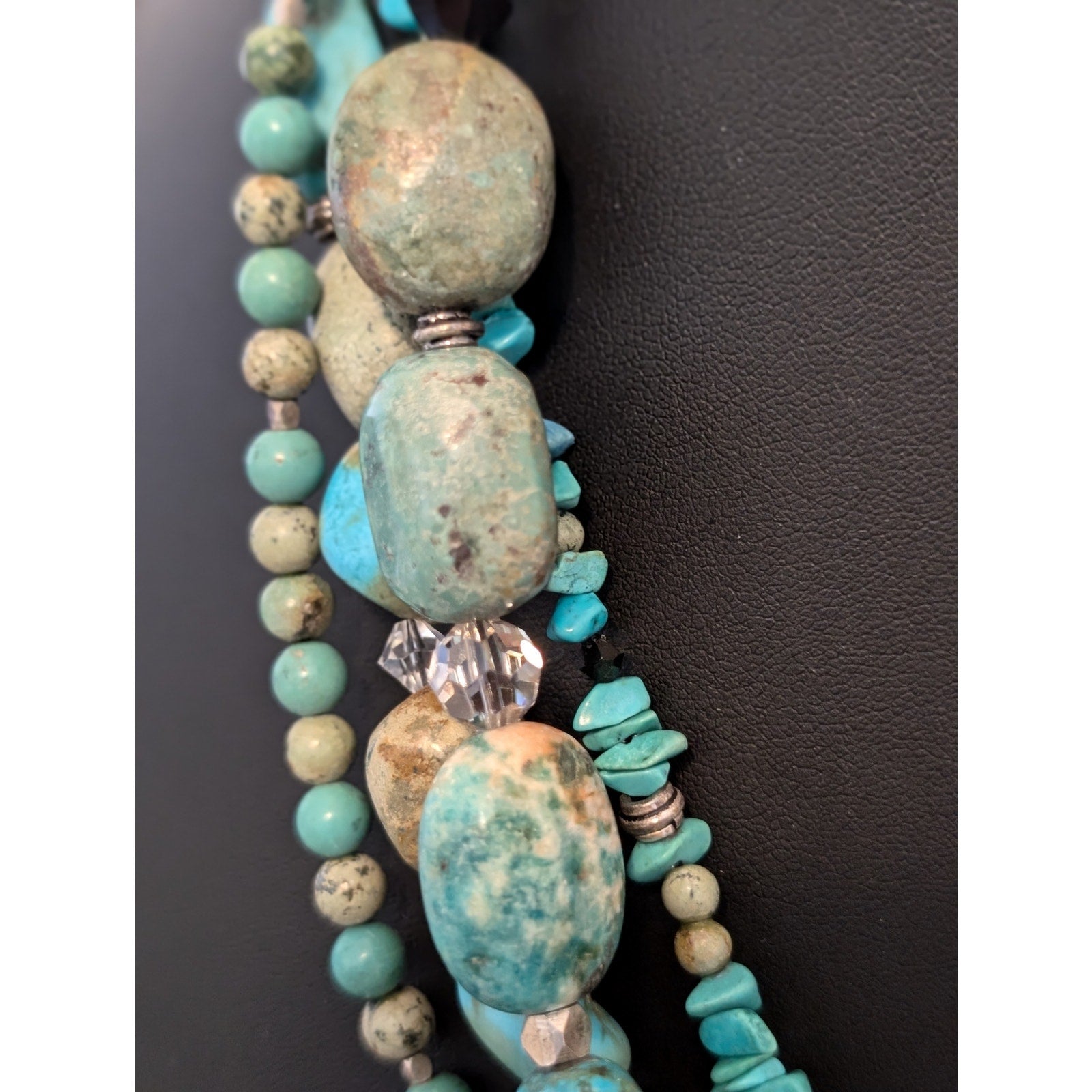 SILPADA Sterling Silver Turquoise Four-Strand Necklace. Pre-owned, this necklace is in excellent condition. It is missing its hang tag, but it is confirmed to be Silpada. From the catalog: "Selected for their varying color and shape, stabilized Turquoise, Obsidian, Glass and Sterling Silver beads form a four-strand necklace that flaunts individuality. 16" long with a 2" extender, turquoise bead accent and a lobster claw clasp."