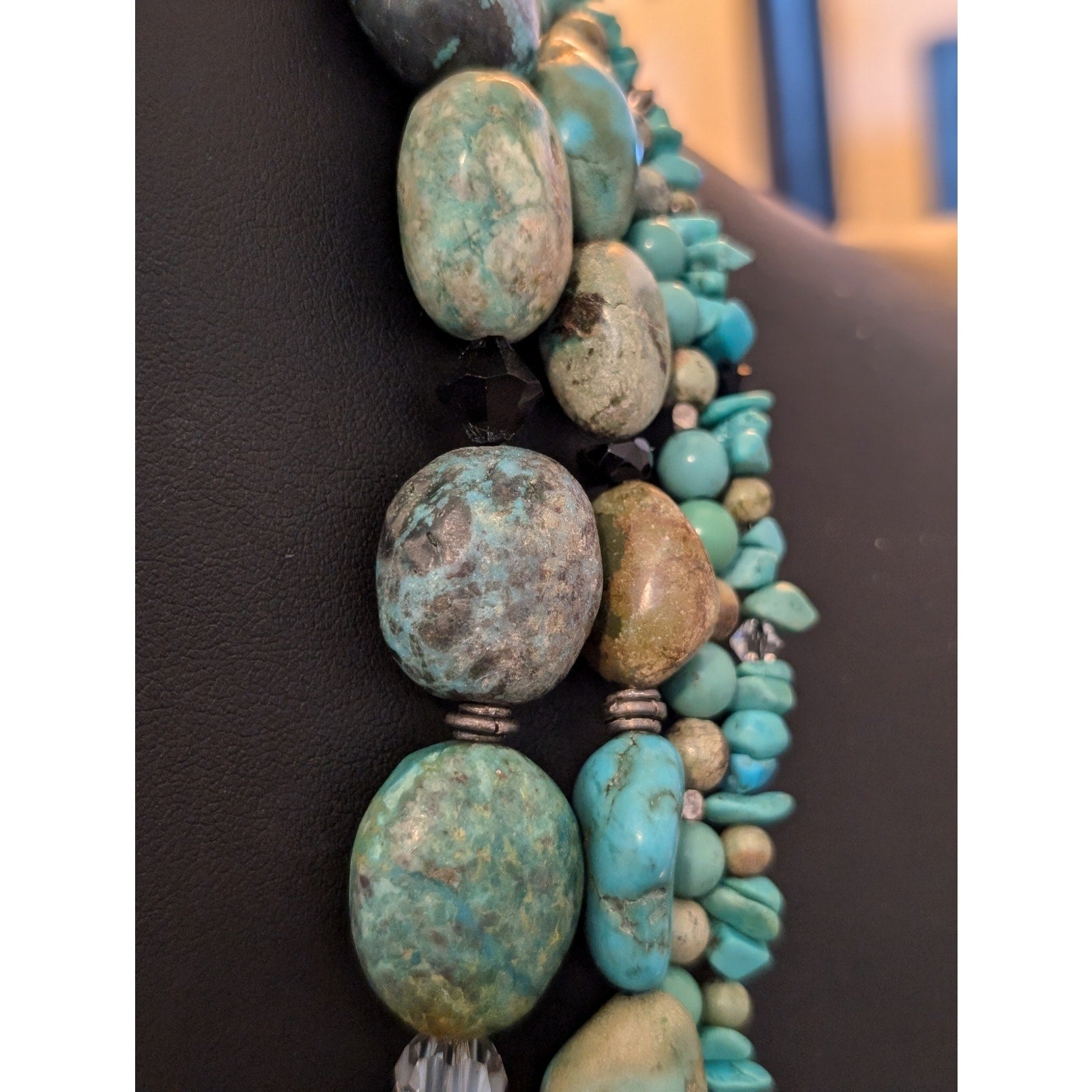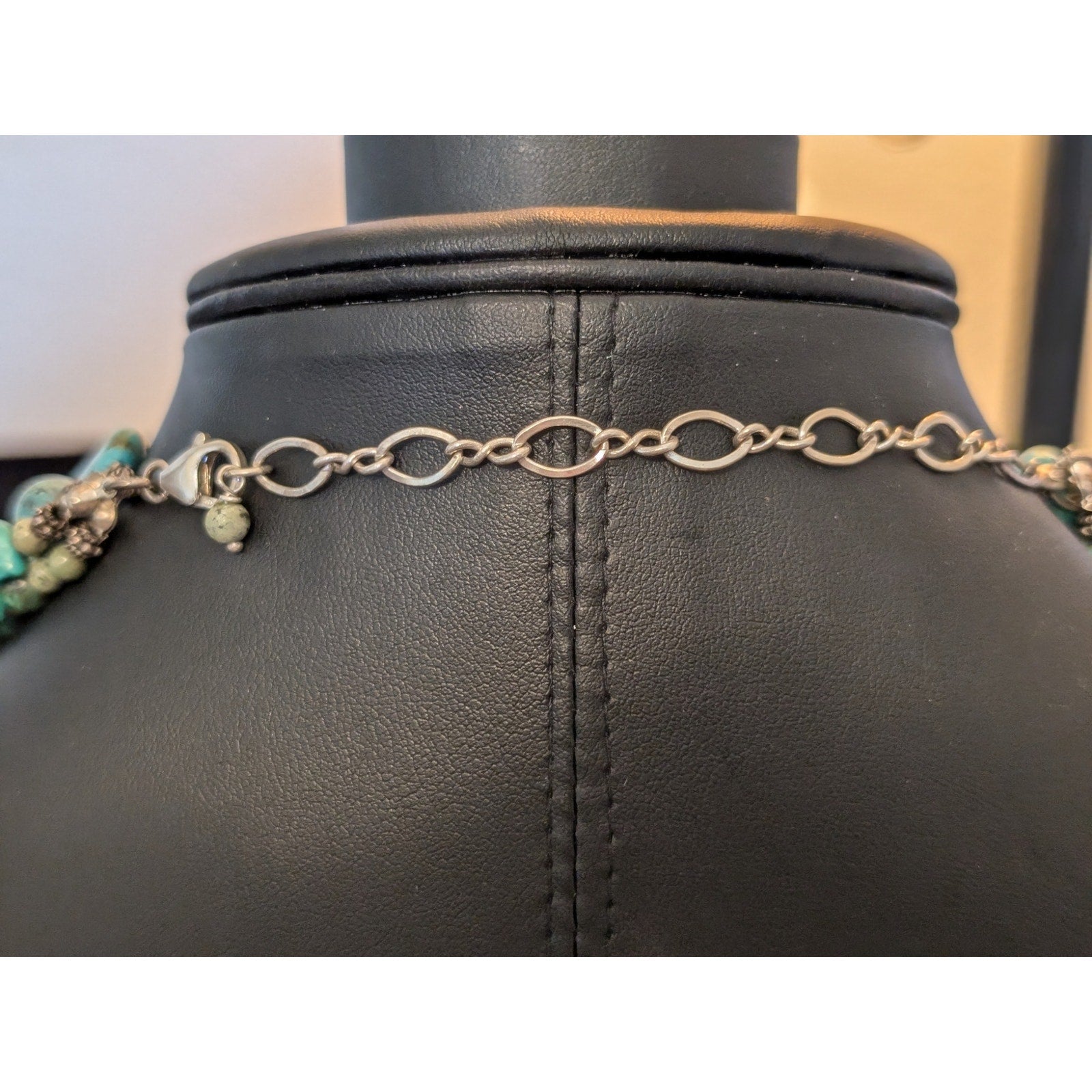 SILPADA Sterling Silver Turquoise Four-Strand Necklace. Pre-owned, this necklace is in excellent condition. It is missing its hang tag, but it is confirmed to be Silpada. From the catalog: "Selected for their varying color and shape, stabilized Turquoise, Obsidian, Glass and Sterling Silver beads form a four-strand necklace that flaunts individuality. 16" long with a 2" extender, turquoise bead accent and a lobster claw clasp."