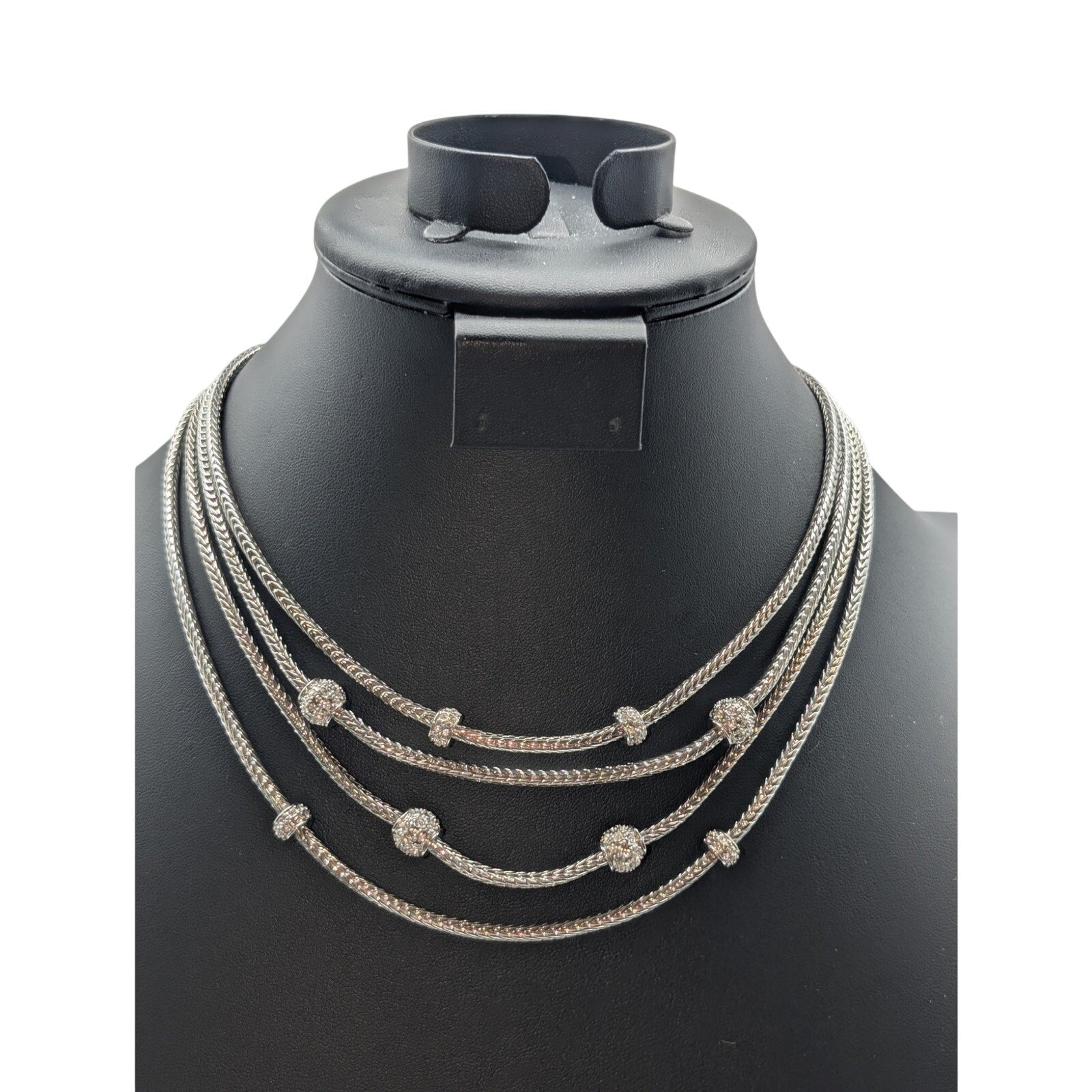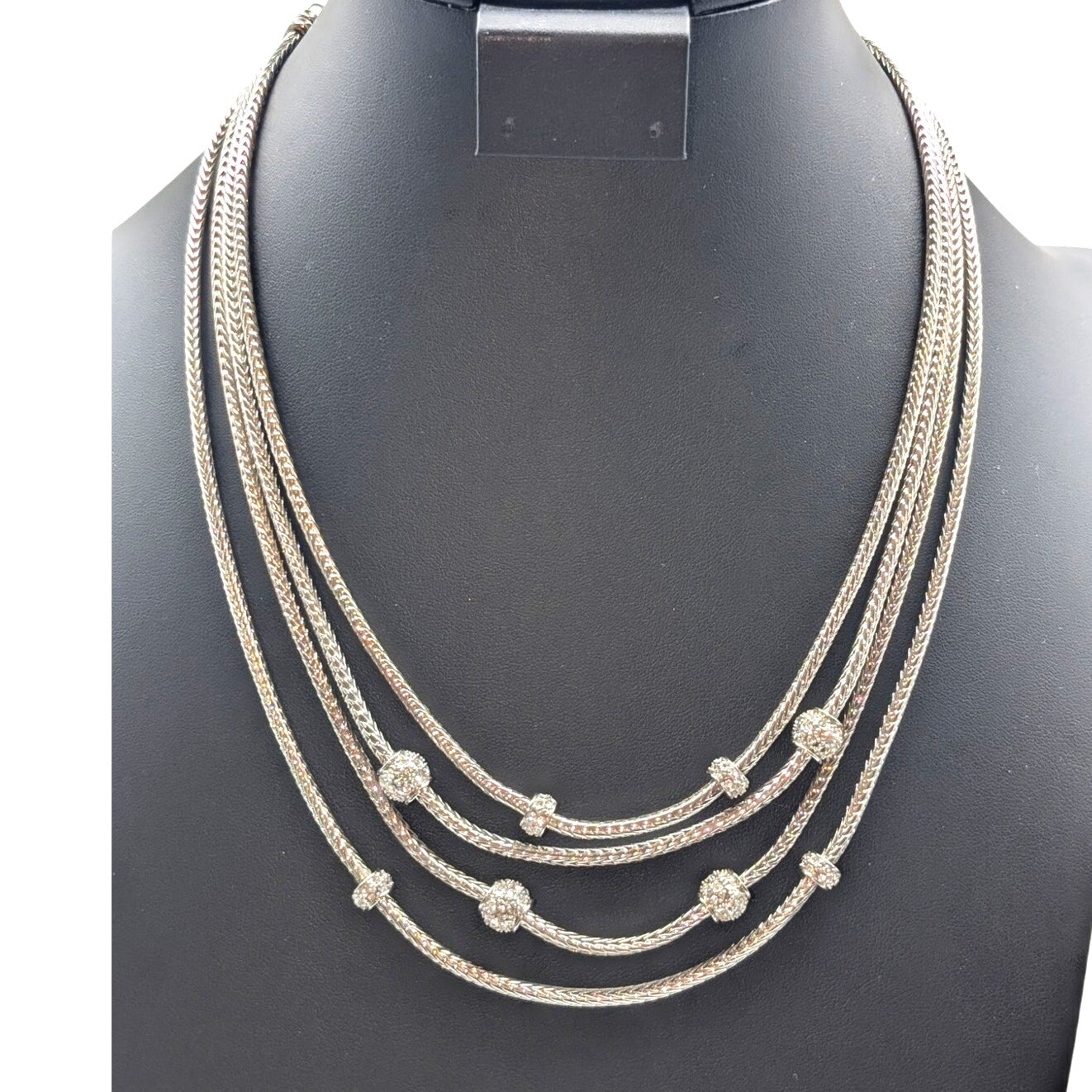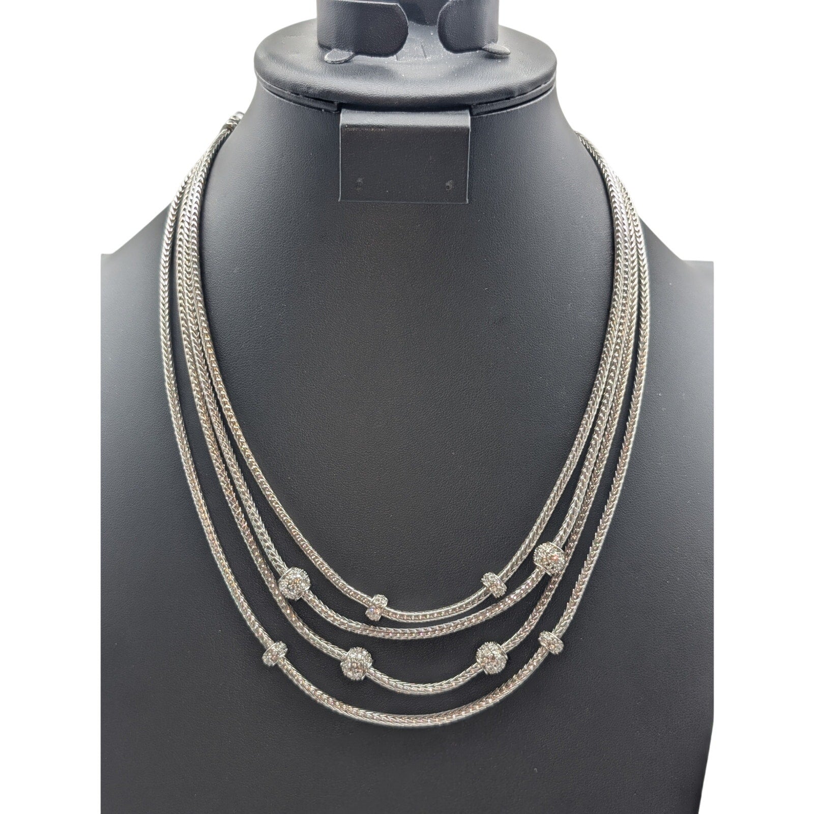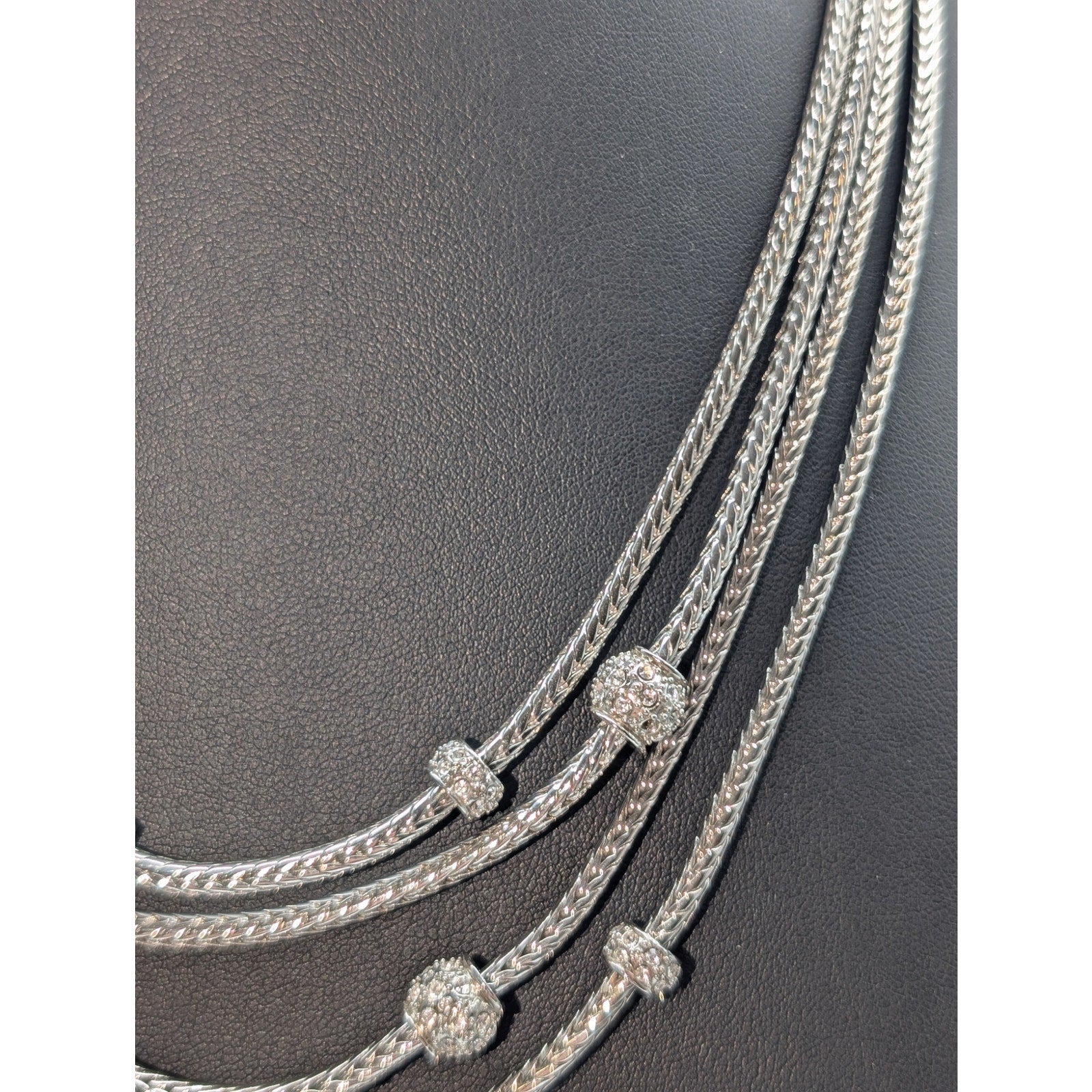 Silver Tone Well Made 4 Strand Wheat Chain Rhinestone Pave Bead Stations 16.5"-20" Necklace. This pre-owned necklace is in excellent condition.