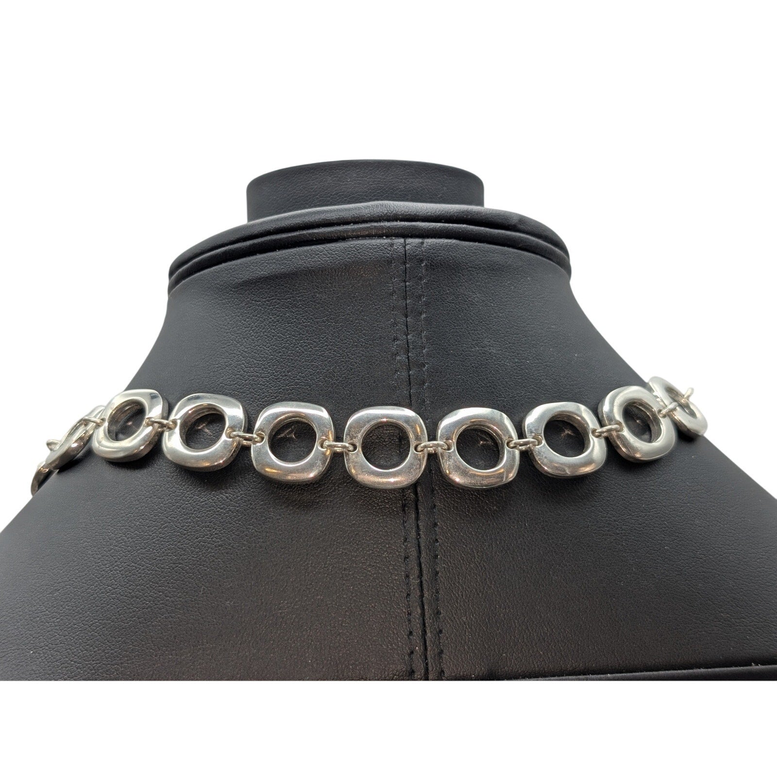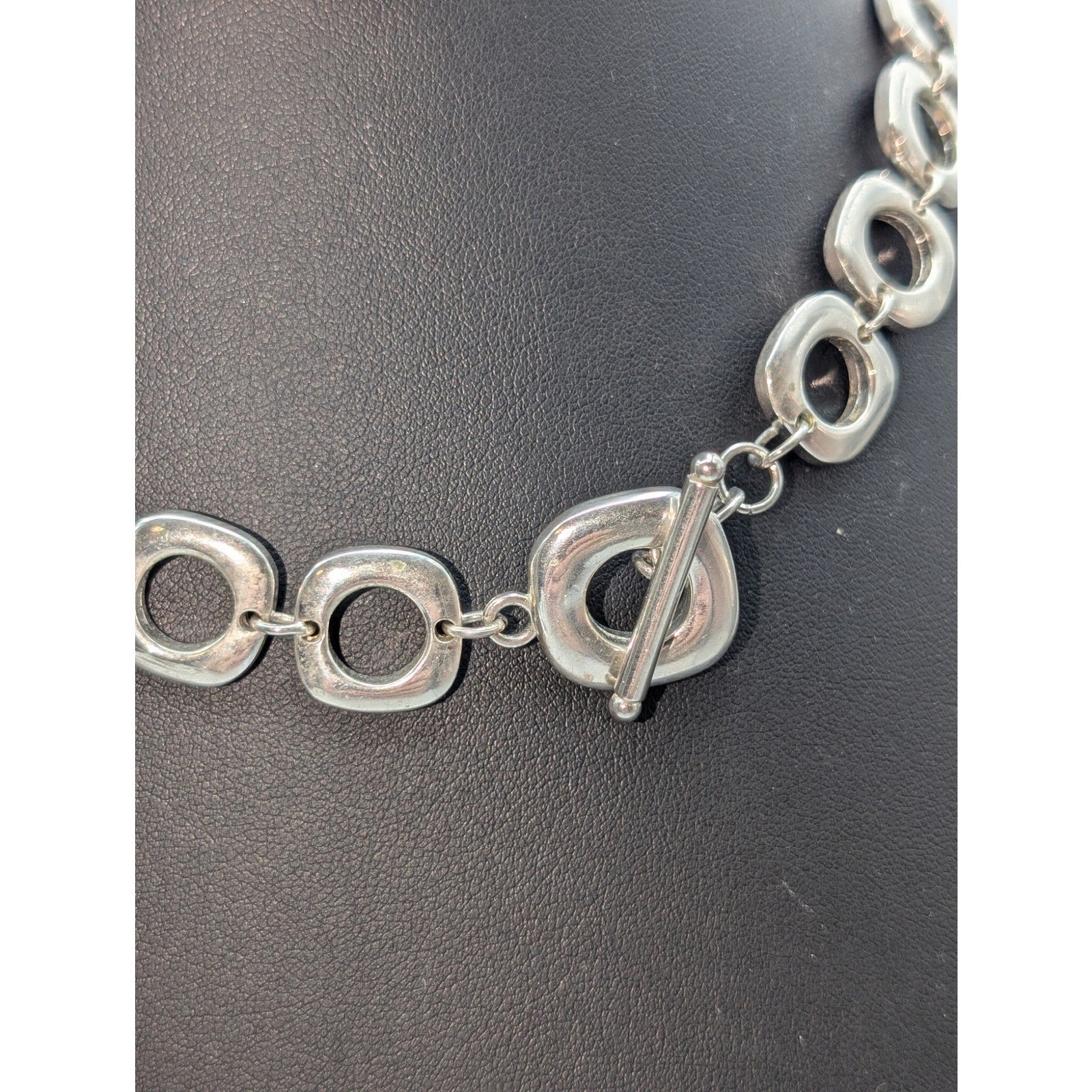 Silver Tone Chunky Squared Off Circle Chain Link Toggle Clasp 17.5" Necklace. End link is marked 925, but this doesn't test as sterling. Heavy necklace and well made. Pre-owned, this necklace is in excellent condition.