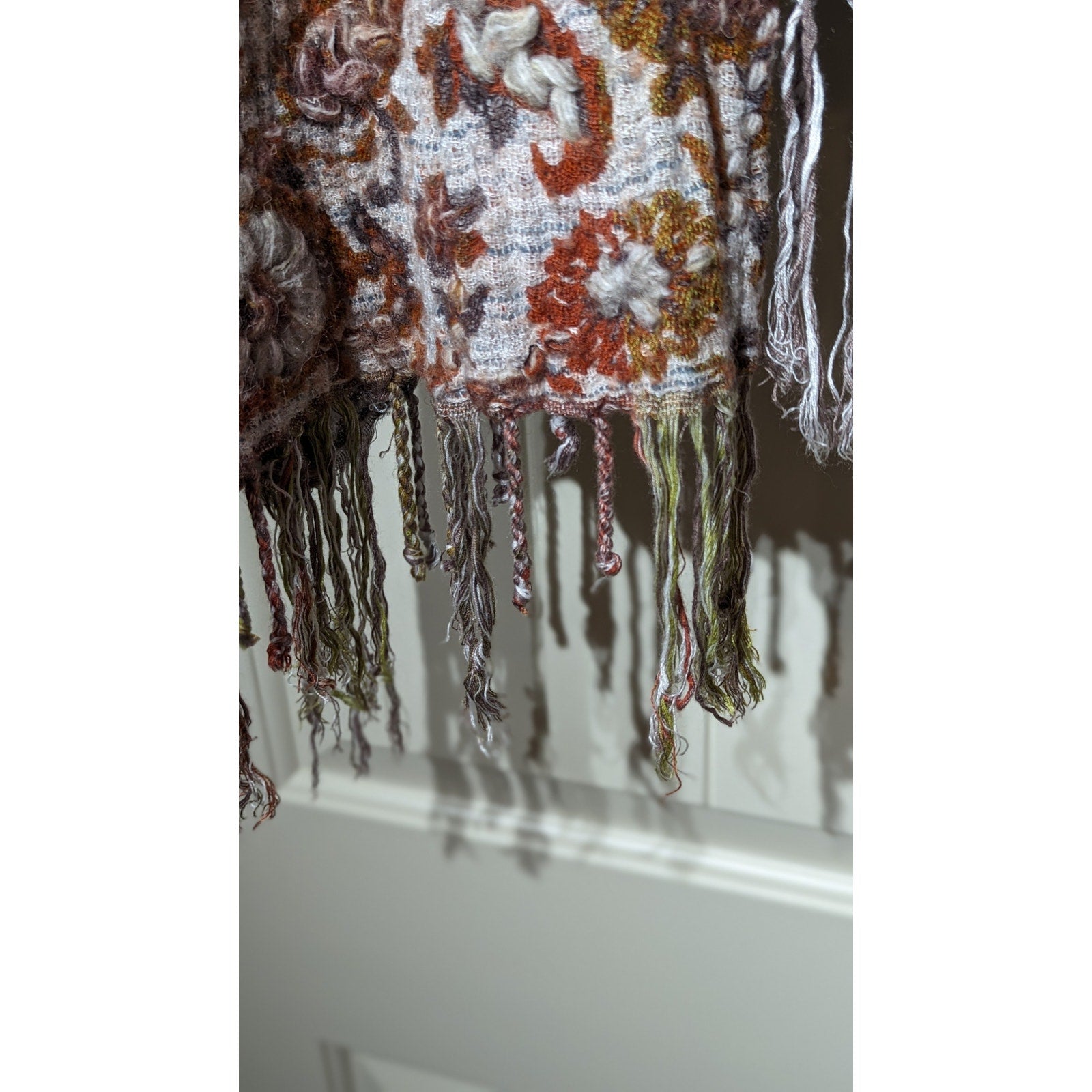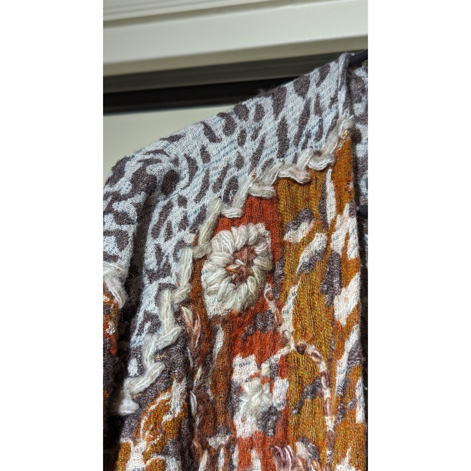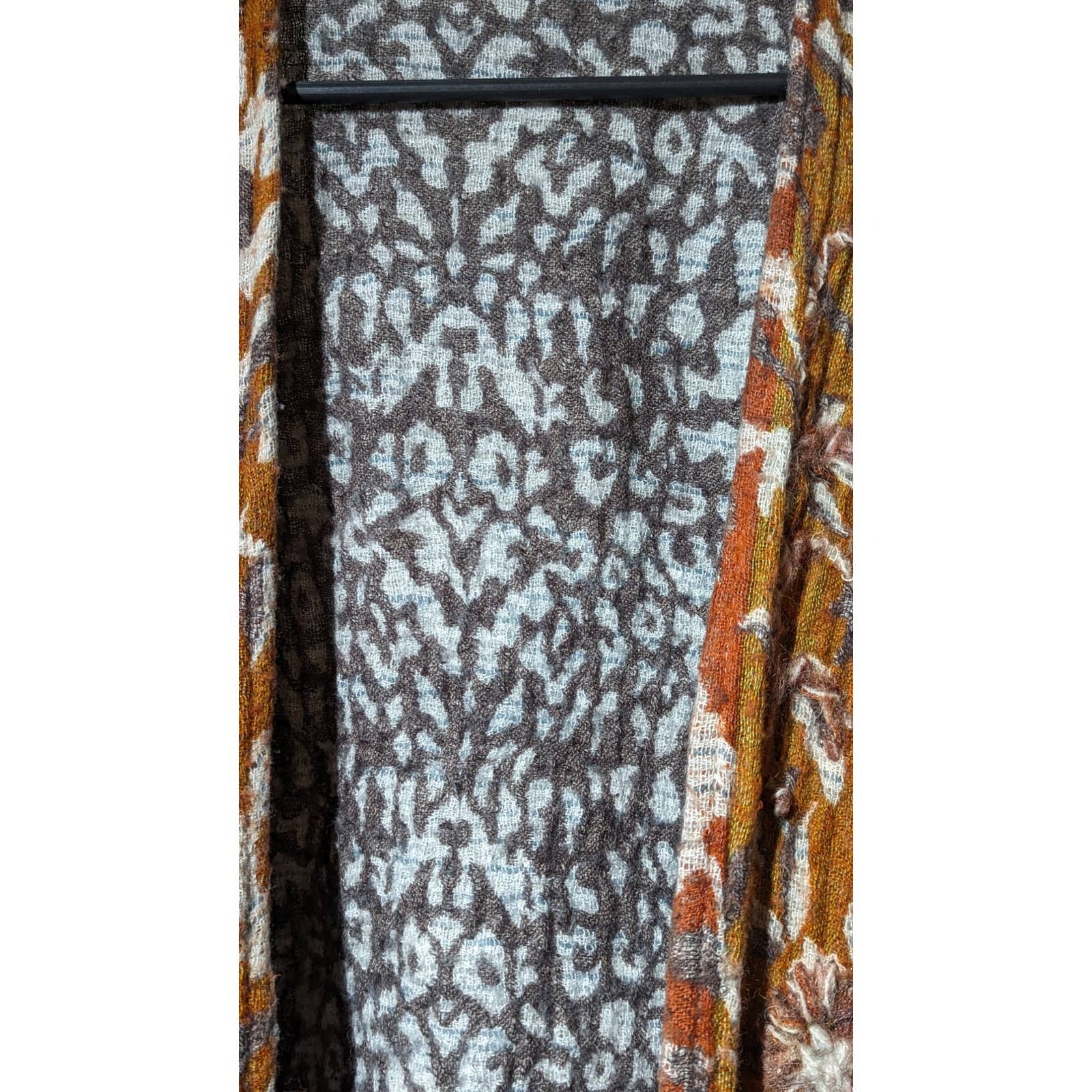 Soft Surroundings Pasha Pumpkin Leopard Print Fringe Cardigan Womens Sz S/M. Pre-owned, this cardigan is in great condition. Such great colors and patterns woven together to create this great boho look. Rich, warm, spice tones. Gray cheetah print is delightfully unexpected. 3/4 dolman sleeves. Fringe at curved bottom hem.