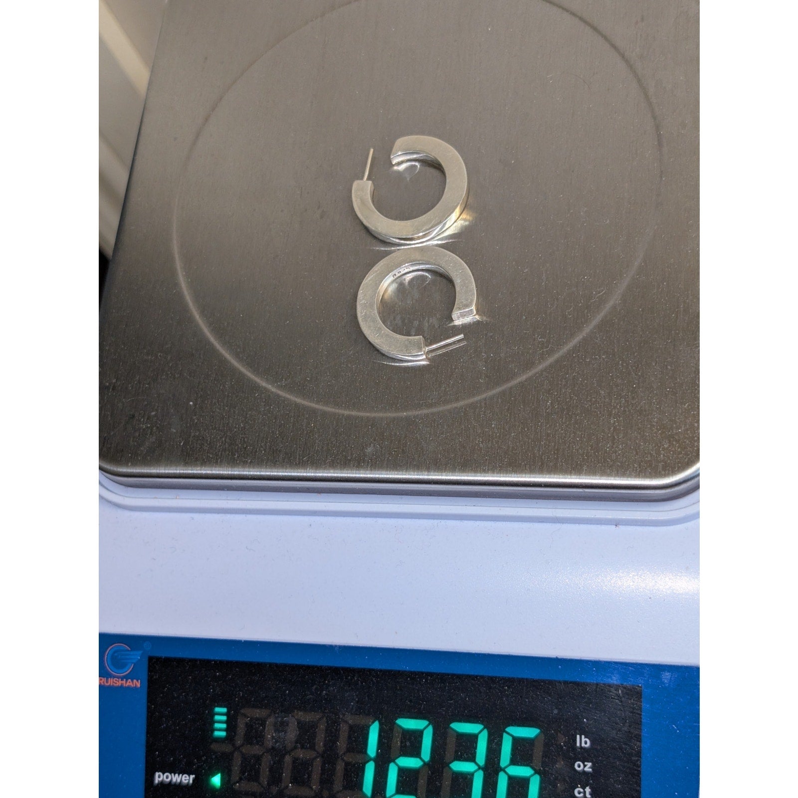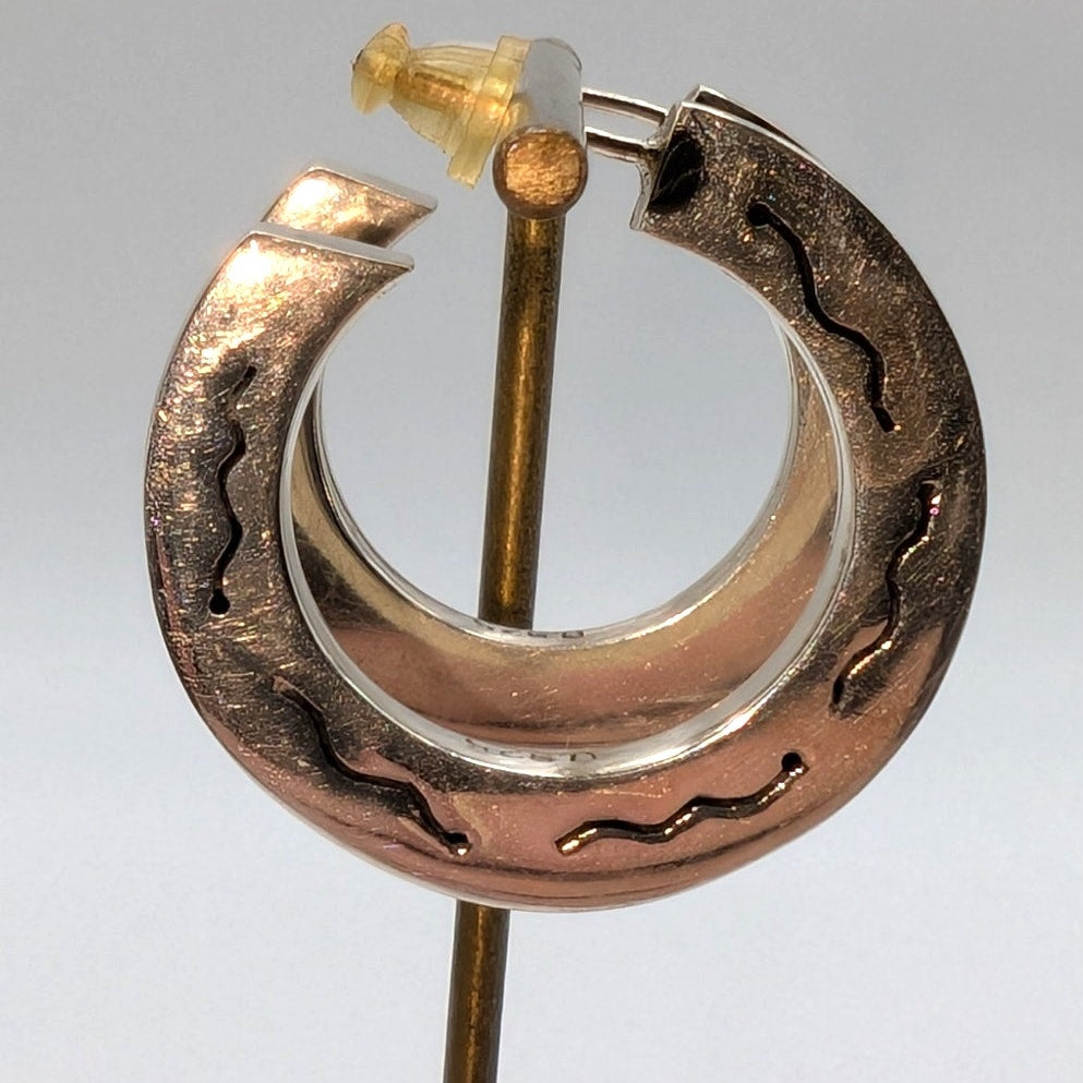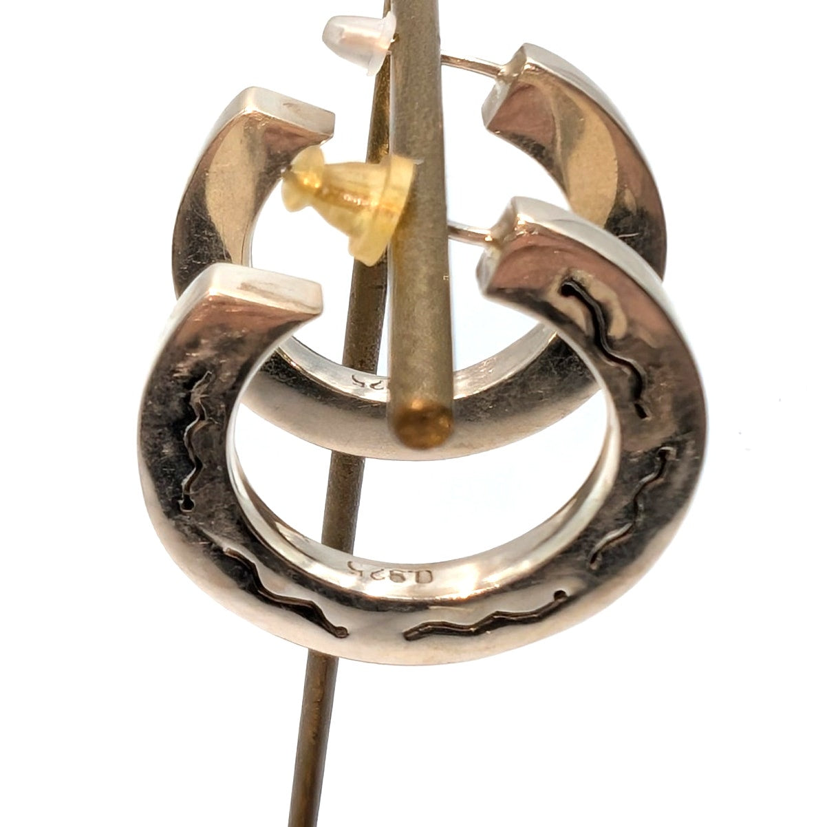 Solid 925 Sterling Silver Etched Design Hoop Earrings. Gorgeous everyday staple earrings for your jewelry wardrobe. Pre-owned, these earrings are in excellent condition.