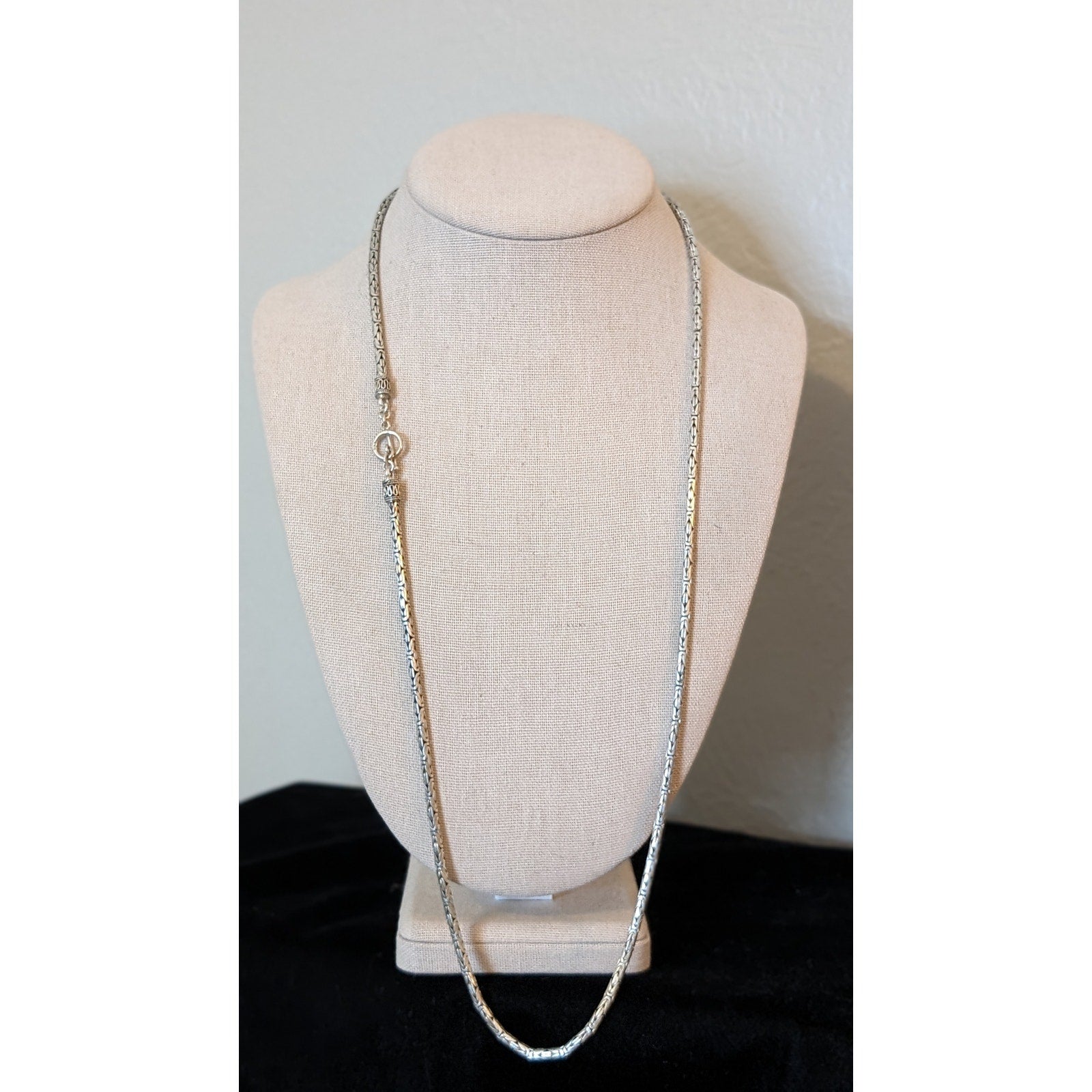 Sterling Silver 3mm Byzantine 30" Chain Necklace w/ Toggle Clasp & Bali End Caps. This is a gorgeous staple for your jewelry wardrobe that will last a lifetime. The Byzantine chain is one of the most complex chains to make but it is a classic and is timeless. There are so many ways to style this chain, and it is strong enough to hold your heaviest enhancer. Wear alone or double it. Wear the toggle in the back, to the side or at the bottom. Pre-owned, this chain is in excellent condition. Solid sterling. It weighs between 36 and 39 grams on my wonky kitchen scale.