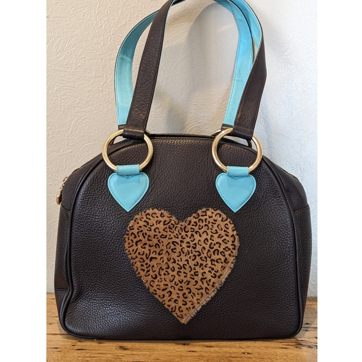 Sweet Tooth Brown Pebbled Grain Cheetah Heart Satchel Handbag. Pre-owned, this bag is in excellent condition. Clean. Minimal wear, if any.