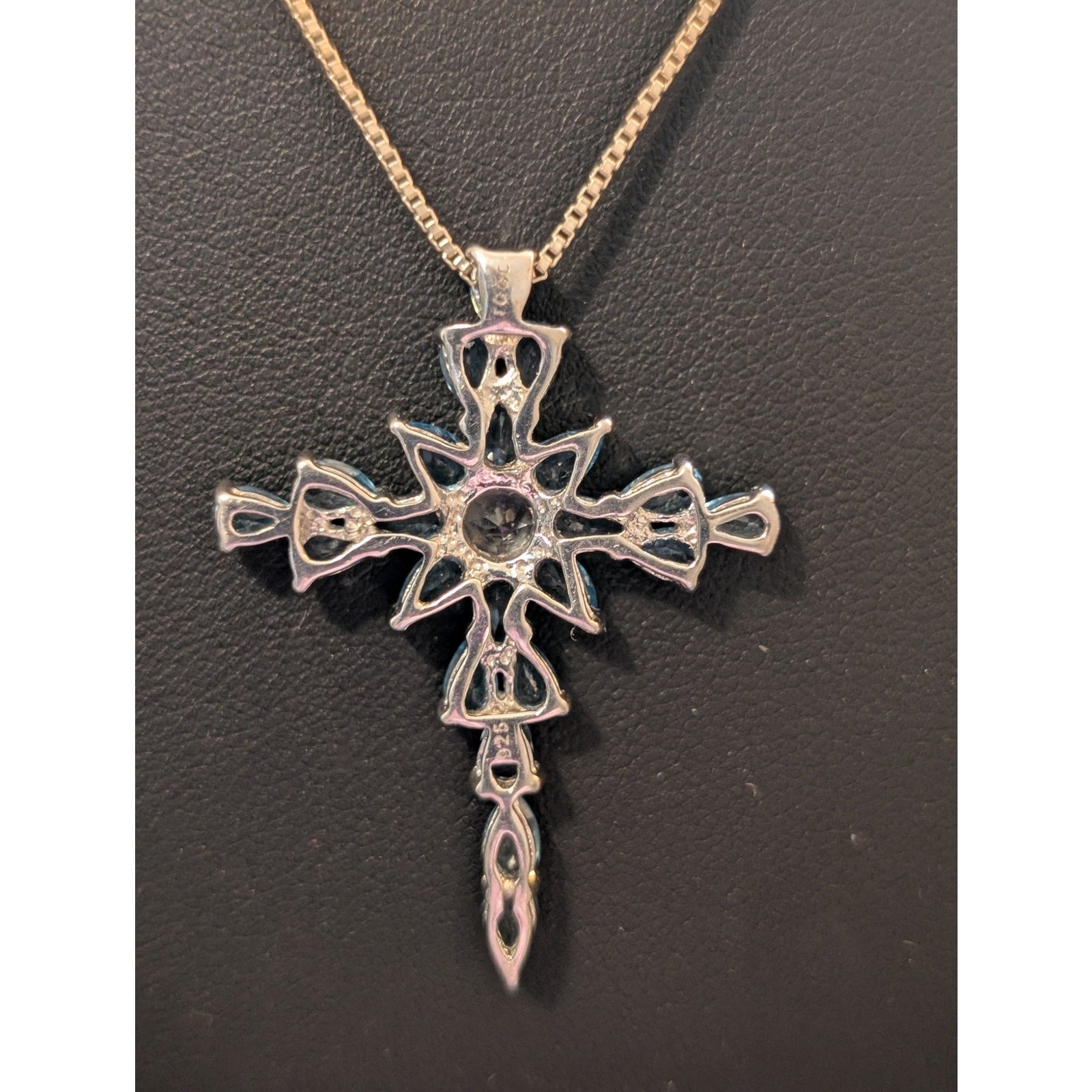 Swiss Blue Teardrop White Topaz Round Center Stone 925 Sterling Silver Cross 19" Box Chain Necklace. Cross measures 1-5/8" long by 1.25" wide. All stones test as topaz. Pre-owned, this lovely necklace is in excellent condition.