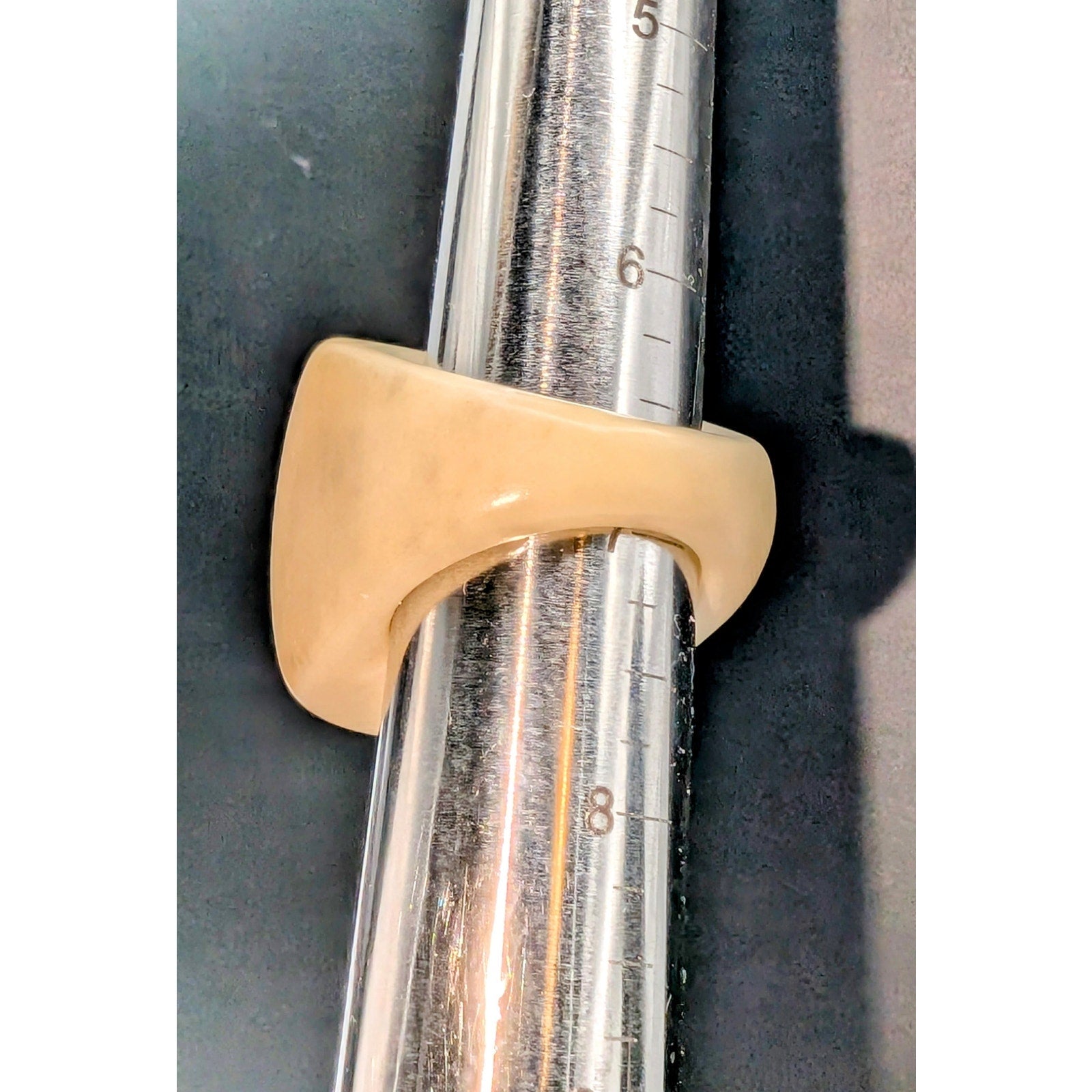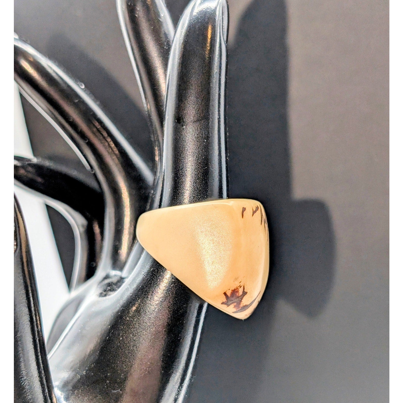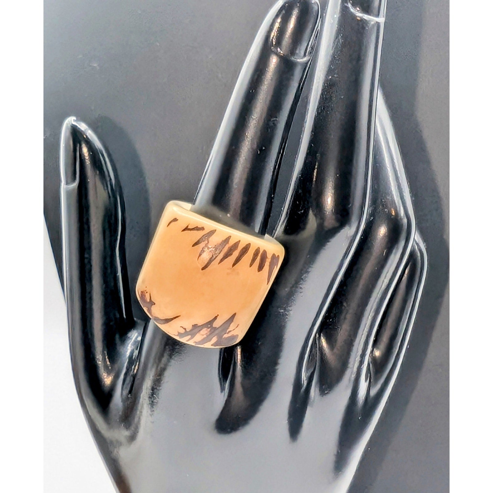 Tan Brown Chunky Tagua Nut Carved Ring Size 7. Pre-owned, this ring is in excellent condition. It might be Bakelite, but I can't confirm that. Simichrome test showed a little bit of gray on the Q-tip. If it is, my loss is your gain. Looks great on an index finger.
