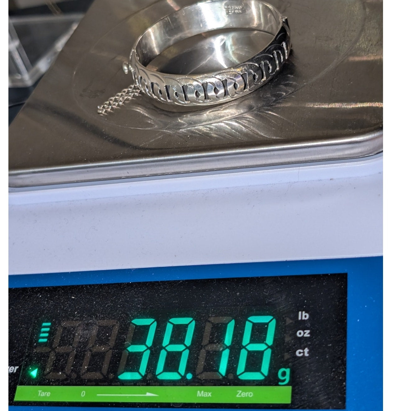 Taxco TM143 Mexico Vintage 925 Sterling Silver Dome Cut Out Hinged 15mm Wide Bangle Bracelet W/ Safety Chain 38.18g. Pre-owned, this bracelet is in excellent vintage condition.