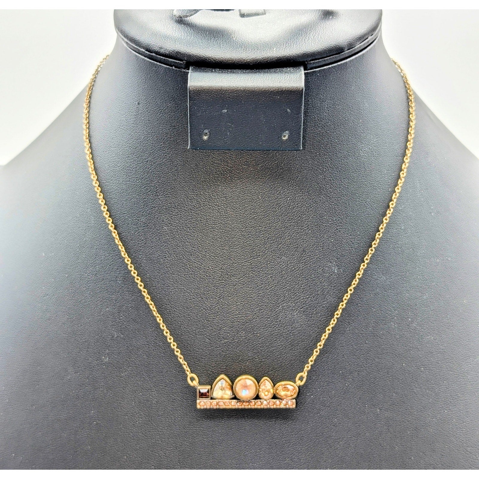 TCS Touchstone Crystal by Swarovski Bronze Metal Crystal Bar 15"-18" Necklace. Pre-owned, this necklace is in excellent condition. Crystals are multi-colored and multi-shaped sitting on a center bar. Neutral tones.