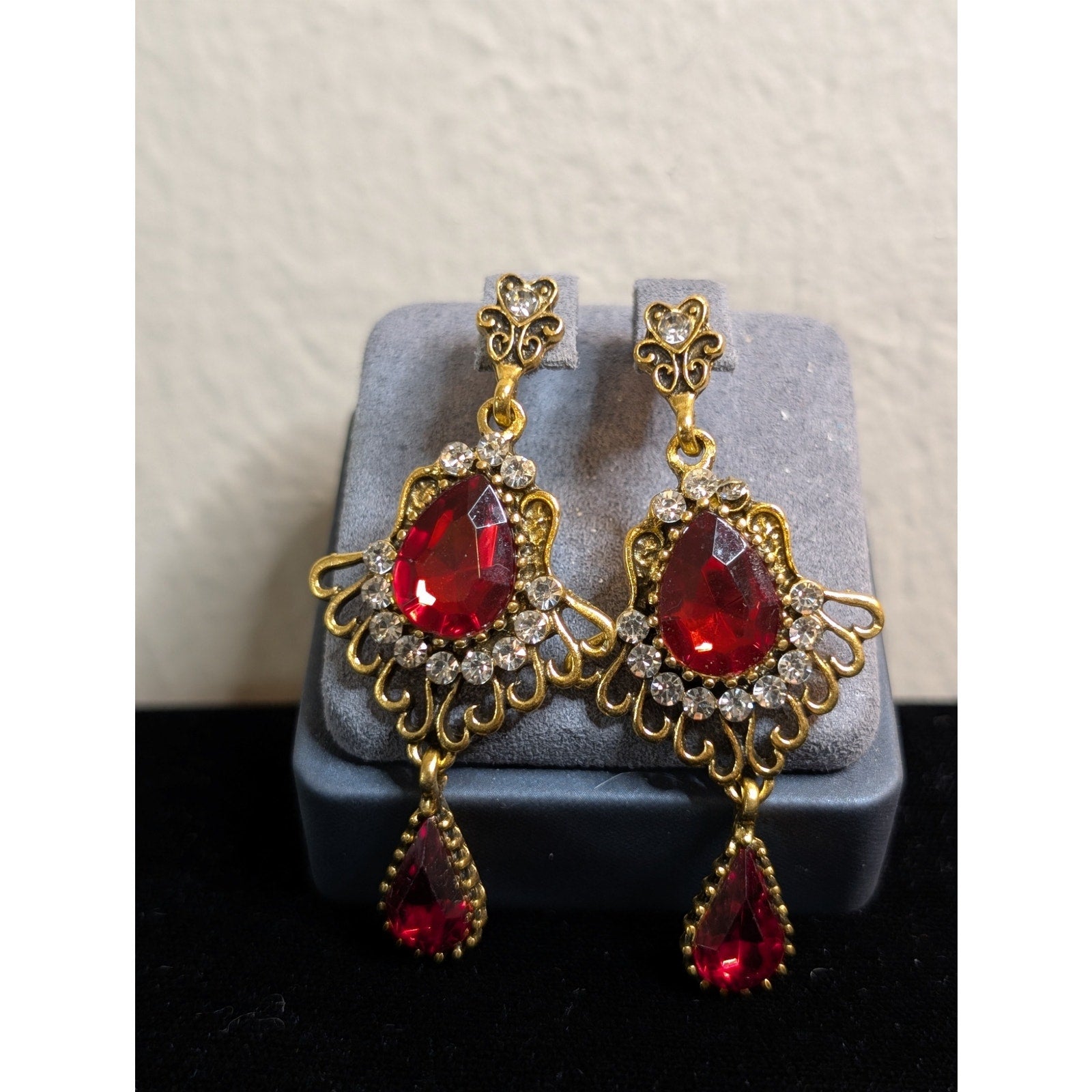 Teardrop Red Crystal Antique Gold Tone Rhinestone Dangle Drop Earrings. Pre-owned, these earrings are in excellent condition.