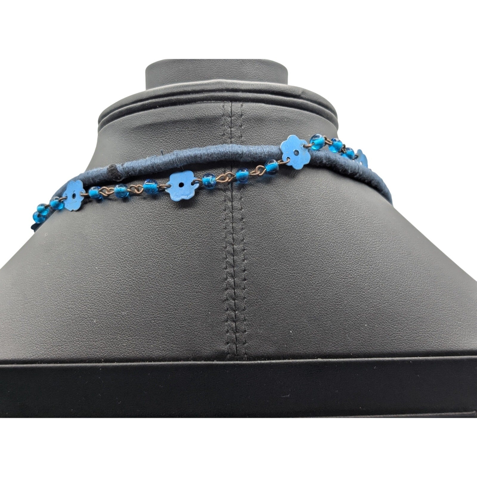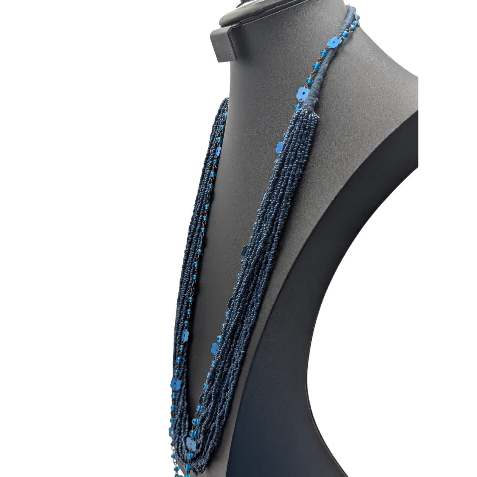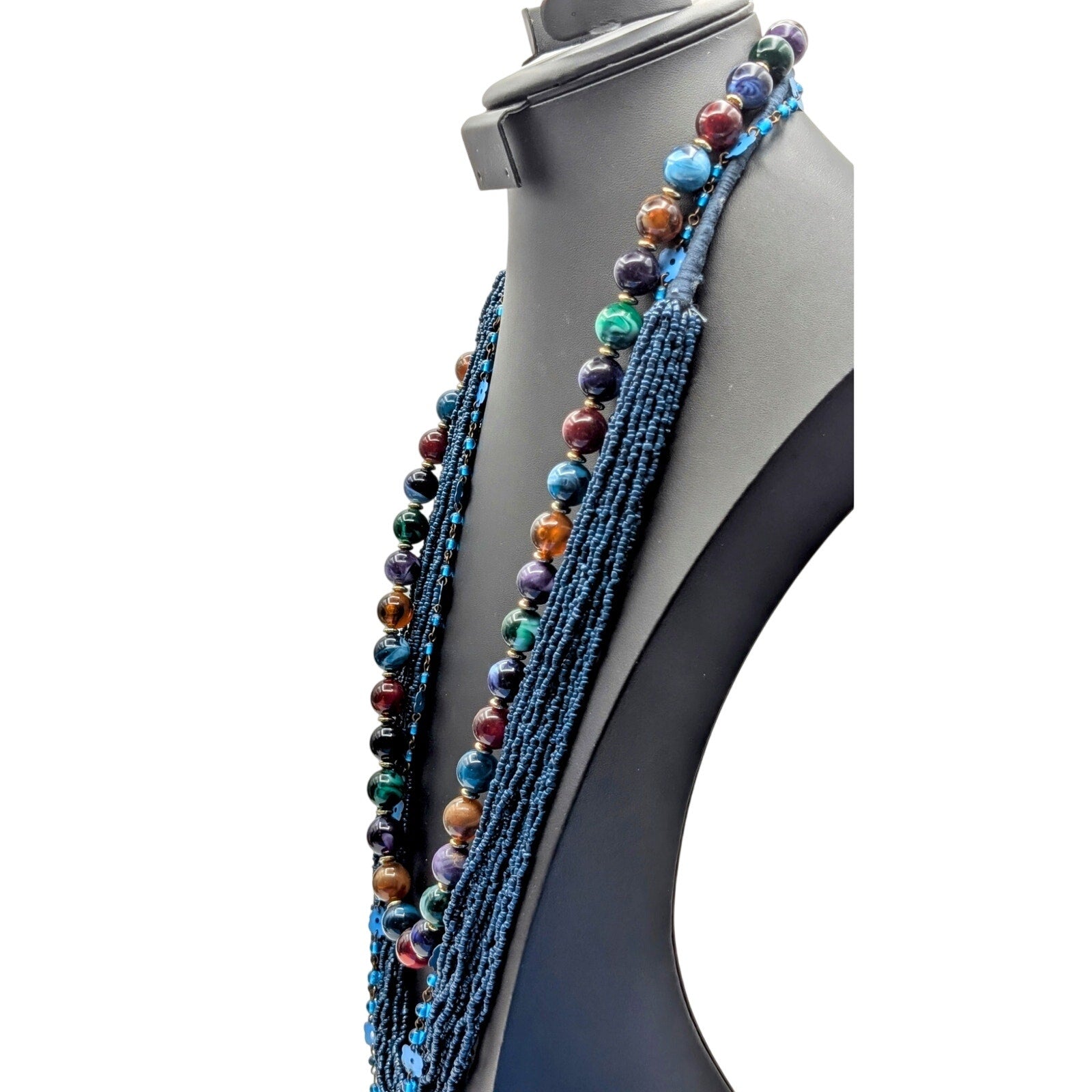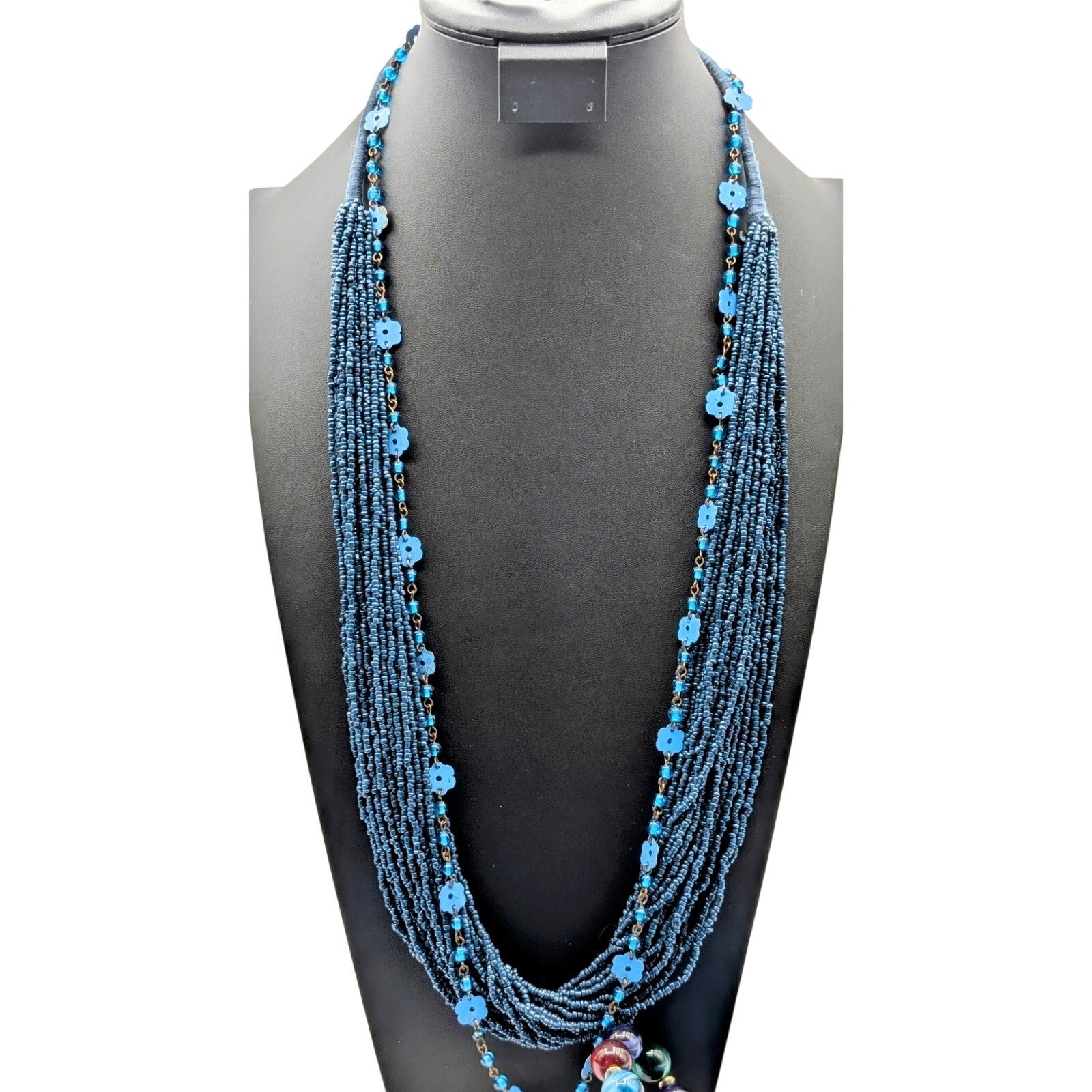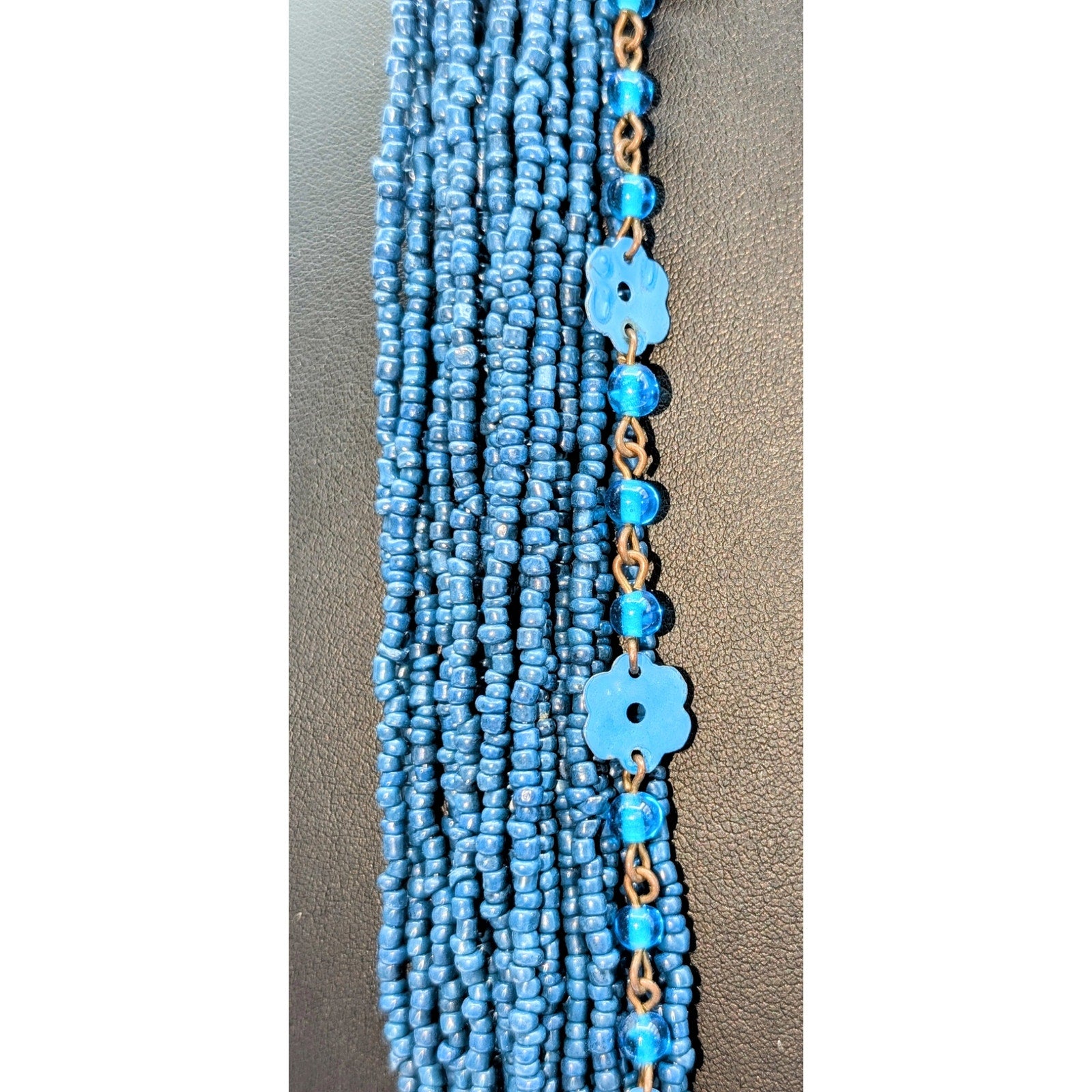 Three Piece Blue Vintage Tribal Boho Look Necklace Layered Lot. The base layer of this look is a multi-strand blue seed bead necklace cord wrapped at the back. The second layer is this fun glass bead metal flower strand that reminds of me of the flower power of the 70s. The last and shortest strand is a vintage acrylic marble look beaded necklace with jewel tone colors. Wear together or separately or with other pieces in your jewelry wardrobe. Have fun with it to create your own personal style! Pre-owned, these pieces are in good wearable condition.