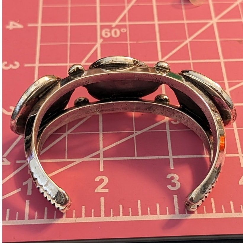 Three Turquoise Stone & Sterling Silver Chunky Cuff Bracelet. Bold statement bracelet set with three outstanding turquoise stones. Nice weight and feel to this sturdy cuff. Unmarked. Pre-owned, this cuff is in excellent condition. It weighs between 79-80 grams according to my kitchen scale. Inside circumference is 5.25" with additional 1-5/8" for the opening. It is 1/25" at its widest point.