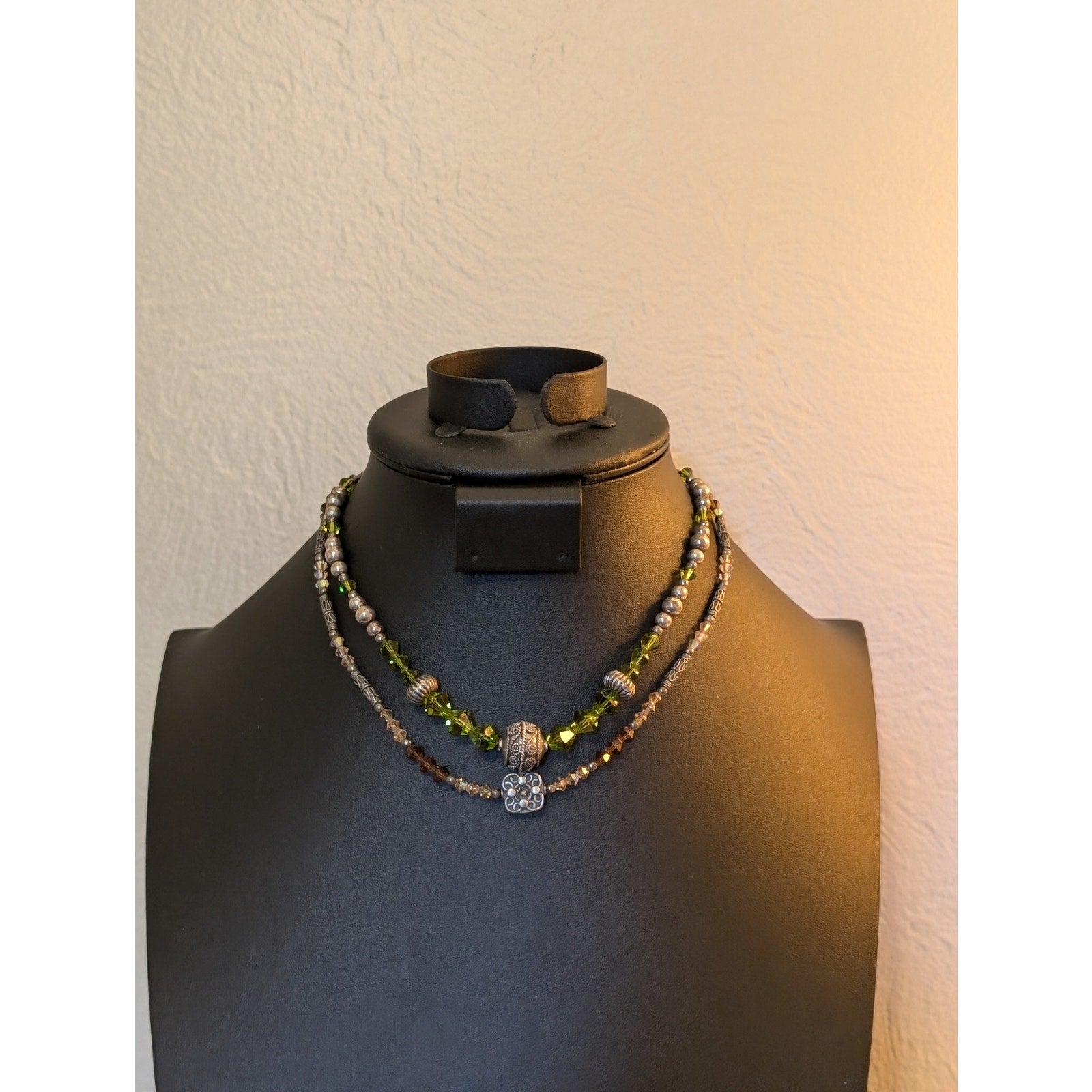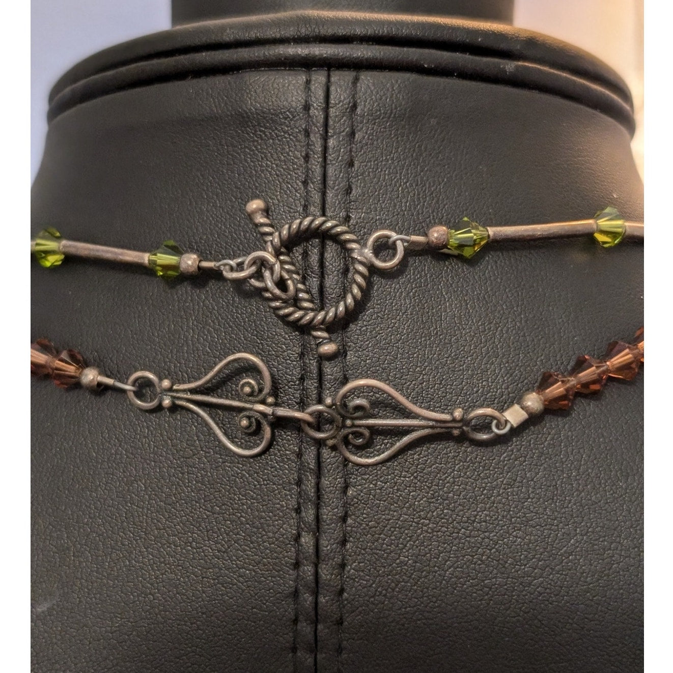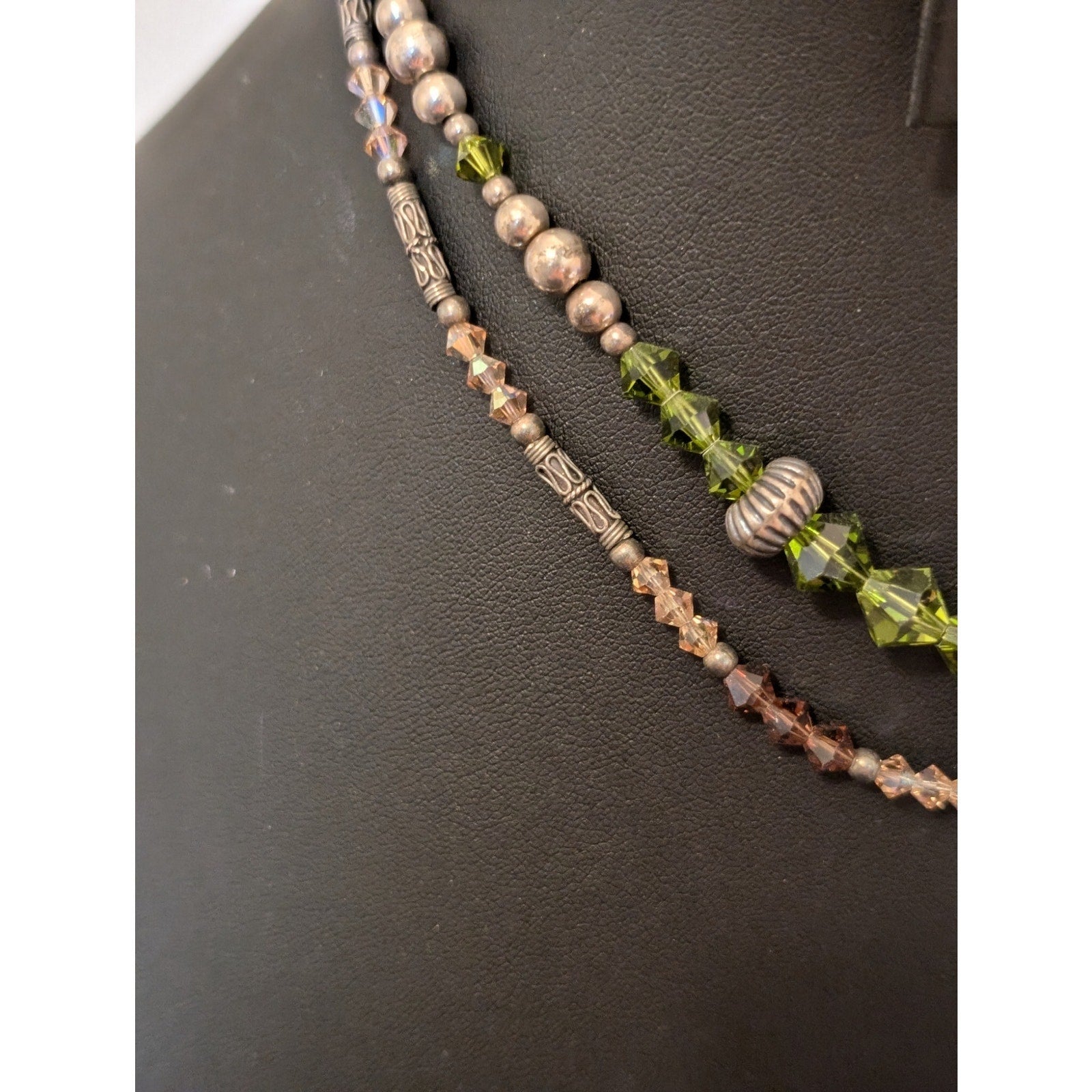 Two 925 Sterling Green Champagne Smoky Topaz Crystal Balinese Bead Necklaces. Layer them or wear separately. Gorgeous crystal beads and all metal tests positive for sterling. Toggle clasp and a hook clasp. Green crystal necklace measures 15" and the smoky topaz color crystal measures 16". Pre-owned, these necklaces are in excellent condition. I did not polish the silver, but I am including a polishing cloth.