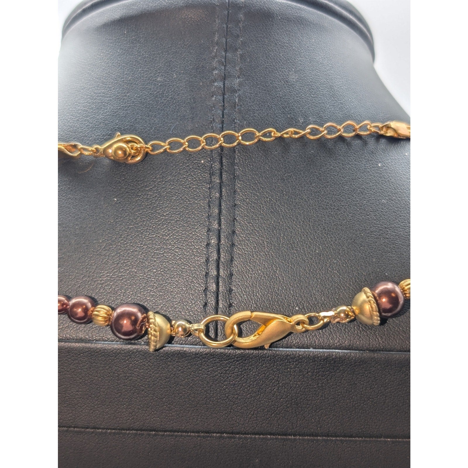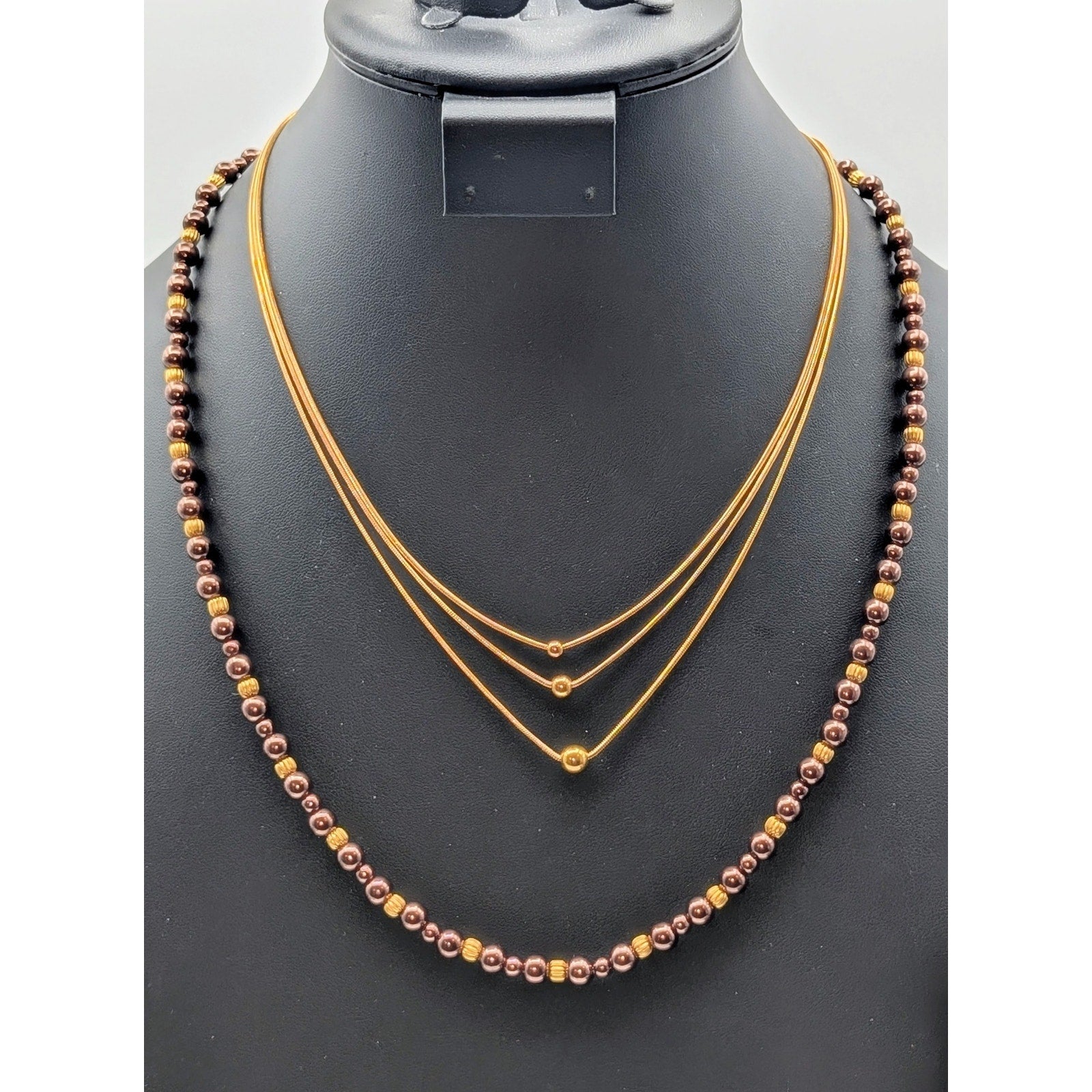 Two Gold Tone Beaded Necklaces--1 Triple Strand Ball Bead & 1 Copper Glass Bead