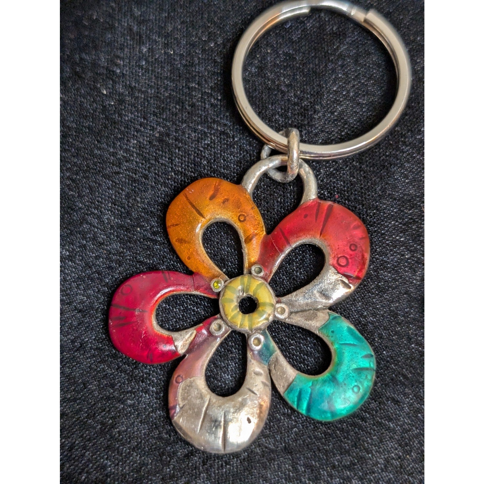 Two Key Chains Look Lovely Together One is Brighton. The other is unmarked. These two key chains coordinate perfectly as though they were made for one another. One is a floral enamel and the other has stone wood bead charms. You could attach them together with a clip for a great purse charm. Pre-owned, they are in great condition.