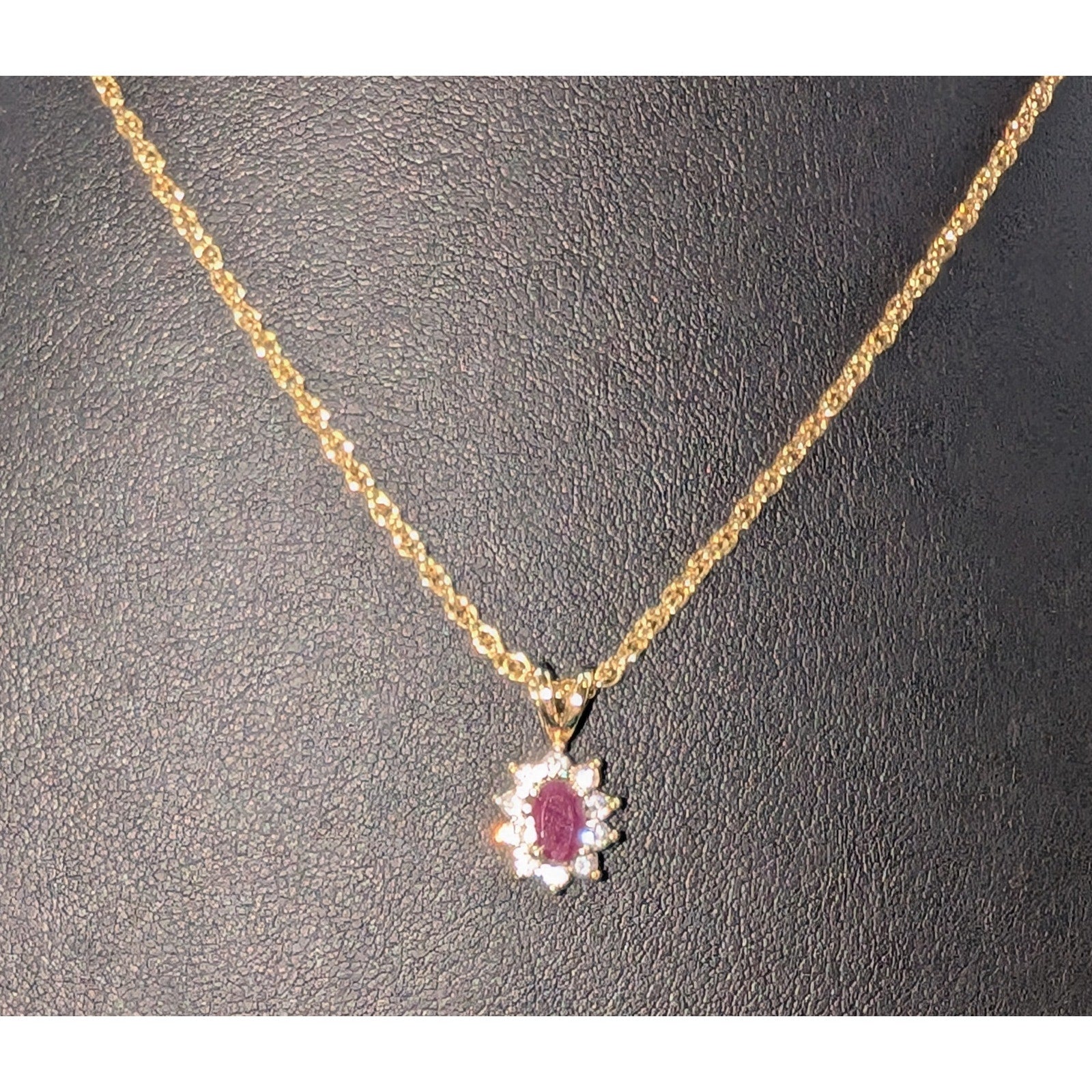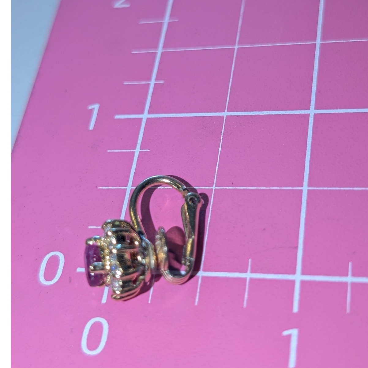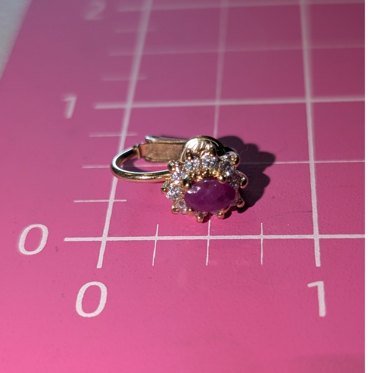 Vintage 1/20 14k Lab Created Ruby White Spinel Gold Tone 18" Necklace & Clip On Earring Set. Red stones test as ruby, but I'm assuming that because this set is 1/20 14k, that they are lab created or simulated rubies. It's really hard to get an accurate reading on the clear stones, but they most often register in the spinel area. Pre-owned, this set is in excellent condition.