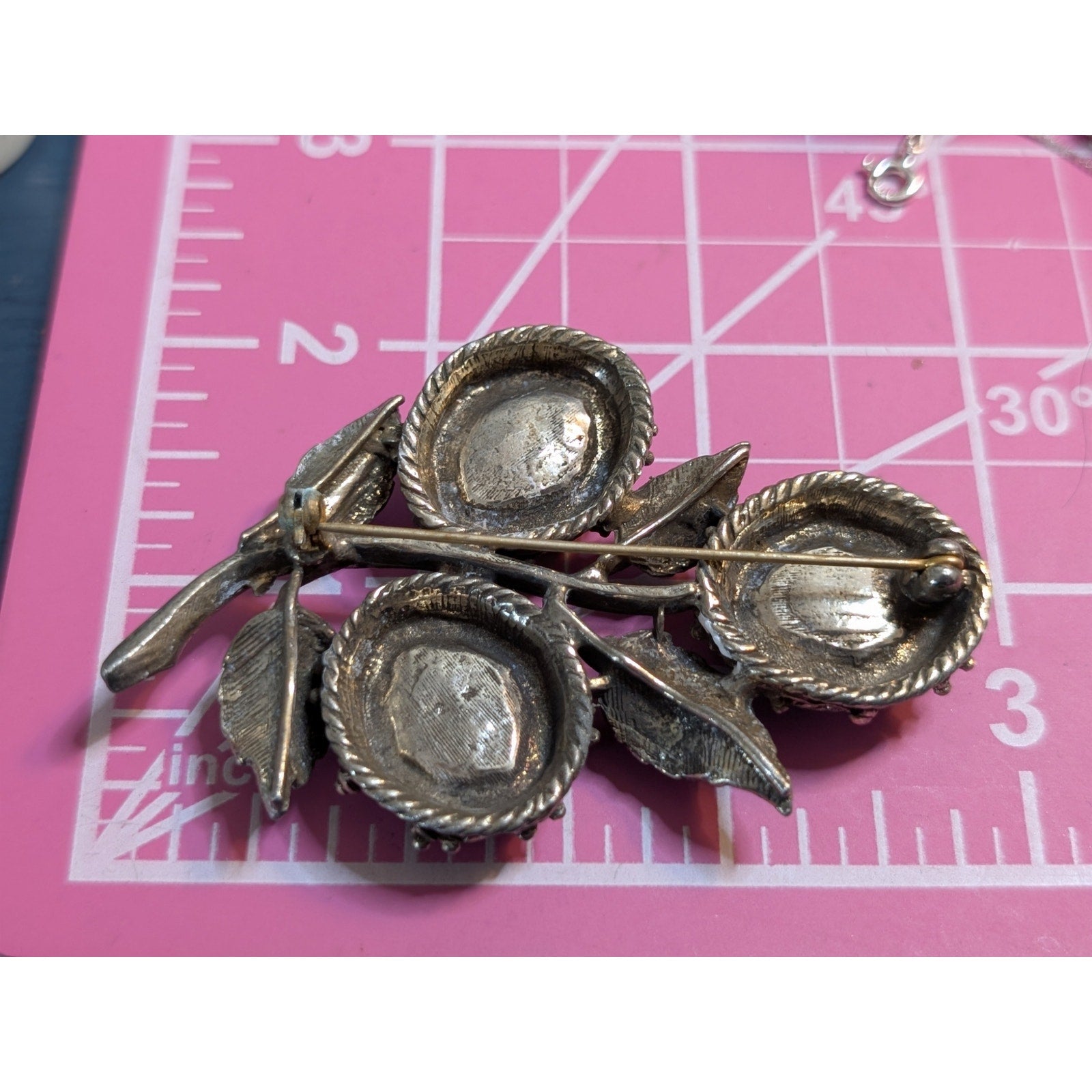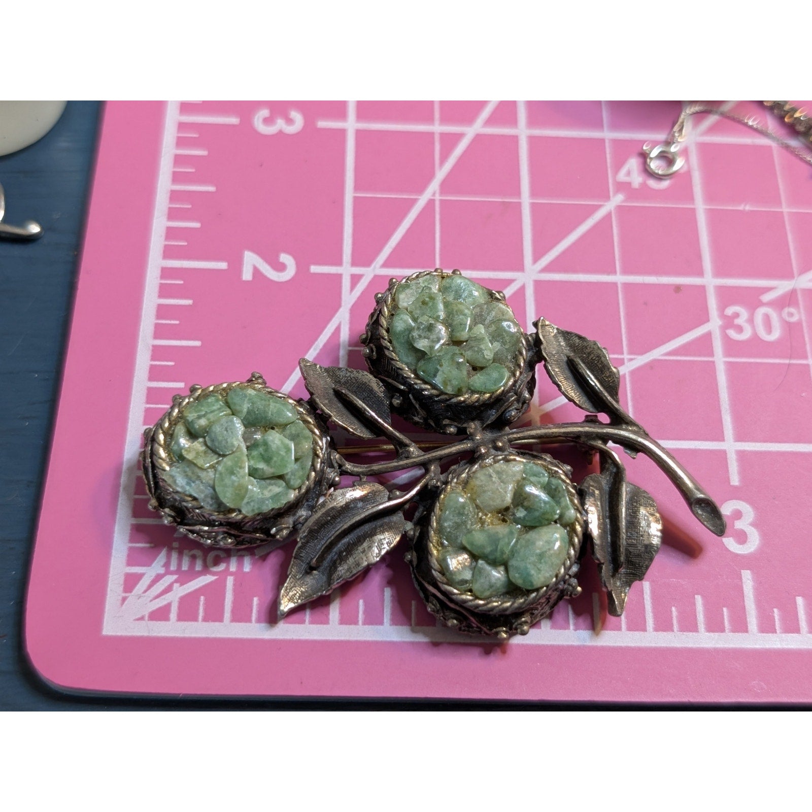 Vintage 1950s Crushed Jade Floral Leaf Large Brooch. Pre-owned, this lovely brooch is in great vintage condition.