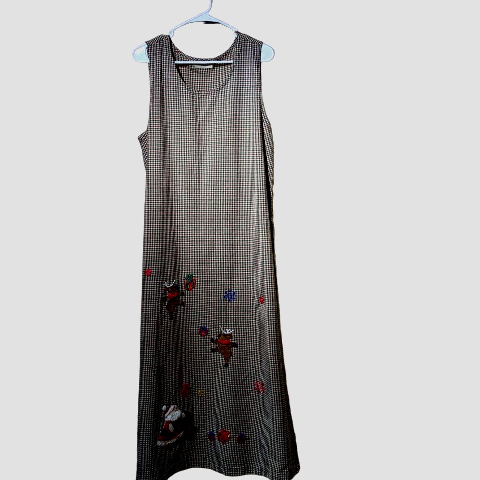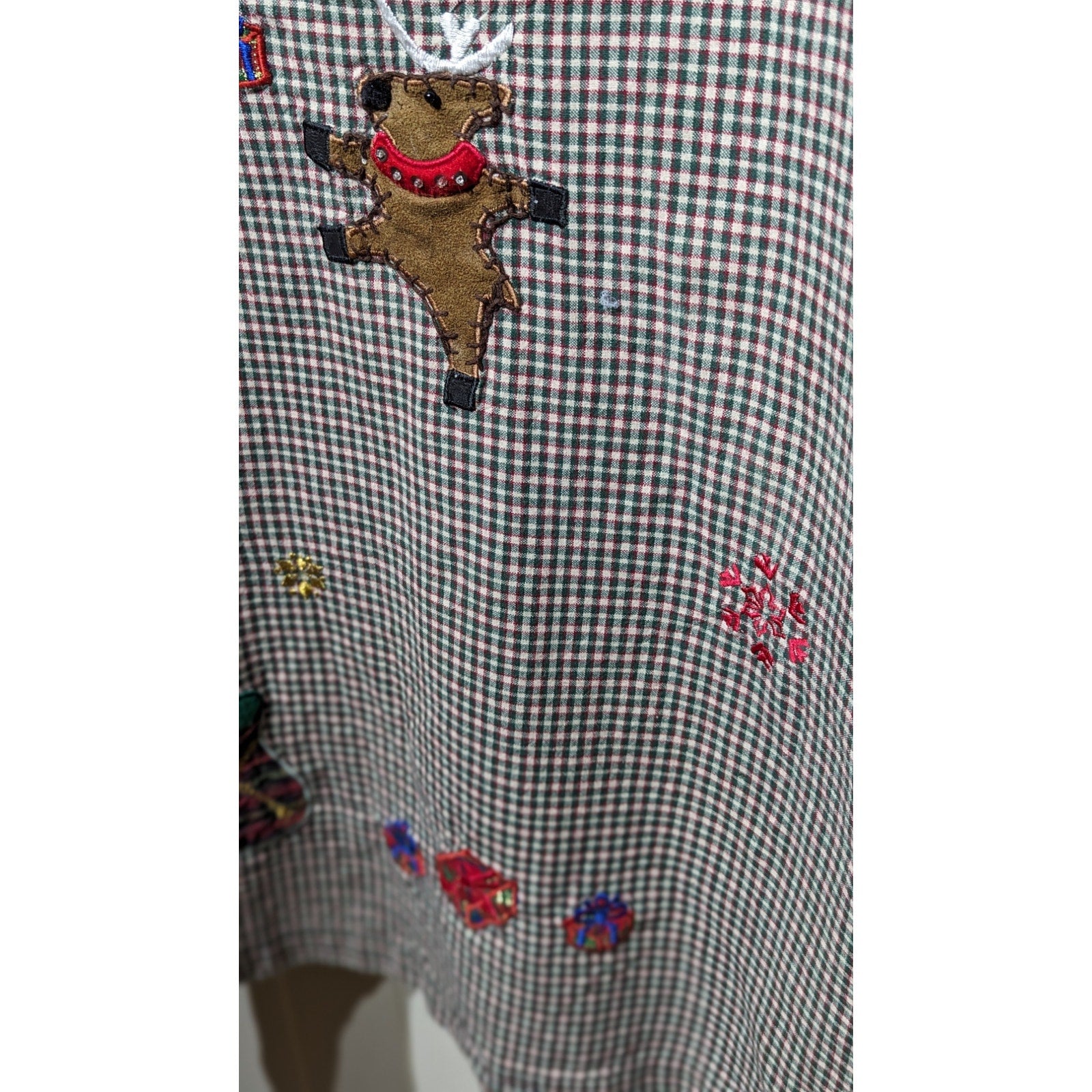 Vintage 1990s Lemon Grass Plaid Santa Reindeer Christmas Jumper Sz 2X. Calling all homeschool moms and elementary grade school teachers. This jumper is for you! As a former homeschool mom and homeroom aide, I would have worn this in a heartbeat at this time of year. Christmas concerts, parties, etc. The kiddos will love it! 100% cotton. Made in India. There is no size tag or fabric content but I did find the fabric content on another site for a size small. Go by the measurements! Armpit to armpit measures 23". Waist is approximately 48" and hips are approximately 50". This jumper measures 49" long. Button up side. Pre-owned, it is in excellent condition. Lagenlook, homeschool mom, elementary teacher, Christmas memories.