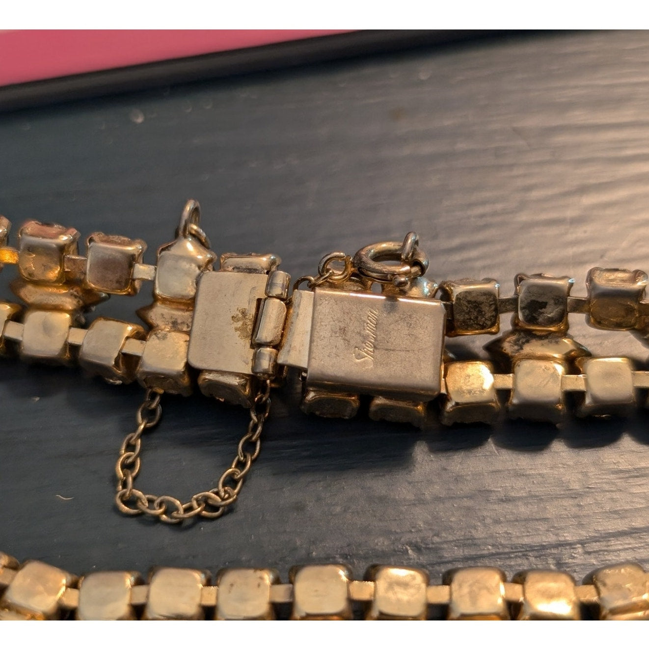 Vintage 60s-70s Signed Sherman Stunning AB and Topaz Swarovski Crystal Bracelet. Gold tone metal bracelet featuring sparkling AB rhinestones and Swarovski crystals of topaz color. The clasp works great and has a safety security chain. Highly collectible. Gustave Sherman founded his Montreal manufacturing company, Sherman Costume Jewelry, in 1947. By the 1950s, Sherman had established himself as Canada's foremost costume jeweler. His high end costume jewelry was some of the most expensive on the market. This bracelet is marked SHERMAN on the clasp. Pre-owned, this bracelet is in great condition with working clasp and security chain. All stones are present and original to the piece. The bracelet has some age-related wear on the back metal surfaces but looks fabulous on the wrist. It could use a gentle cleaning by someone who knows how to care for vintage costume crystal jewelry.