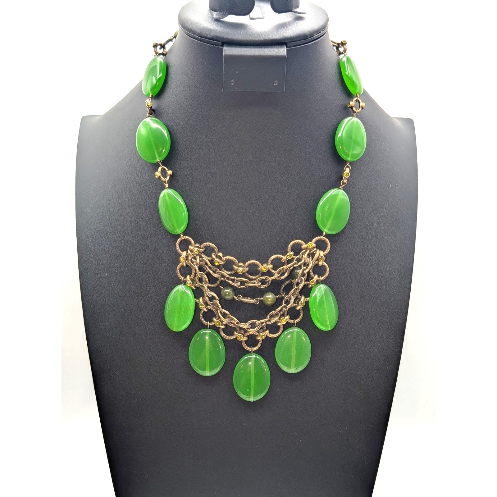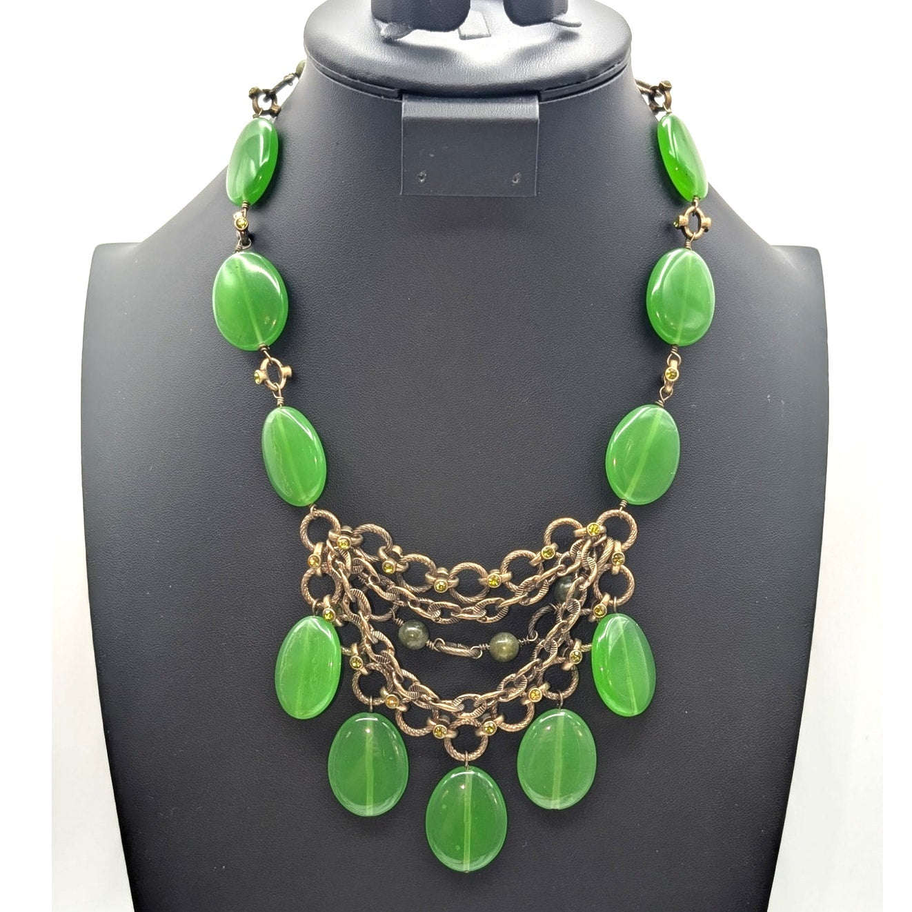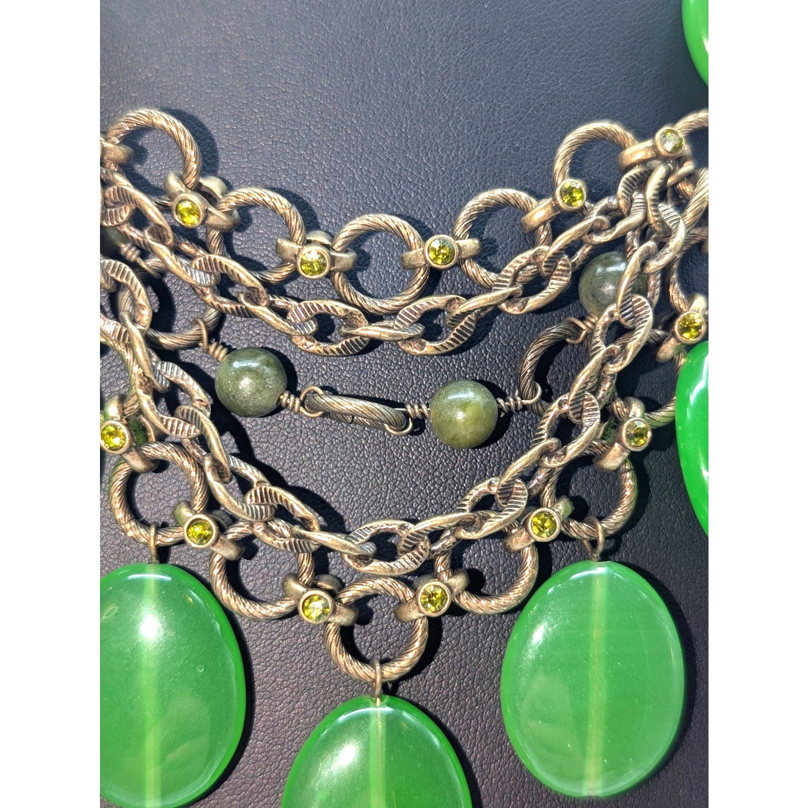 Vintage 80s Marked Kiam Family Glass Brass Rhinestone Stone Necklace. Large green oval glass beads on brass wire, interlocking with brass rings adorned with peridot colored rhinestones. Center portion of necklace is a cascade of brass rings, brass chains and genuine stone beads. Tagged Kiam Family. Necklace measures 16" long, with a short extender section measuring 2" long. Necklace is pre-owned and in excellent condition. Really wanted to keep this one for myself. Well made. Chunky.