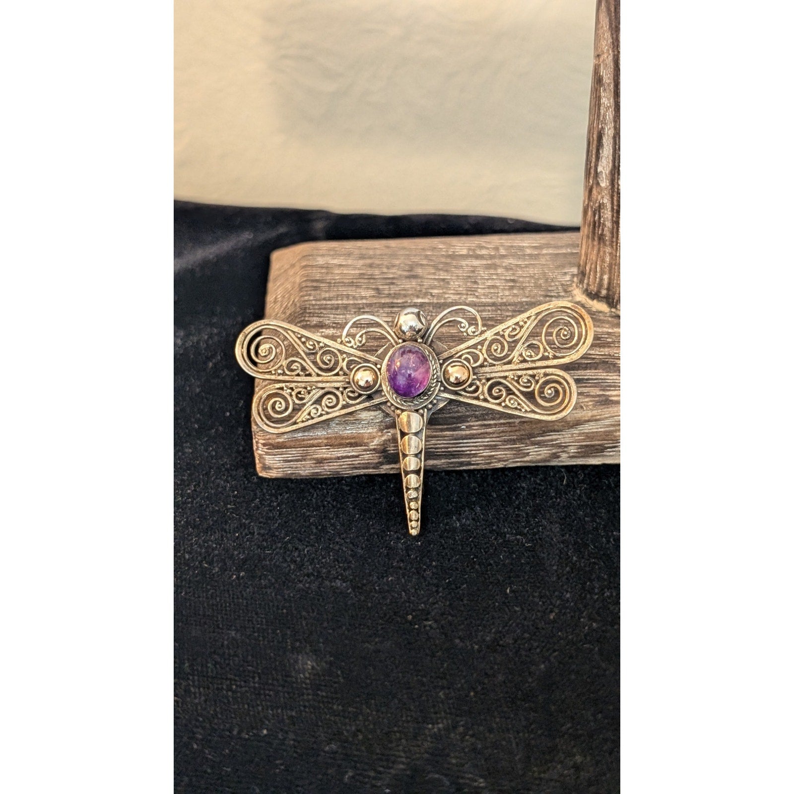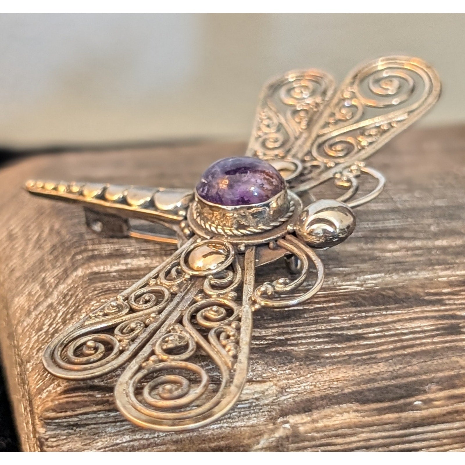 Vintage 925 Filigree Bali Design Amethyst Cabochon Dragon Fly C Clasp Brooch. Pre-owned, this darling old dragon fly with a purple heart is in excellent condition. Marked 925.