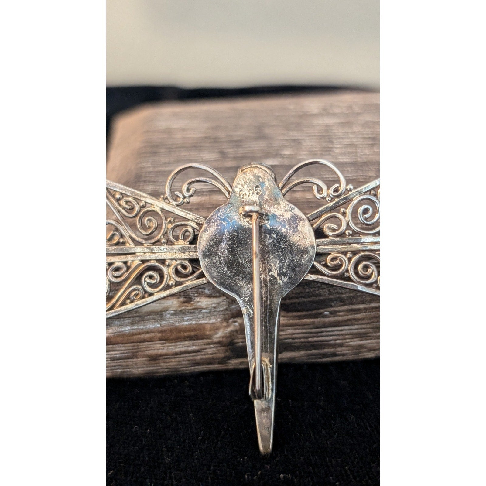 Vintage 925 Filigree Bali Design Amethyst Cabochon Dragon Fly C Clasp Brooch