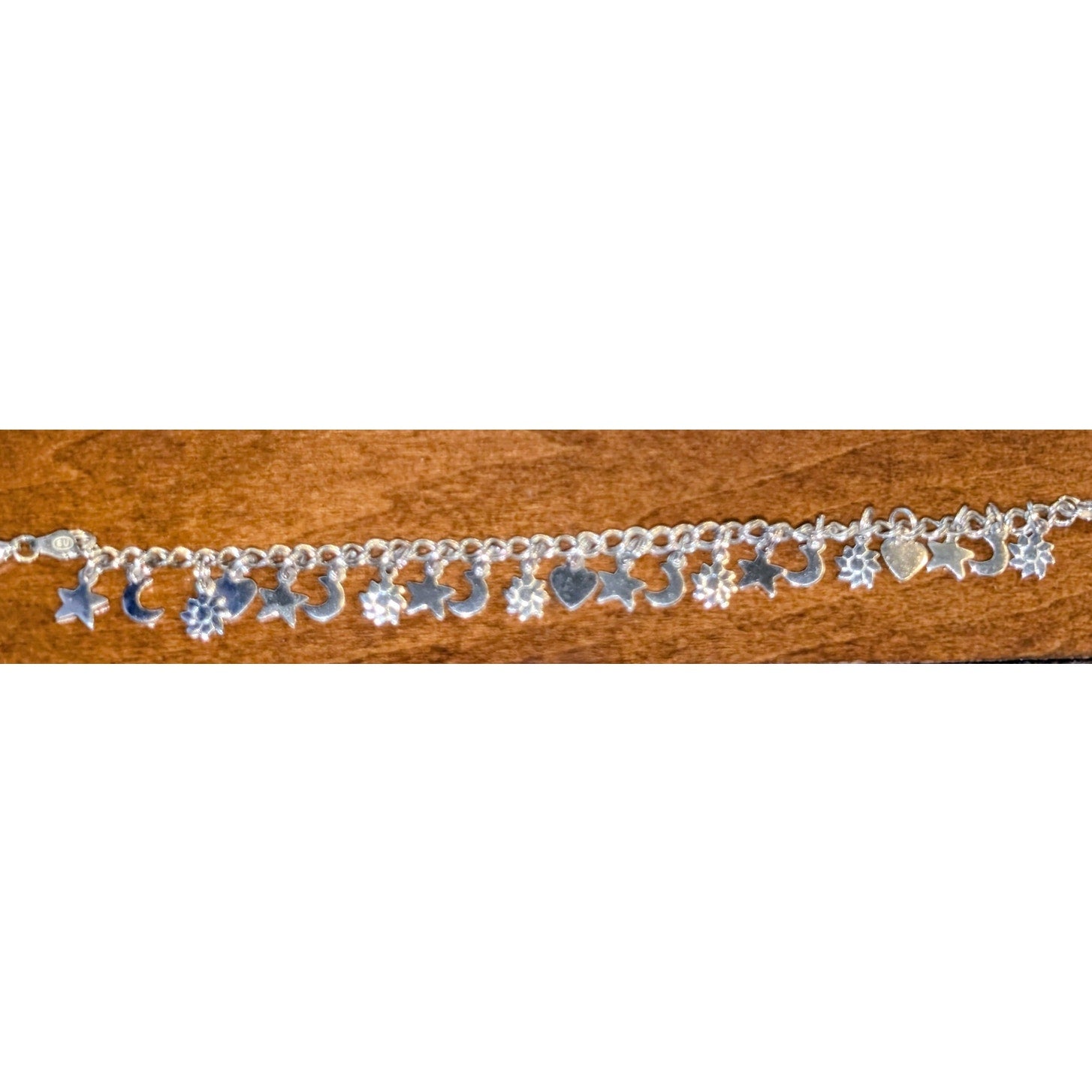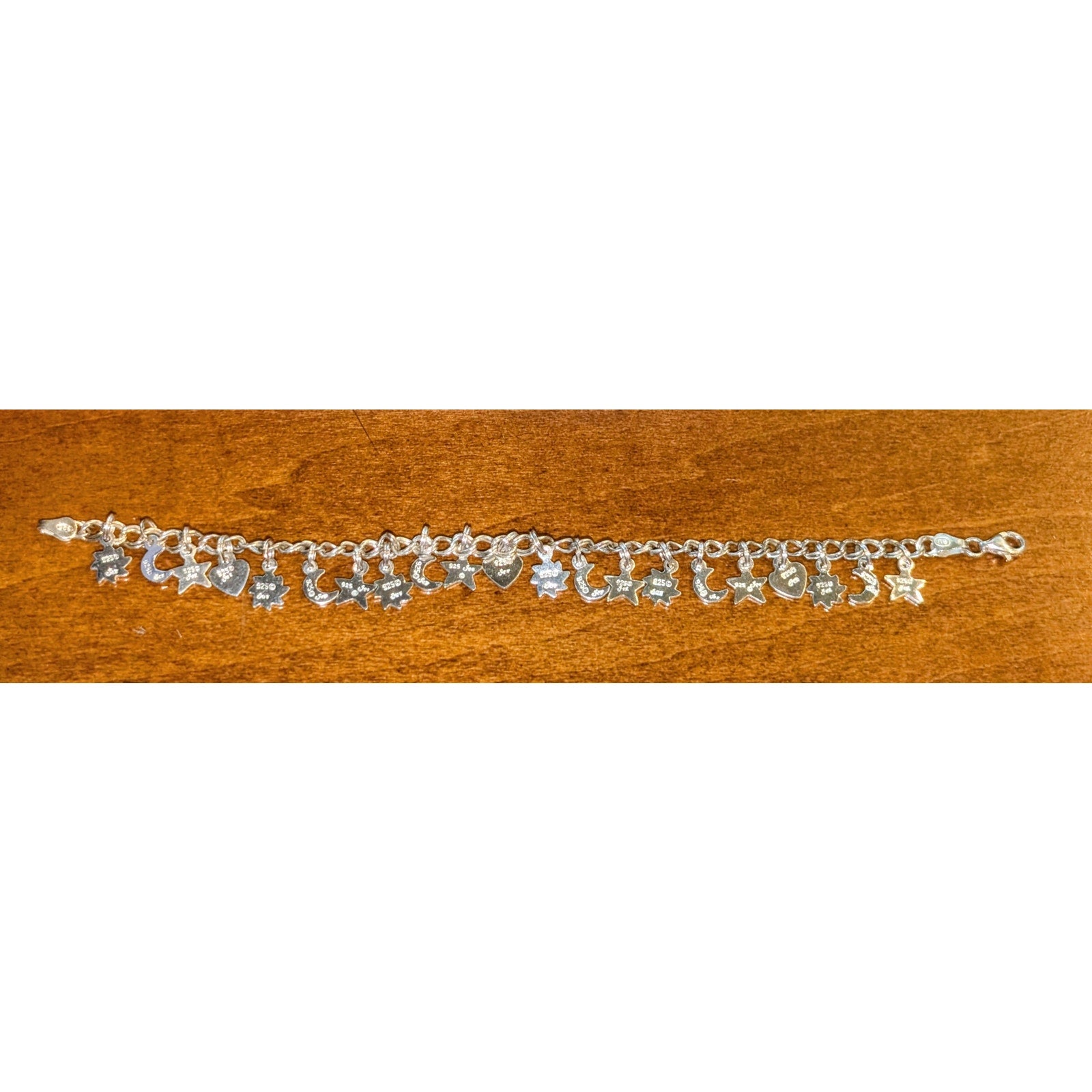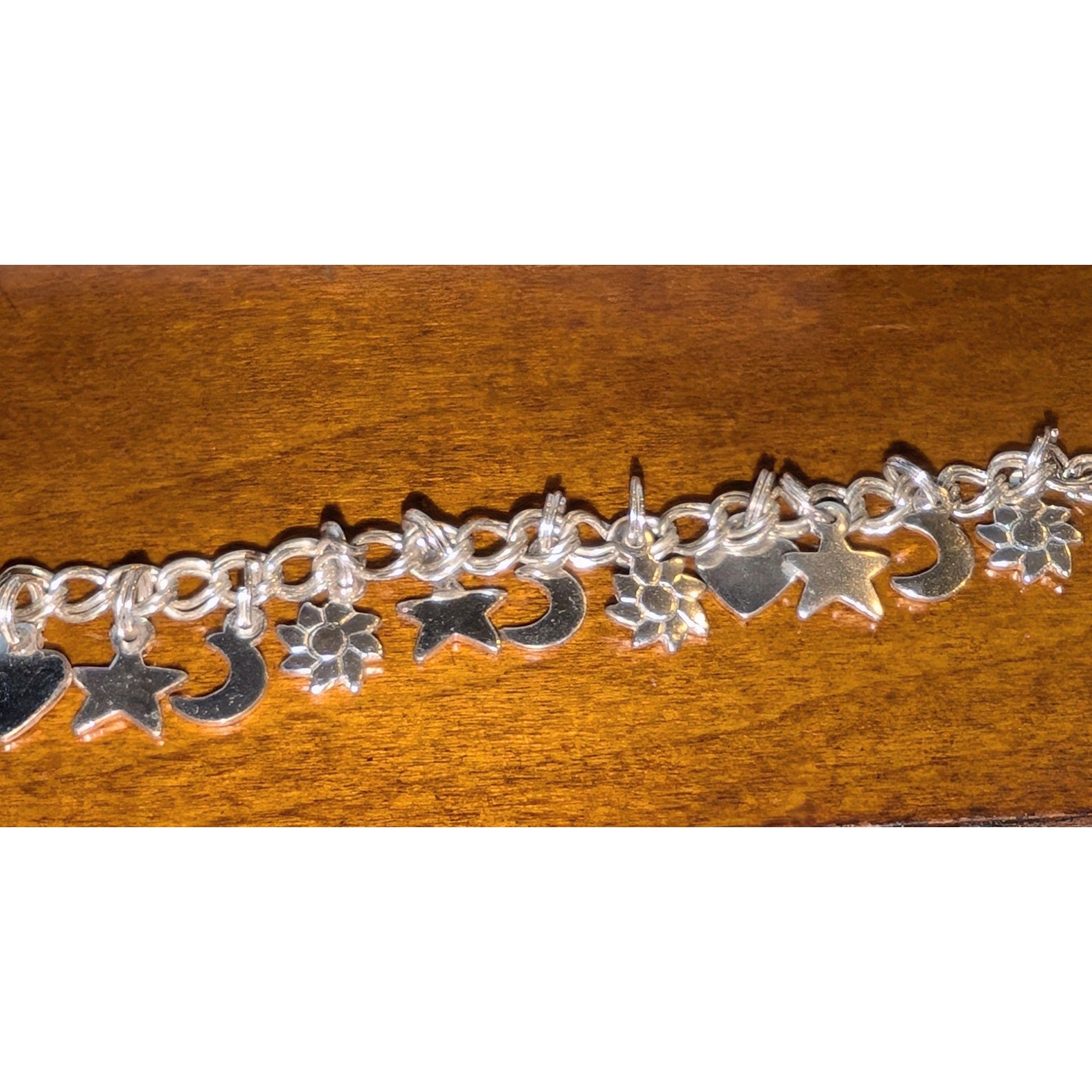 Vintage 925 Italy Sterling Silver Star Crescent Moon Flower Heart Charm Bracelet
