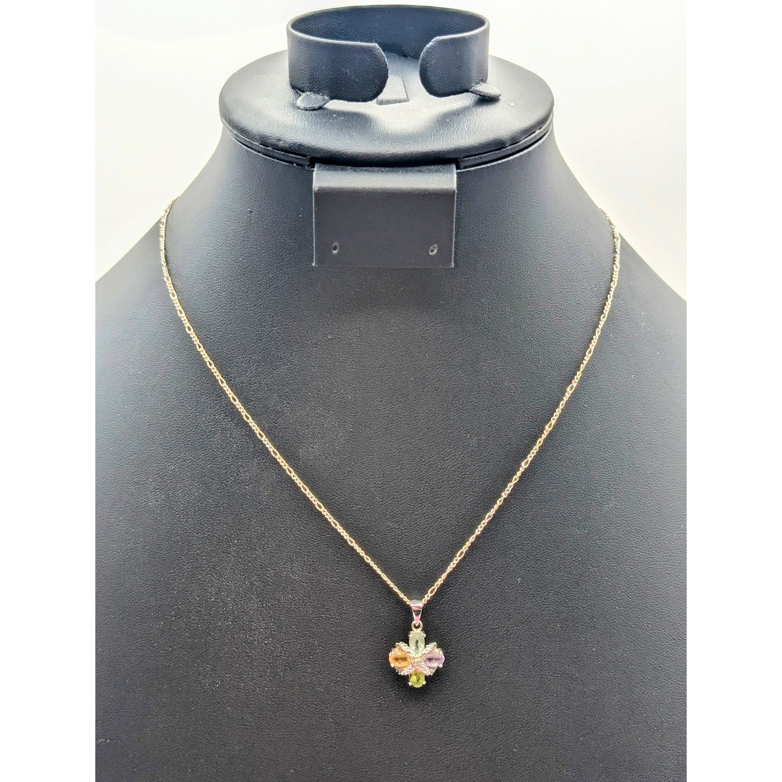 Vintage 925 Sterling Silver 4 Oval Gemstone & Diamond Figaro Chain Necklace. Citrine, Blue Topaz, Amethyst, and Peridot. There is one small diamond right in the middle. Chain is a sterling figaro and measures 18" long. Pre-owned, this necklace is in excellent condition.