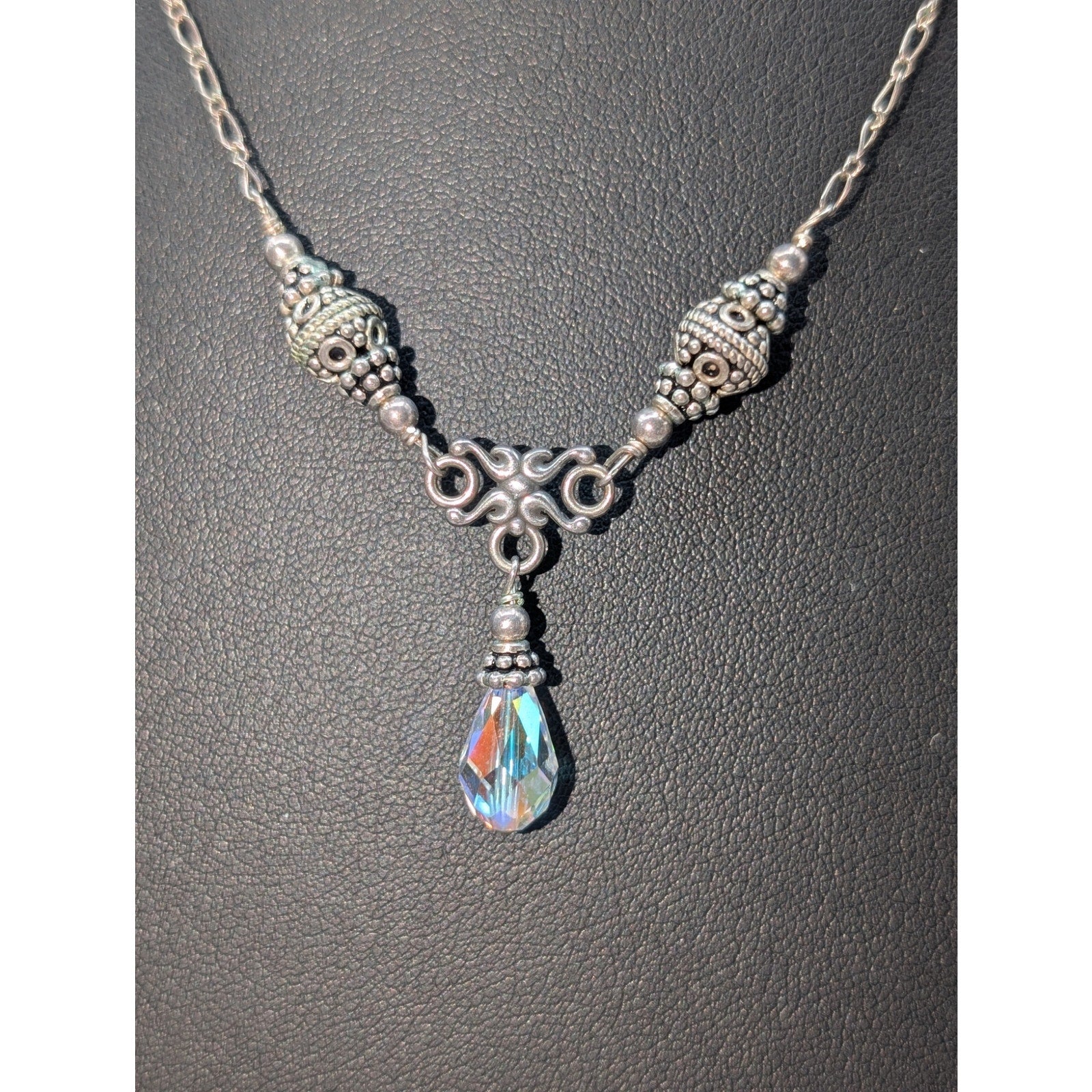 Vintage 925 Sterling Silver Beaded Chain Y Drop AB Crystal Teardrop Necklace