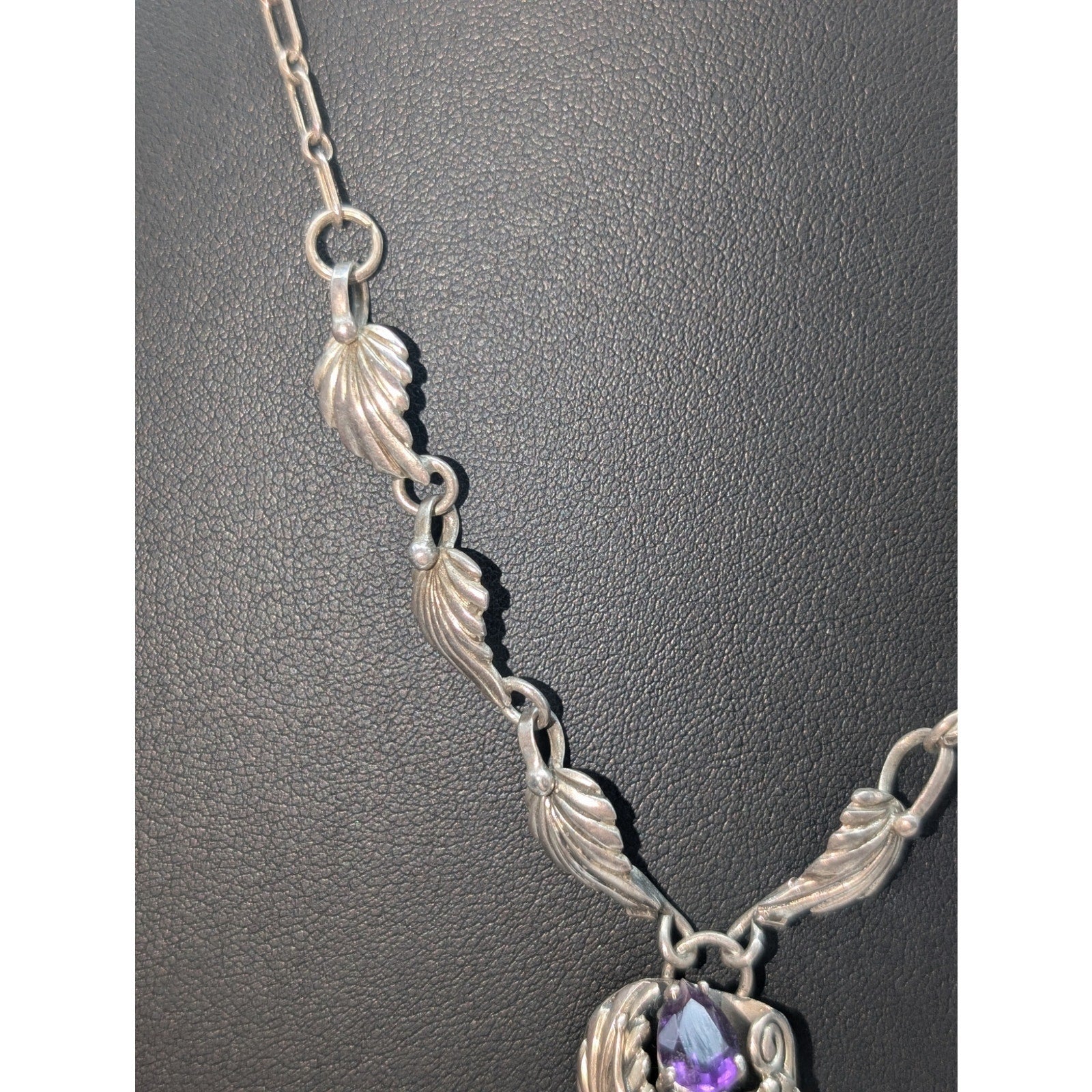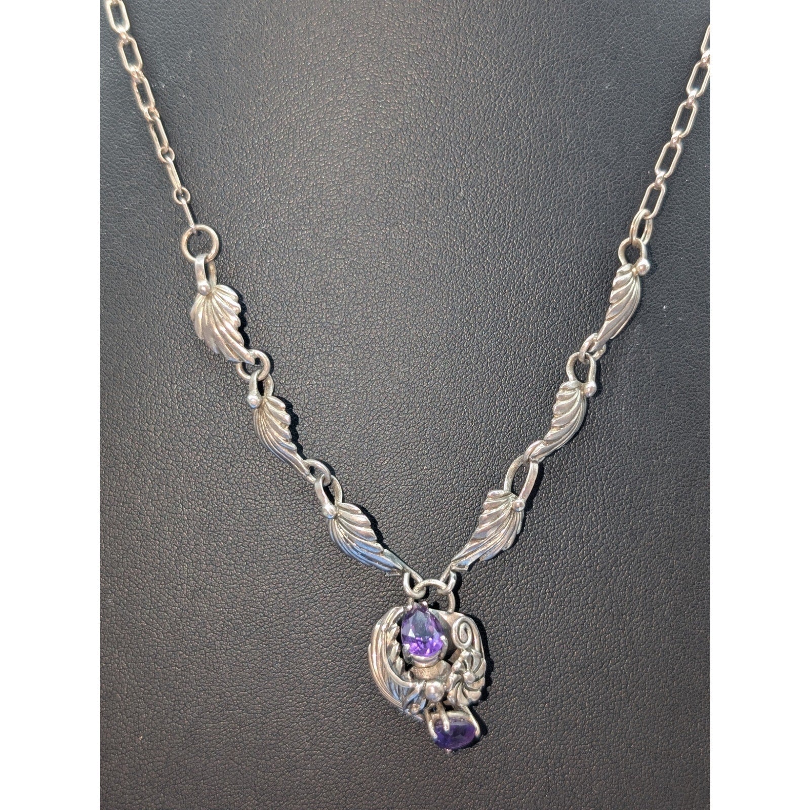 Vintage 925 Sterling Silver Purple Gemstone Leaf Flower Design 20" Necklace. Pre-owned, this necklace is in excellent vintage condition. Marked sterling, it appears if there were other markings on the main pendant that they have faded. One gemstone tests in the tourmaline area and the other does register as an amethyst. Gorgeous. No lowball offers, please.