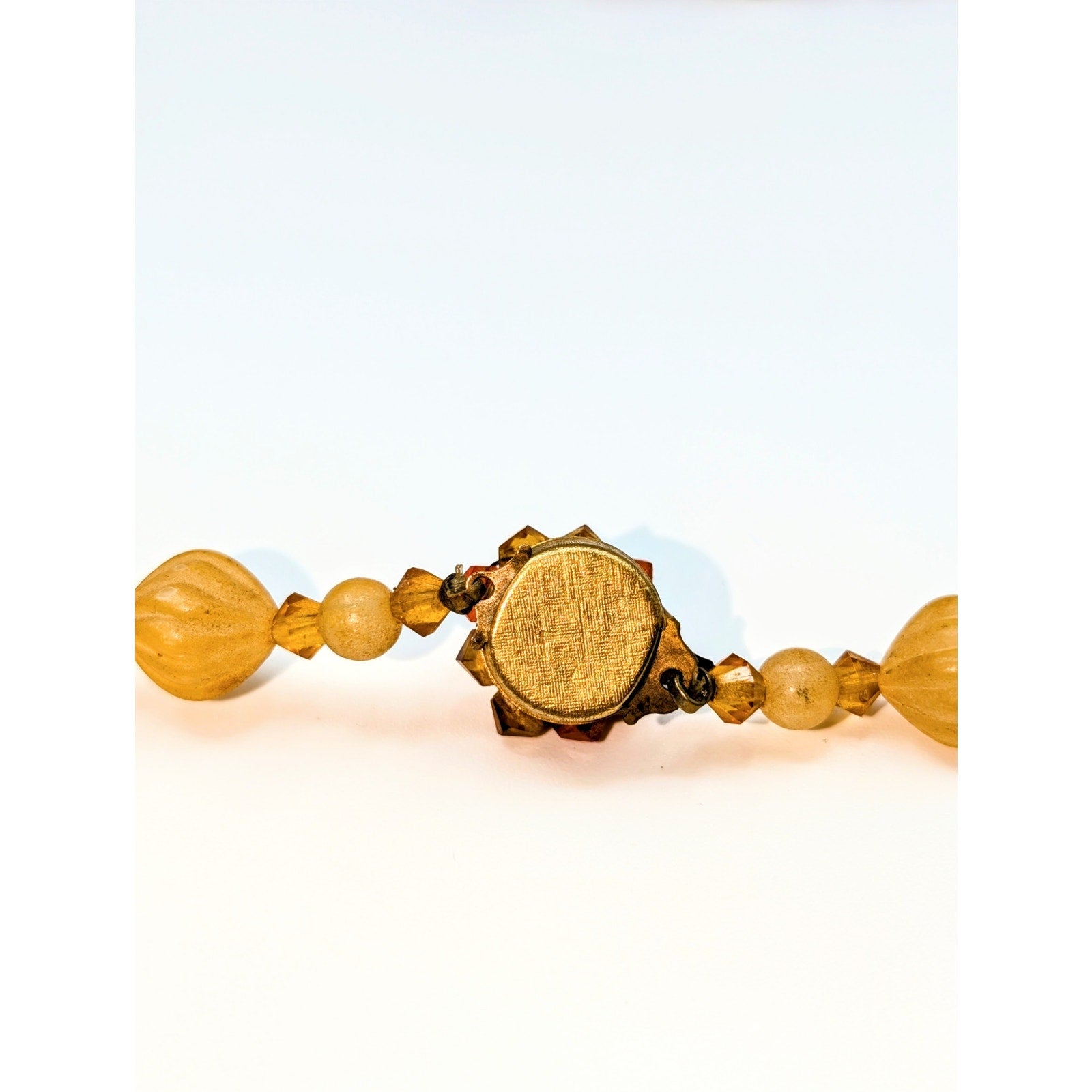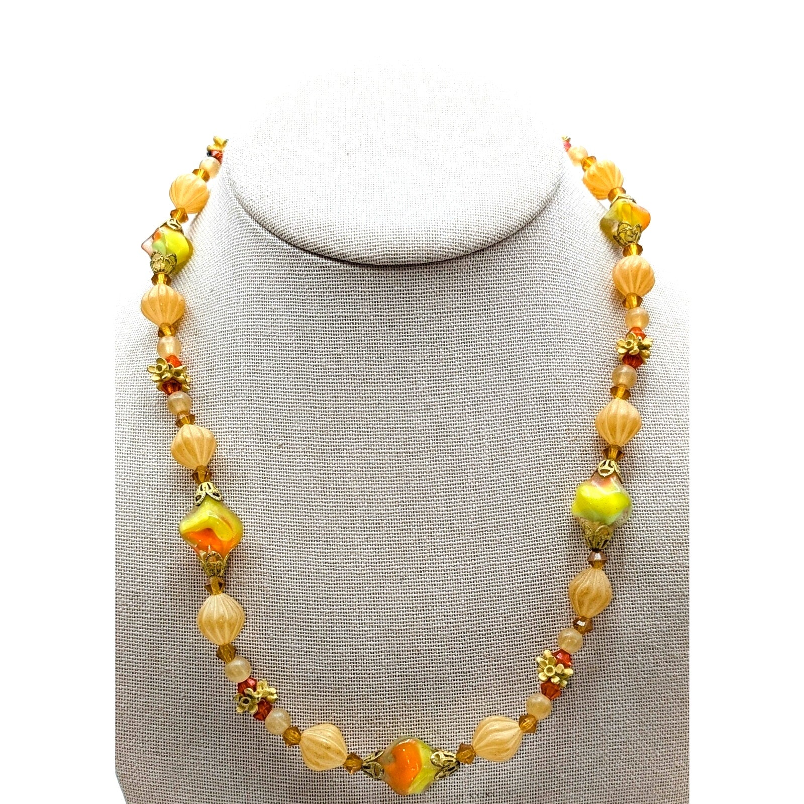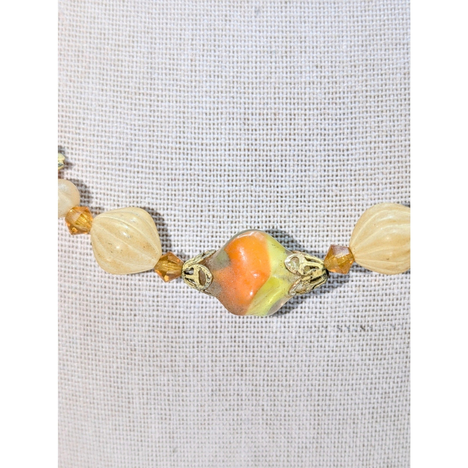 Vintage/Antique Yellow Orange Cream Glass Bead 18" Necklace. I'm not sure the era of this necklace, but it is in wonderful condition for its age. Has some weight because of the glass beads. Really pretty. Clasp works well. Pre-owned, this necklace is in great vintage condition. I can't find any signature on it.
