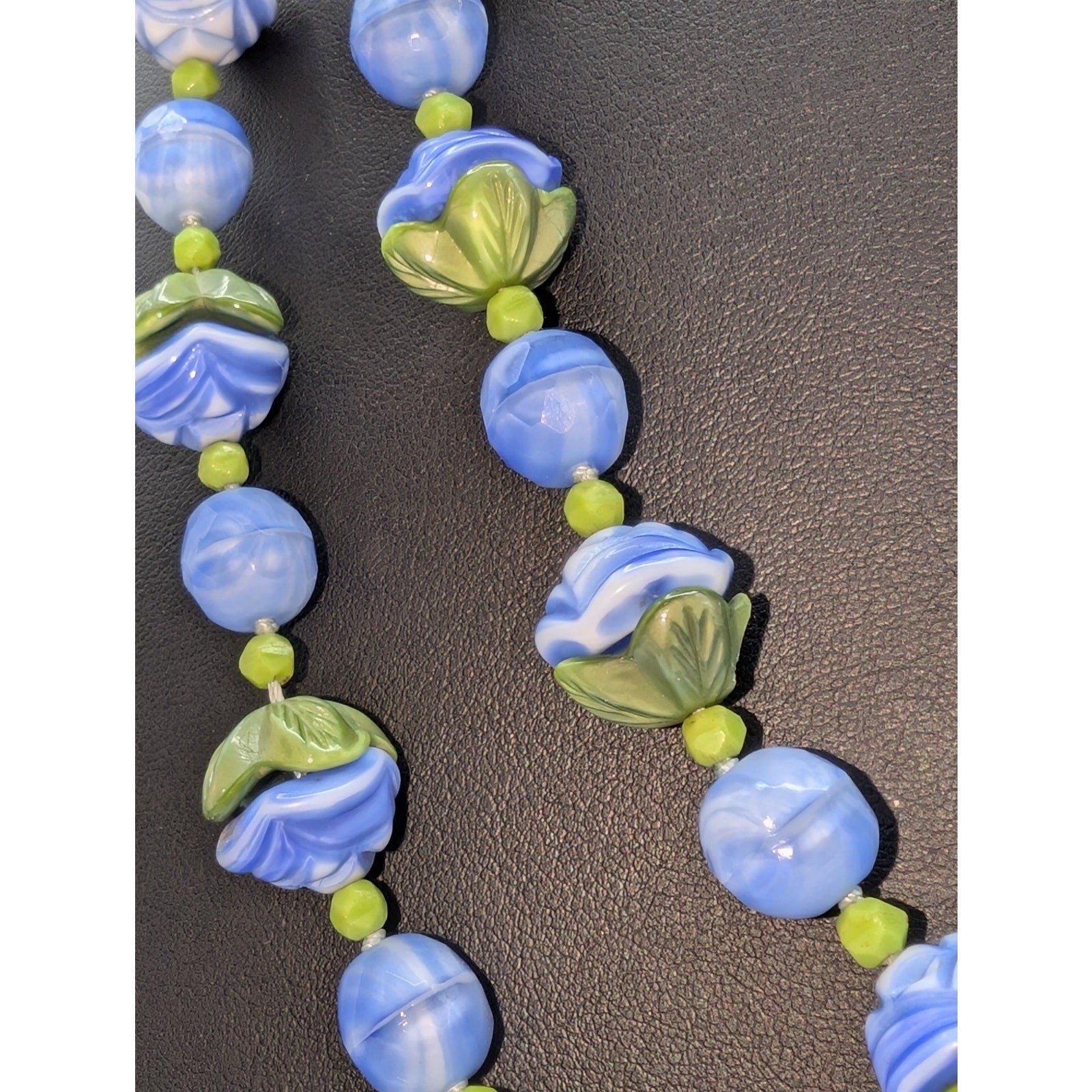 Vintage Art Deco Blue Green Slag Glass Flower Bead Long 50" Necklace. Pre-owned, this necklace is in good vintage condition. I counted at least 6 green petal beads that were damaged. You can see what I'm talking about in photo five. Other than that, this necklace is in great condition. Approximately 50" long. Really pretty. Whimsical art deco molded flower beads of slag glass.
