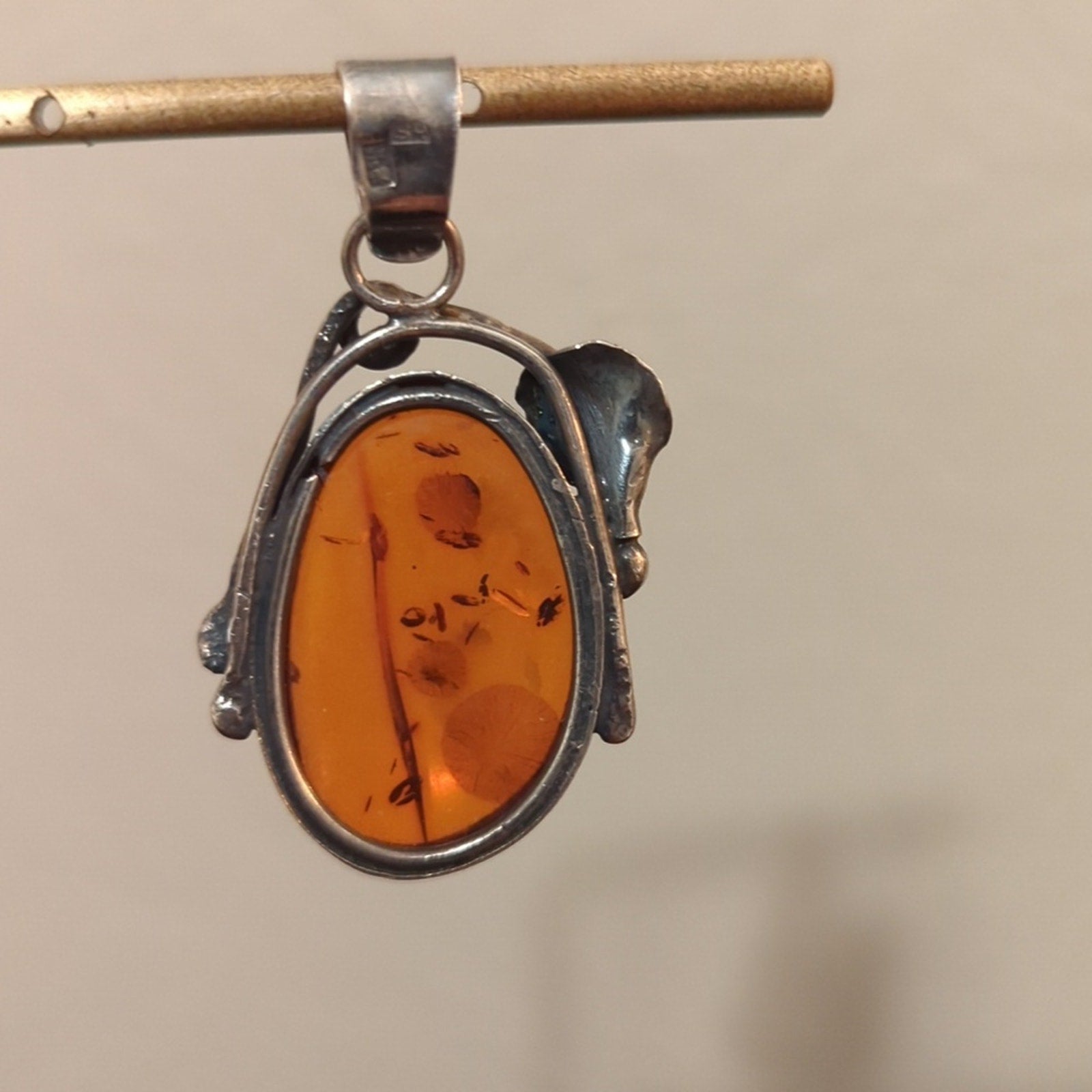 Vintage Art Nouveau Sterling 925 Real Warsaw Polish Amber Designer SR Pendant