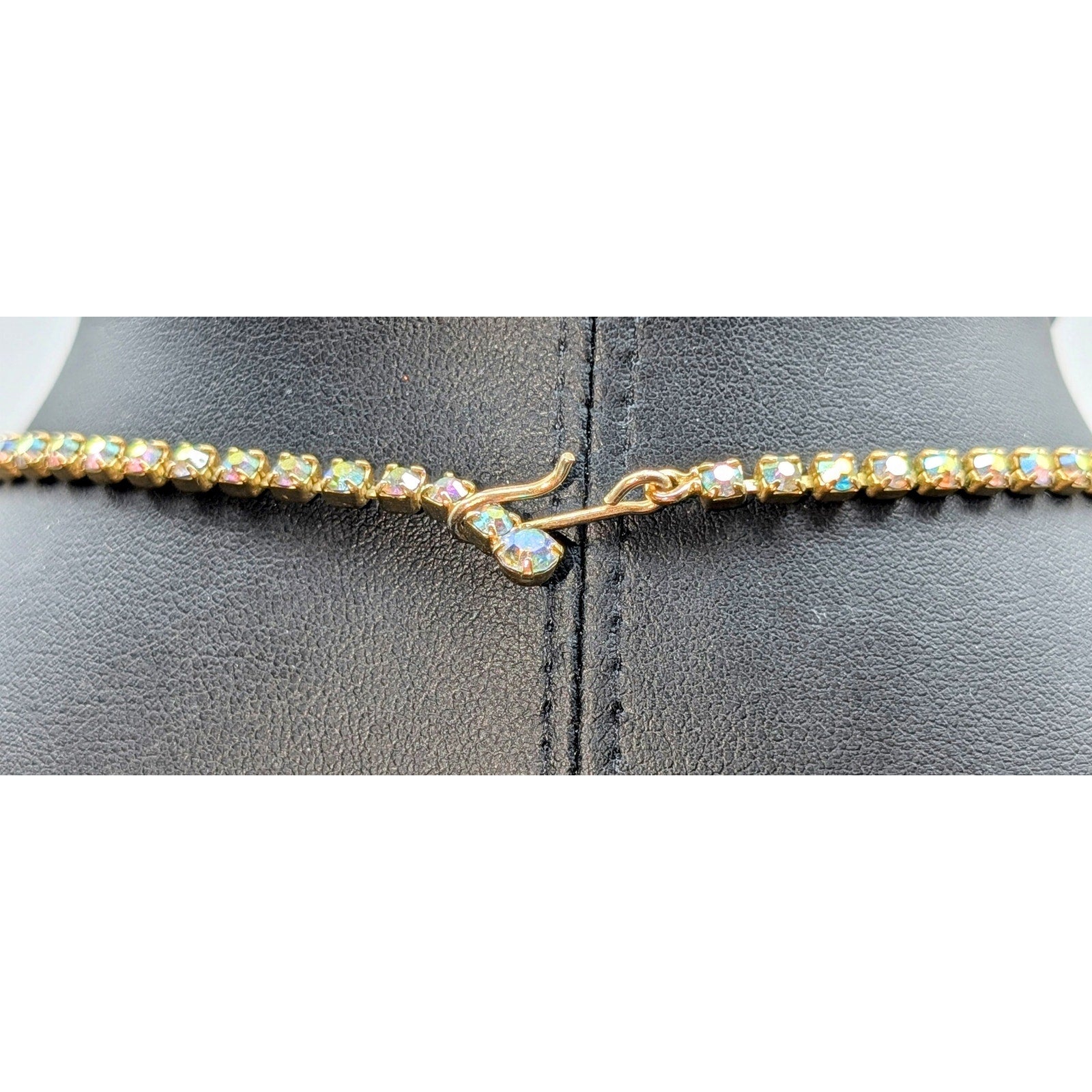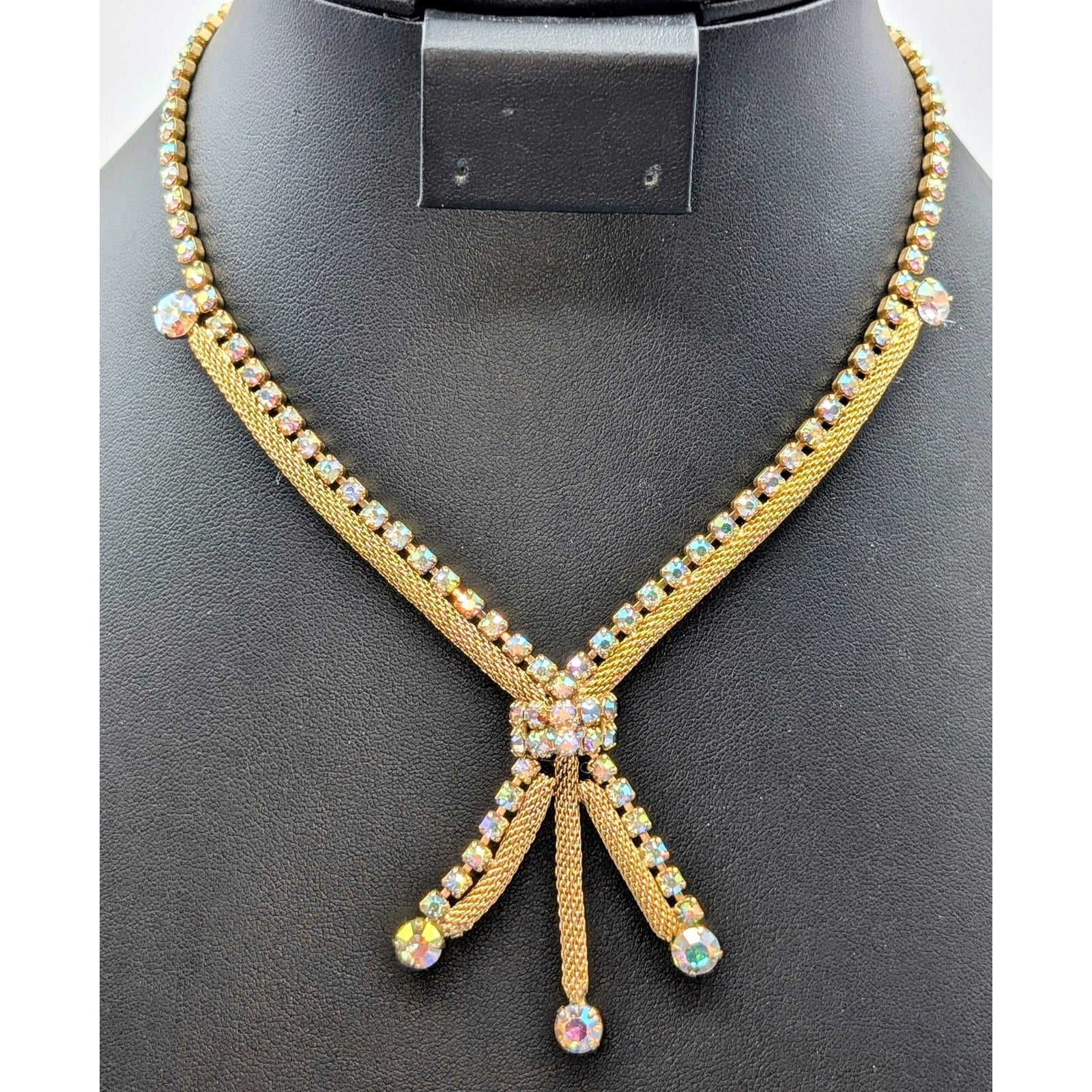 Vintage Aurora Borealis Rhinestone Gold Tone Mesh Tassel 15" Necklace. Pre-owned, this necklace is in excellent vintage condition.