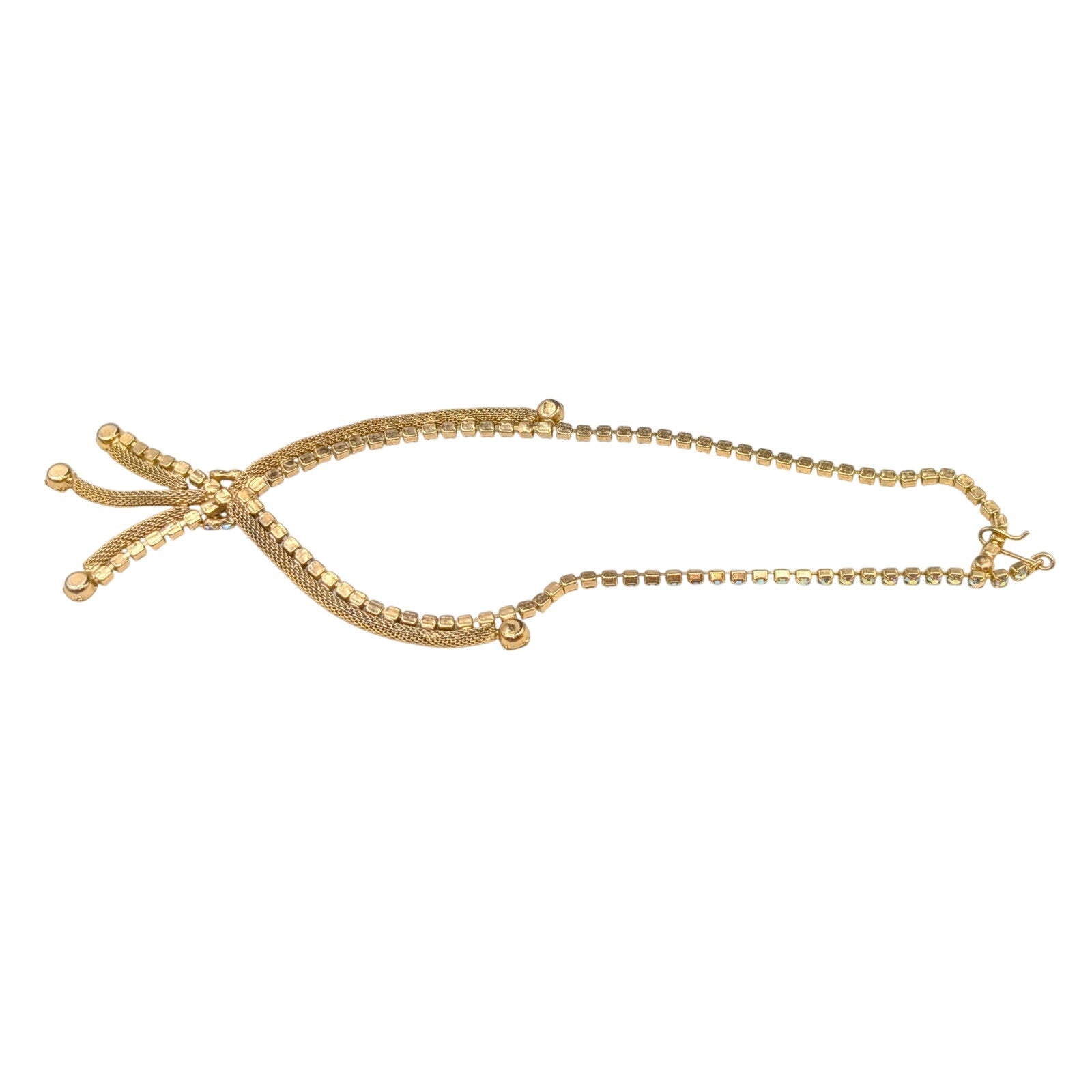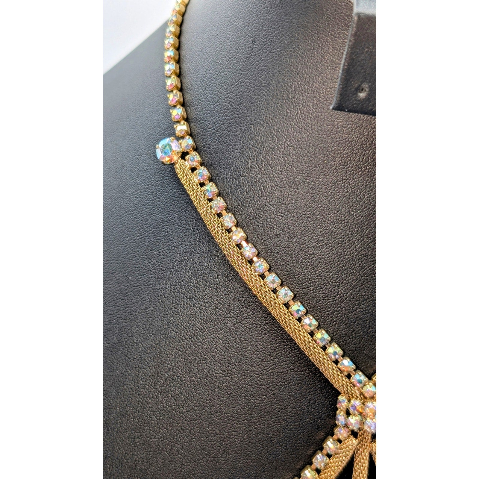 Vintage Aurora Borealis Rhinestone Gold Tone Mesh Tassel 15" Necklace