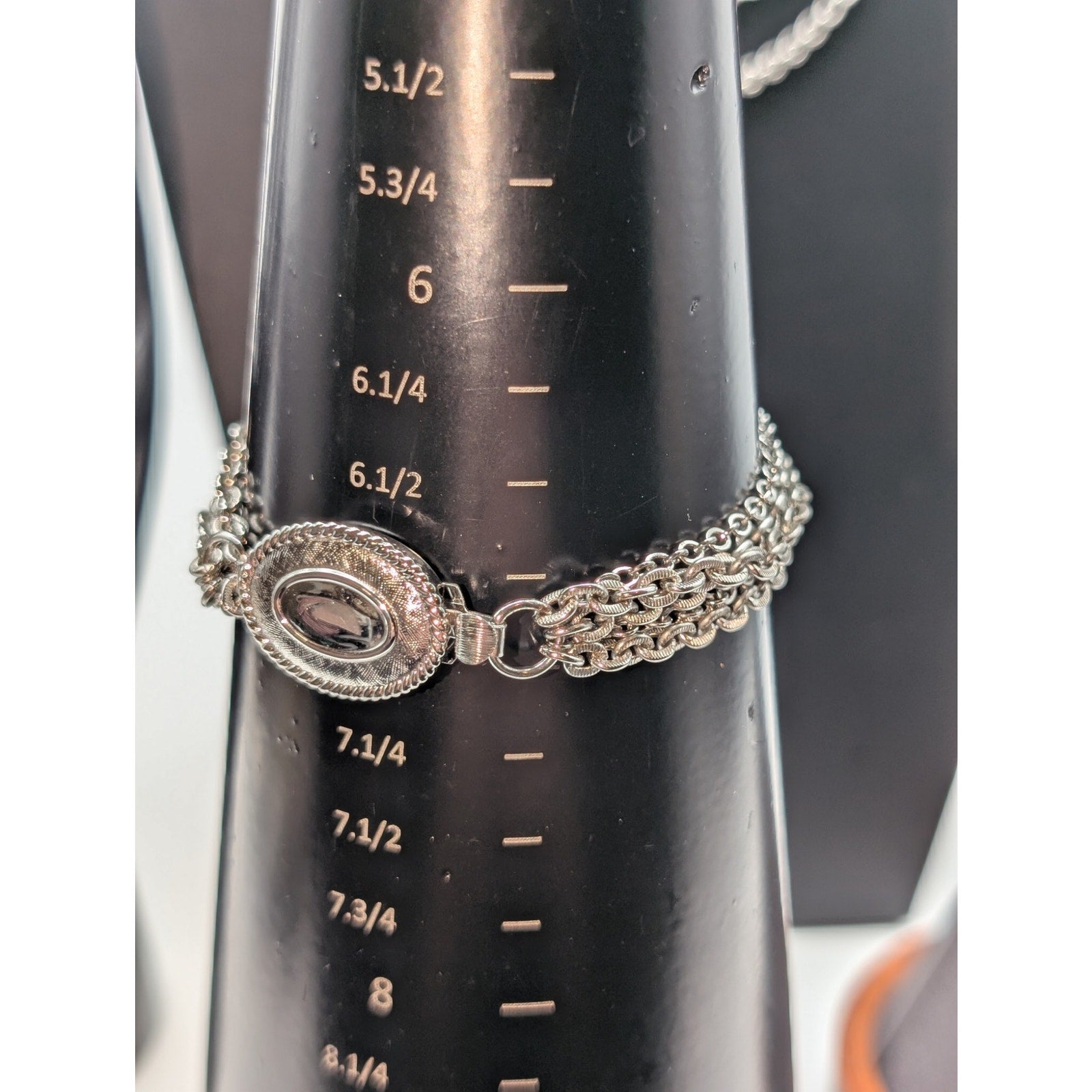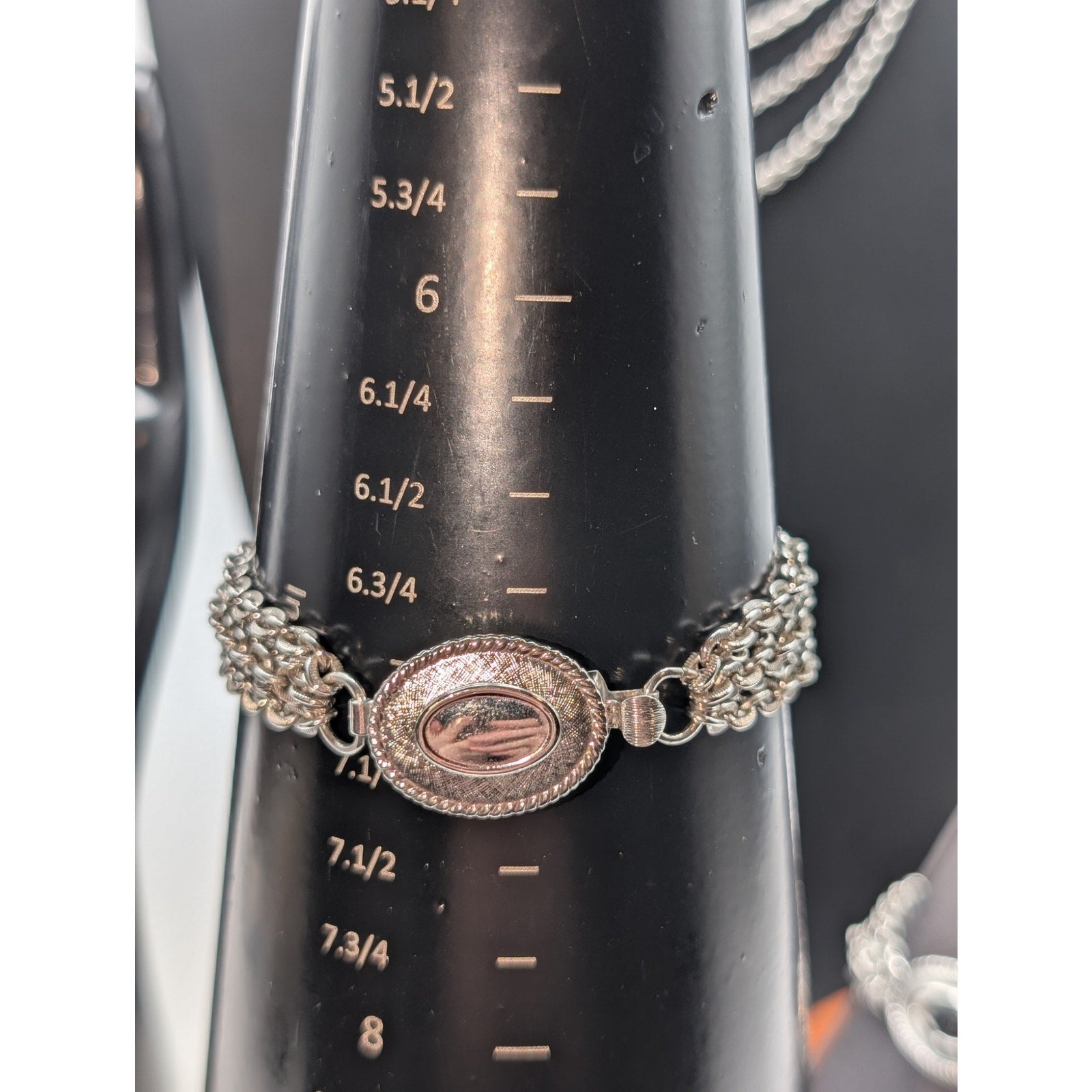 Vintage Avon Silver Tone 7 Strand Chain Necklace & Two Bracelet Set. Fancy slide in clasp on each piece. Necklace measures 18". Use the extra bracelet to make it much longer and show the clasp on the side. Have fun! Pre-owned, this necklace and two bracelet set is in excellent vintage condition.
