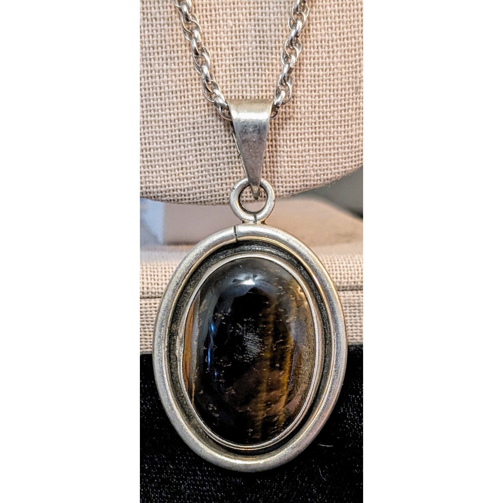 Vintage Barton Allen Ballou Sterling Double Rolo Chain W/ Mexico Taxco 925 Silver Bezel Set Tigers Eye. Pre-owned, this large pendant necklace is in excellent condition. Some slight scuffing on the face of the stone as seen in photos. Solid. Chain measures 24" long.