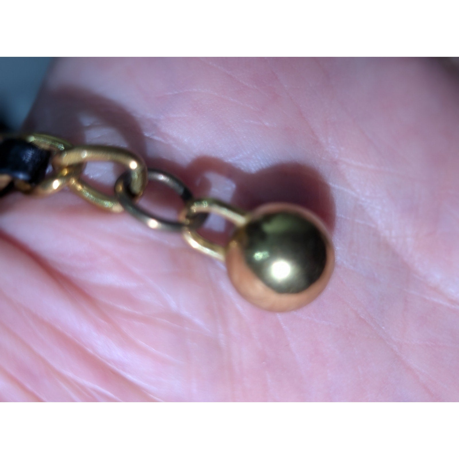 Vintage Black Leather Look Woven Through Gold Tone Chain 46" Belt. Pre-owned, this belt is in excellent condition. Slide quilted gold tone fob up and down to adjust belt. Measures 46" from end to end.