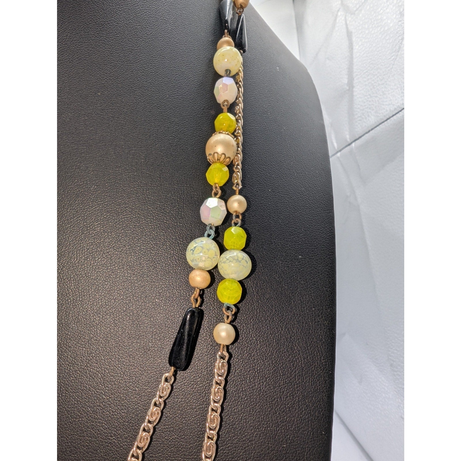 Vintage Black Yellow Cream White Beaded Station Chain Long 60" Necklace