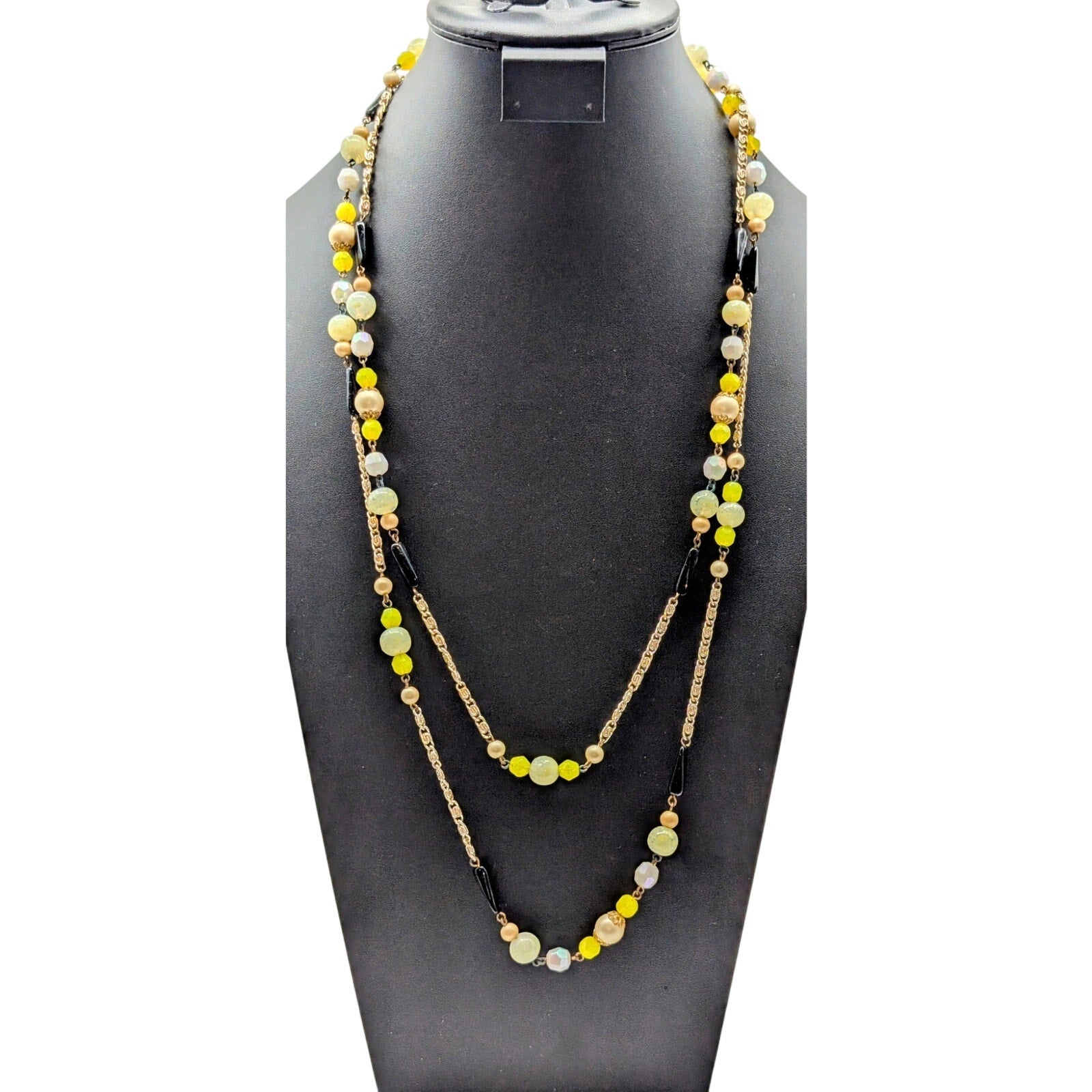Vintage Black Yellow Cream White Beaded Station Chain Long 60" Necklace. Great for doubling. Pre-owned, this necklace is in good vintage condition with some signs of wear, mainly on some of the pearl look beads.