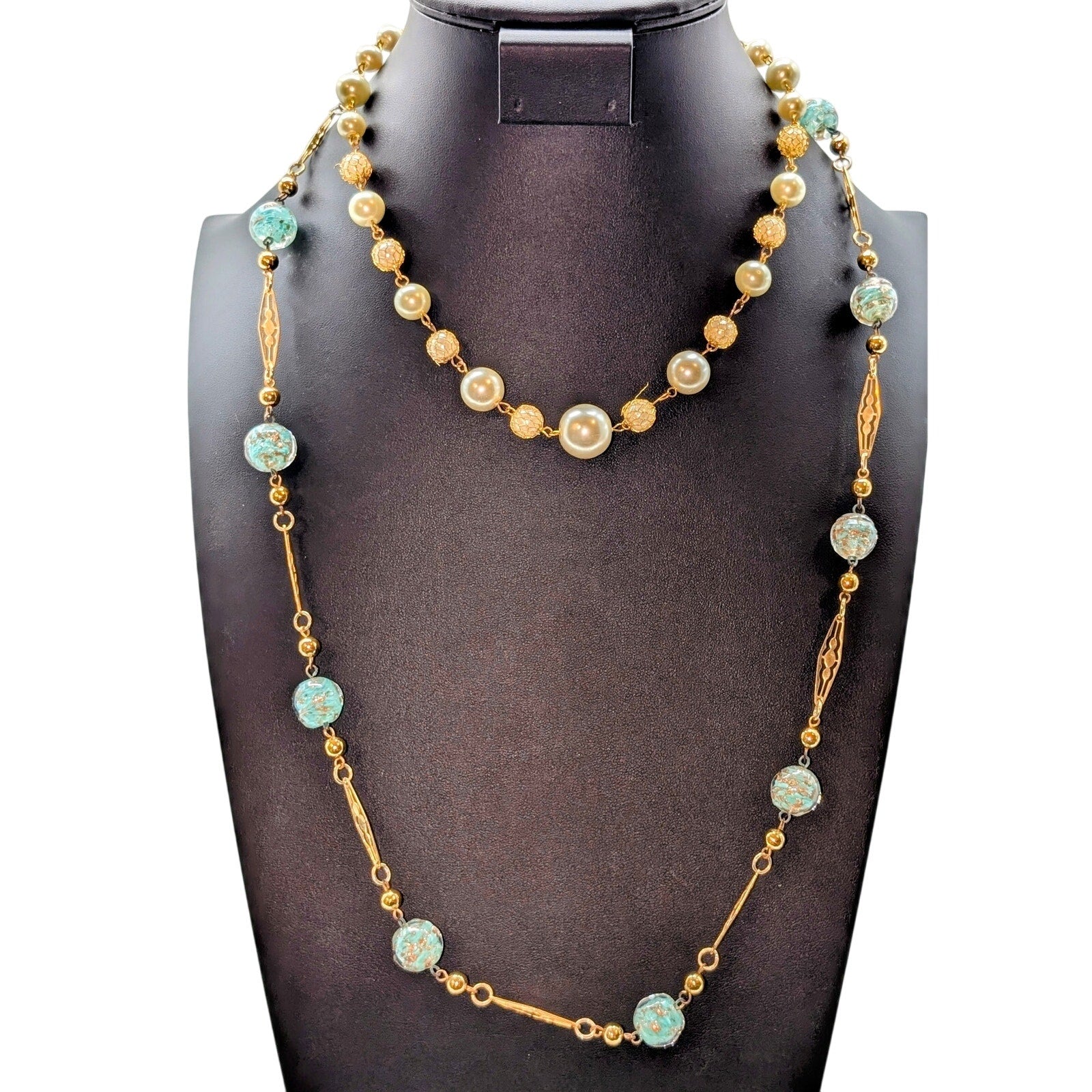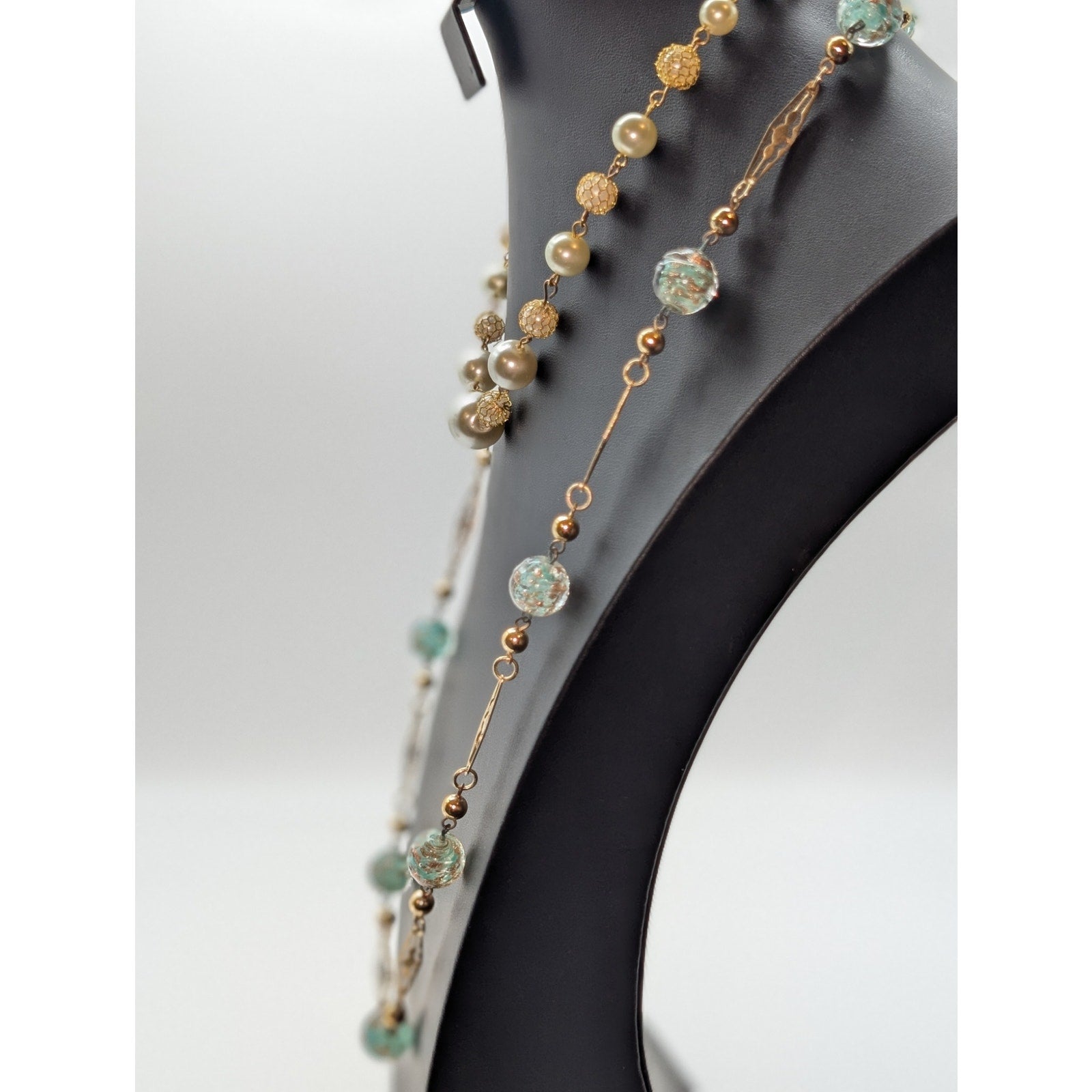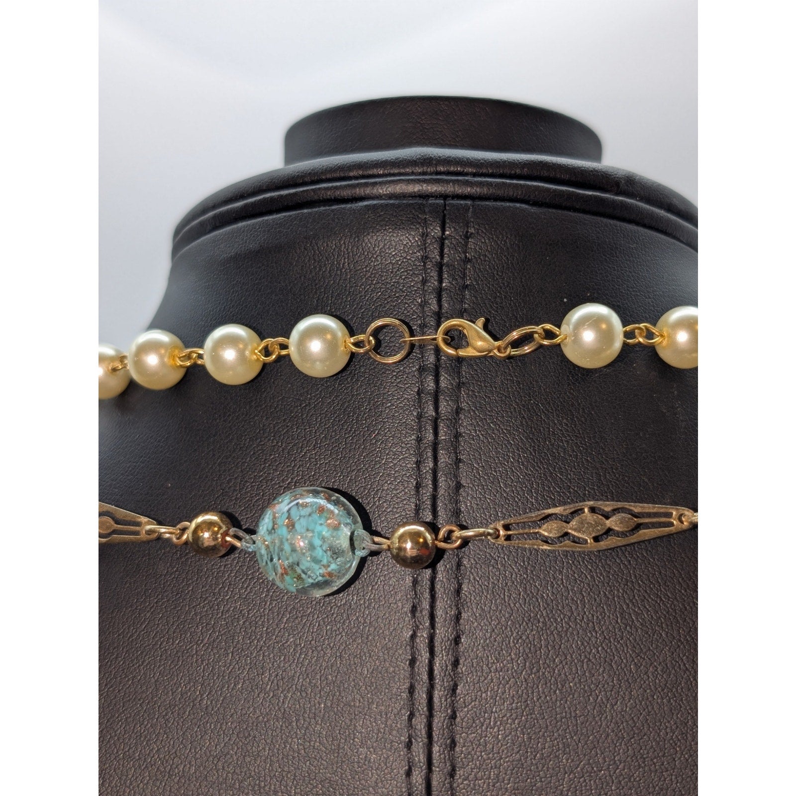 Vintage Blue Gold Glitter Glass Lampwork Pearl Gold Tone Chain Necklace Lot. Pre-owned, this lot of two necklaces work perfectly together or can be worn along. They are both in great vintage condition.