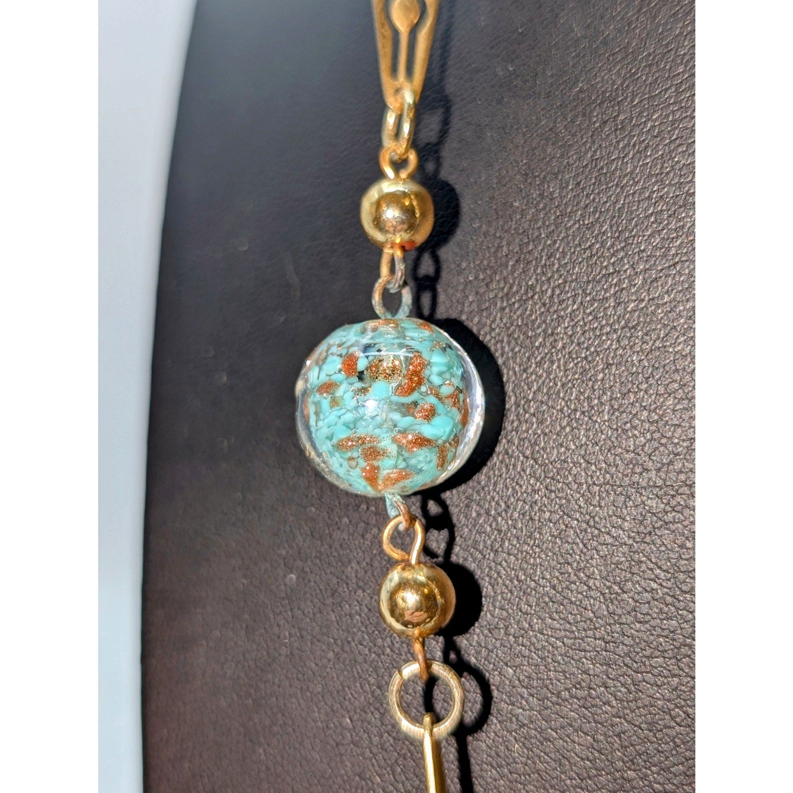 Vintage Blue Gold Glitter Glass Lampwork Pearl Gold Tone Chain Necklace Lot
