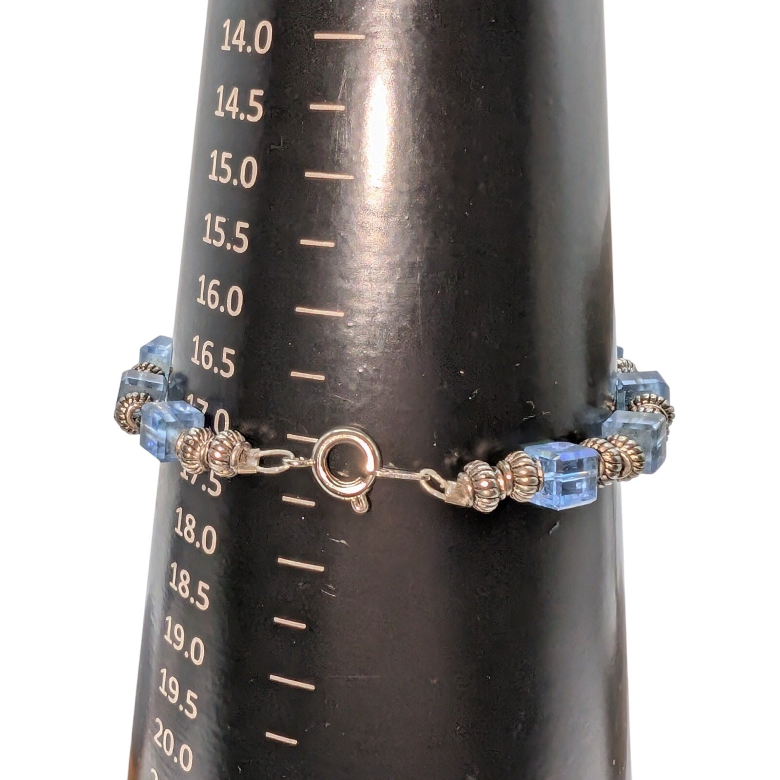 Vintage Blue Square Glass AB Crystal & Silver Tone Bead Bracelet. Pre-owned, this bracelet is in excellent condition.